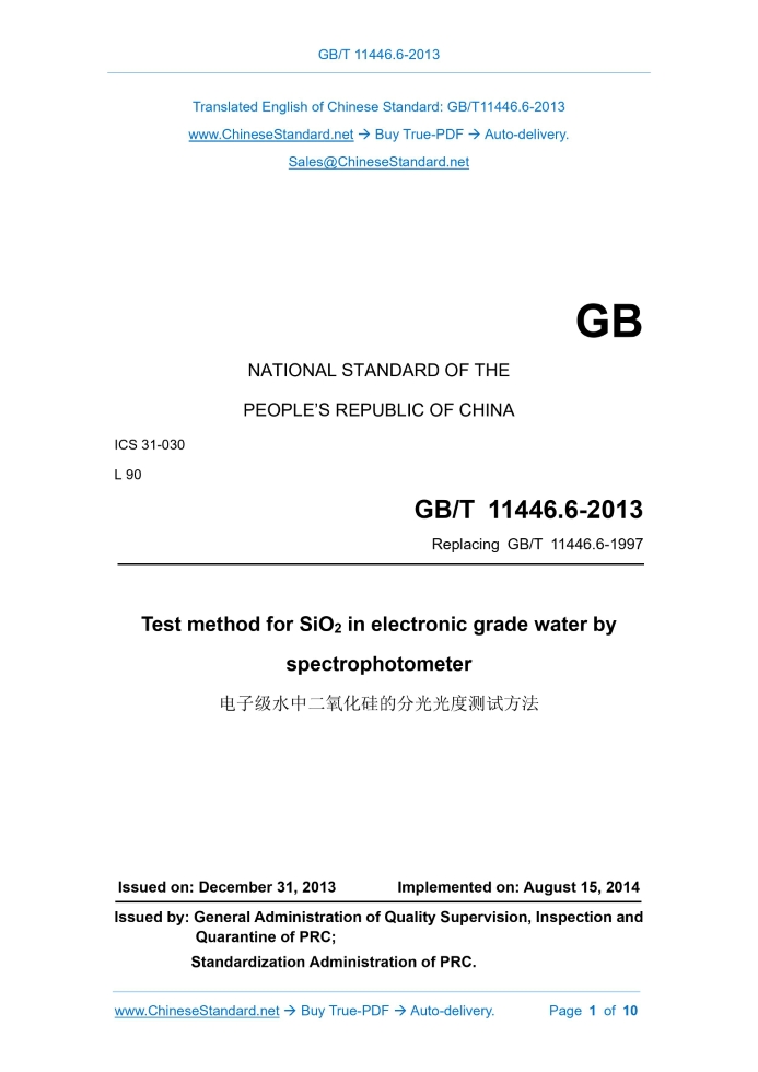 GB/T 11446.6-2013: Test method for SiO2 in electronic grade water by spectrophotometer Delivery: 9 seconds. True-PDF full-copy in English & invoice will be downloaded + auto-delivered via email. See step-by-step procedure Status: Valid GB/T 11446.6: Historical versions