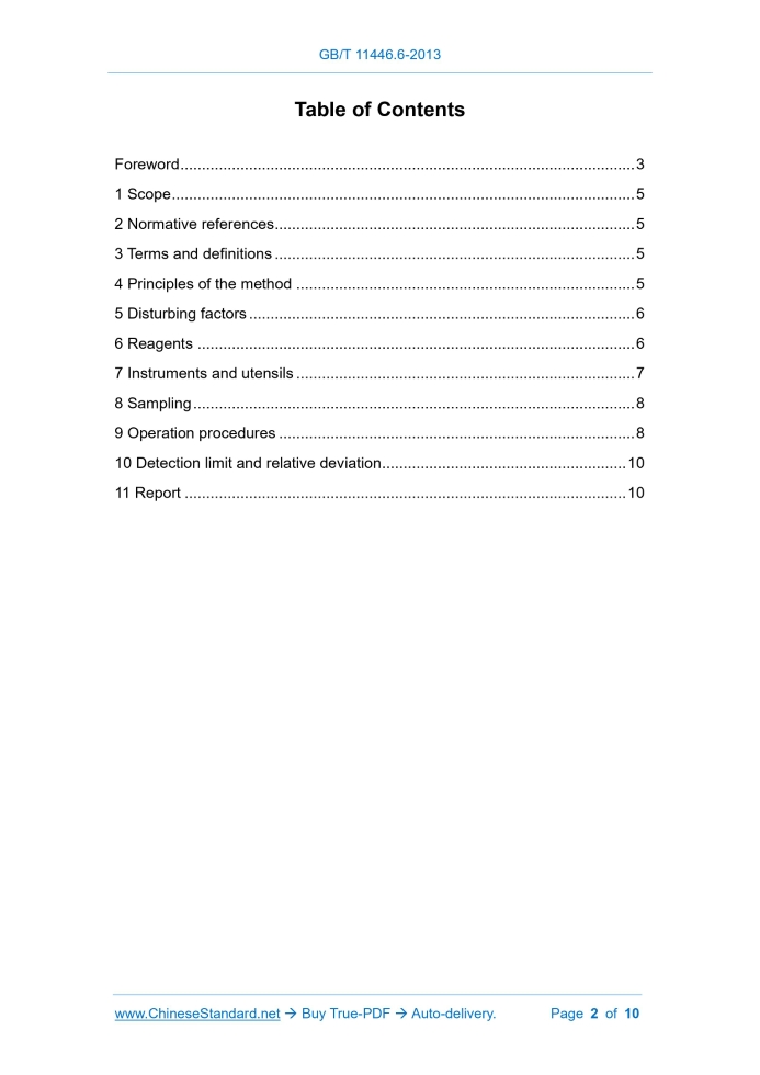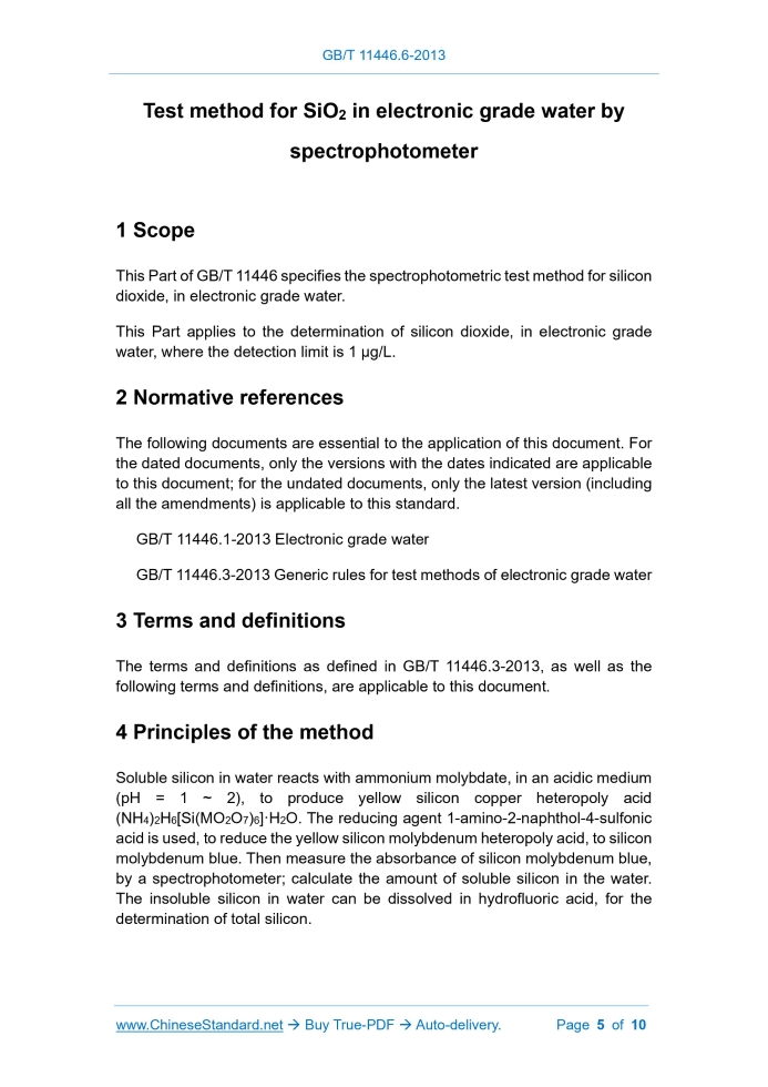 Similar standardsGB/T 11446.6-2013: Test method for SiO2 in electronic grade water by spectrophotometer---This is an excerpt. Full copy of true-PDF in English version (including equations, symbols, images, flow-chart, tables, and figures etc.), auto-downloaded/delivered in 9 seconds, can be purchased online: https://www.ChineseStandard.net/PDF.aspx/GBT11446.6-2013GB NATIONAL STANDARD OF THE PEOPLE’S REPUBLIC OF CHINA ICS 31-030 L 90 Replacing GB/T 11446.6-1997 Test method for SiO2 in electronic grade water by Issued on. DECEMBER 31, 2013 Implemented on. AUGUST 15, 2014 Issued by. General Administration of Quality Supervision, Inspection and Quarantine of PRC; Standardization Administration of PRC. Table of ContentsForeword... 3 1 Scope... 5 2 Normative references... 5 3 Terms and definitions... 5 4 Principles of the method... 5 5 Disturbing factors... 6 6 Reagents... 6 7 Instruments and utensils... 7 8 Sampling... 8 9 Operation procedures... 8 10 Detection limit and relative deviation... 10 11 Report... 10ForewordThe expected structure of GB/T 11446 is as follows. - GB/T 11446.1 Electronic grade water; - GB/T 11446.2 (To be determined); - GB/T 11446.3 Generic rules for test methods of electronic grade water; - GB/T 11446.4 Test method for resistivity of electronic grade water; - GB/T 11446.5 Test method for measuring trace metals in electronic grade water by atomic absorption spectrophotometry; - GB/T 11446.6 Test method for SiO2 in electronic grade water by spectrophotometer; - GB/T 11446.7 Test method for trace anion in electronic grade water by ion chromatography; - GB/T 11446.8 Test method for total organic carbon in electronic grade water; - GB/T 11446.9 Test method for particles in electronic grade water by instrument; - GB/T 11446.10 Test method for total bacterial count in electronic grade water by membrane filters. This part is Part 6 of GB/T 11446. This part was drafted in accordance with the rules given in GB/T 1.1-2009. This part replaces GB/T 11446.6-1997 "Test method for SiO2 in electronic grade water by spectrophotometer". Compared with GB/T 11446.6-1997, this Part mainly has the following changes. - MODIFY "9 Disturbing factors" to "5 Disturbing factors" (see Chapter 5); - In "Drawing of the working curve", according to the silica content in the water sample to be tested, clearly DIVIDE the working curve into two groups (see 9.1.1 and 9.1.2); - ADD that "Make two independent determinations of water samples; take the average value" (see 9.3.3). This Part was proposed by the Ministry of Industry and Information Technology of the People's Republic of China. This Part shall be under the jurisdiction of China Electronic Technology Standardization Institute. Drafting organizations of this Part. Special Material Quality Supervision and Inspection Center of the Ministry of Information Industry, Institute of Semiconductors of Chinese Academy of Sciences, China Electronics Standardization Institute, 46th Research Institute of China Electronics Technology Group Corporation. The main drafters of this Part. Wang Yi, Chu Lianqing, He Xiukun, Duan Shuguang, Ti Liuwang, Liu Yun. This standard replaces the standard previously issued as follows. - GB/T 11446.6-1989, GB/T 11446.6-1997. Test method for SiO2 in electronic grade water by spectrophotometer1 ScopeThis Part of GB/T 11446 specifies the spectrophotometric test method for silicon dioxide, in electronic grade water. This Part applies to the determination of silicon dioxide, in electronic grade water, where the detection limit is 1 μg/L.2 Normative referencesThe following documents are essential to the application of this document. For the dated documents, only the versions with the dates indicated are applicable to this document; for the undated documents, only the latest version (including all the amendments) is applicable to this standard. GB/T 11446.1-2013 Electronic grade water3 Terms and definitionsThe terms and definitions as defined in GB/T 11446.3-2013, as well as the following terms and definitions, are applicable to this document.4 Principles of the methodSoluble silicon in water reacts with ammonium molybdate, in an acidic medium (pH = 1 ~ 2), to produce yellow silicon copper heteropoly acid (NH4)2H6[Si(MO2O7)6]·H2O.5 Disturbing factors5.1 Phosphate and arsenate, etc. generate the corresponding blue heteropoly acid, under the measurement conditions. The oxalic acid, tartaric acid and other hydroxy acids can be used, to eliminate the interference from arsenic and phosphorus. 5.4 The water sample shall be analyzed as soon as possible. The longer the storage time, the greater the possibility of contamination.6 Reagents6.1 Blank water EW-I electronic grade water, which is specified in GB/T 11446.1-2013. 6.2 Silicon standard solution 6.3 Ammonium molybdate solution (100 g/L) The analytically pure ammonium molybdate is purified by two recrystallizations. 6.4 Oxalic acid solution or tartaric acid or citric acid solution (100 g/L) Weigh 100 g of oxalic acid or tartaric acid or citric acid. Dissolve it in 500 mL water. Use water to dilute to 1 L (if the solution is turbid, filter it). Store it in a polyethylene bottle. 6.5 1-Amino-2-naphthol-4-sulfonic acid reducing agent solution Weigh 1.5 g of 1-amino-2-naphthol-4-sulfonic acid AND 7 g of anhydrous sodium sulfite. Dissolve it in 200 mL of water. 6.6 Hydrochloric acid (1+1) Hydrochloric acid, which is purified by distillation or absorption. 6.7 Hydrofluoric acid (1+99) Hydrofluoric acid, which is purified by a platinum distiller. 6.8 Boric acid solution Saturated solution, which is prepared by boric acid, after purified by recrystallization.7 Instruments and utensils7.1 Spectrophotometer. The working wavelength is 200 nm ~ 1000 nm; the wavelength accuracy is ±1.5 nm; the transmittance range is 0 ~ 100%; the transmittance repeatability is ±0.5%; the absorbance measurement range is 0.04 ~ 2; the cuvette is 1 cm, 2 cm, 5 cm, 10 cm. 7.5 Polyethylene bottle (cup). 100 mL, 1000 mL