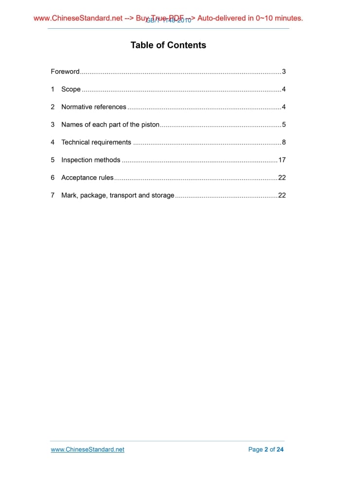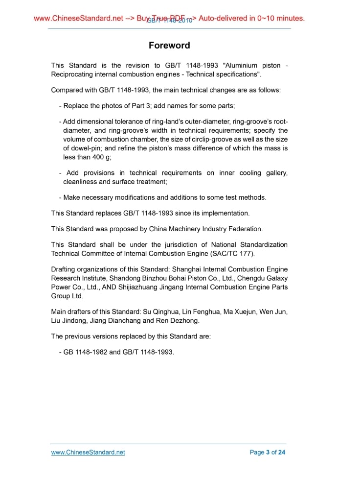 Similar standardsGB/T 1148-2010: Internal combustion engines - Aluminium pistons - Specifications---This is an excerpt. Full copy of true-PDF in English version (including equations, symbols, images, flow-chart, tables, and figures etc.), auto-downloaded/delivered in 9 seconds, can be purchased online: https://www.ChineseStandard.net/PDF.aspx/GBT1148-2010GB NATIONAL STANDARD OF THE PEOPLE'S REPUBLIC OF CHINA ICS 27.020 J 92 Replacing GB/T 1148-1993 Internal combustion engines – Aluminium pistons - Specifications Issued on: NOVEMBER 10, 2010 Implemented on: MARCH 1, 2011 Issued by. General Administration of Quality Supervision, Inspection and Quarantine; Standardization Administration of China. Table of ContentsForeword... 3 1 Scope... 4 2 Normative references... 4 3 Names of each part of the piston... 5 4 Technical requirements... 8 5 Inspection methods... 17 6 Acceptance rules... 22 7 Mark, package, transport and storage... 22ForewordThis Standard is the revision to GB/T 1148-1993 "Aluminium piston - Reciprocating internal combustion engines - Technical specifications". Compared with GB/T 1148-1993, the main technical changes are as follows. - Replace the photos of Part 3; add names for some parts; - Add dimensional tolerance of ring-land’s outer-diameter, ring-groove’s root- diameter, and ring-groove’s width in technical requirements; specify the volume of combustion chamber, the size of circlip-groove as well as the size of dowel-pin; and refine the piston’s mass difference of which the mass is less than 400 g; - Add provisions in technical requirements on inner cooling gallery, cleanliness and surface treatment; - Make necessary modifications and additions to some test methods. This Standard replaces GB/T 1148-1993 since its implementation. This Standard was proposed by China Machinery Industry Federation. This Standard shall be under the jurisdiction of National Standardization Technical Committee of Internal Combustion Engine (SAC/TC 177). Drafting organizations of this Standard. Shanghai Internal Combustion Engine Research Institute, Shandong Binzhou Bohai Piston Co., Ltd., Chengdu Galaxy Power Co., Ltd., AND Shijiazhuang Jingang Internal Combustion Engine Parts Group Ltd. Main drafters of this Standard. Su Qinghua, Lin Fenghua, Ma Xuejun, Wen Jun, Liu Jindong, Jiang Dianchang and Ren Dezhong. The previous versions replaced by this Standard are. - GB 1148-1982 and GB/T 1148-1993. Internal combustion engines – Aluminium pistons - Specifications1 ScopeThis Standard specifies the internal combustion engine casting aluminium piston’s each part’s name, technical requirements, test methods, inspection rules, mark, package, transport and storage. This Standard is applicable to reciprocating-piston internal combustion engine casting aluminium piston of which the cylinder diameter is not greater than 200 mm (hereinafter referred to as piston).2 Normative referencesThe following referenced documents are indispensable for the application of this Standard. For dated references, only the edition cited applies. For undated references, the latest edition of the referenced document (including any amendments) applies. However, the parties who enter into agreement based on this Standard are encouraged to investigate whether the latest versions of these documents are applicable. For undated reference documents, the latest versions apply to this Standard. GB/T 228 Metallic materials - Tensile testing at ambient temperature (GB/T 228-2002, eqv ISO 6892.1998) GB/T 893.1 Circlips for holes - Type A GB/T 893.2 Circlips for holes - Type B GB/T 1149.1 Internal combustion engines - Piston rings - Part 1.General specifications (GB/T 1149.1-2008, ISO 6621-4.2003) GB/T 1800.1-2009 Geometrical product specifications (GPS) - Limits and fits - Part 1.Bases of tolerances deviations and fits (ISO 286-1.1988,MOD) GB/T 1958-2004 Geometrical product Specifications (GPS) - Geometrical tolerance - Verification prescription GB/T 2828.1 Sampling procedures for inspection by attribute - Part 1. Sampling schemes indexed by acceptance mass limit (AQL) for lot-by-lot inspection (GB/T 2828.1-2003, ISO 2859-1.1999, IDT) 17f Lower side face angle of keystone ring-groove 33 Wear-resistant ring carrier 18 Combustion chamber 34 Serrated top lands 18a Inner diameter of combustion chamber 35 Oil accumulation groove 18b Outer diameter (also known as throat) of combustion chamber 36 Scrape oil groove 18c Depth of combustion chamber 37 Steel control strut 19 Inner cooling gallery 38 Oil drain hole 20 Pin-bore 39 Decompression cavity 21 Pin-bore axis 40 Drain hole on the pin boss 22 Upper pin boss 41 Transverse slot hole 23 Lower pin boss 42 Transverse slot 24 Pin-bore sleeve 43 Longitudinal slot 25 Circlip-groove 44 Longitudinal slot hole 25a Circlip grooves distance 45 Located pin 25b Bottom diameter of circlip groove 46 Notch for circlip 25c Width of circlip-groove 47 Skirt scavenging gas zone 26 Pin boss draft angle 48 Skirt notch 27 Pin boss gap 49 Rib 28 Outlet of cooling gallery 50 Center hole 4.5.3 The diameter tolerance of pin-bore shall comply with the following provisions. a) When diameter of pin-bore is greater than 18 mm, its diameter tolerance shall comply with IT5 specified by GB/T 1800.1; when diameter of pin- bore is not greater than 18 mm, its diameter tolerance shall be IT6. b) The diameter of piston pin-bore shall be divided into groups according to the minimum size. The groups shall be represented by 1, 2, 3,... and ordered from the minimum size to the maximum one. The pin-bore of which the diameter tolerance is less than 0.01 mm shall not be divided into groups. 4.5.4 Compression height tolerance. gasoline machining piston on crown- surface is 0.2 mm; diesel machining piston is 0.1 mm; non-gasoline machining piston on crown-surface is 0.4 mm. 4.5.5 Tolerance of ring-groove width. the width tolerance of parallel ring-groove is 0.03 mm; the width tolerance of keystone ring-groove is 0.02 mm. 4.6 Shape 