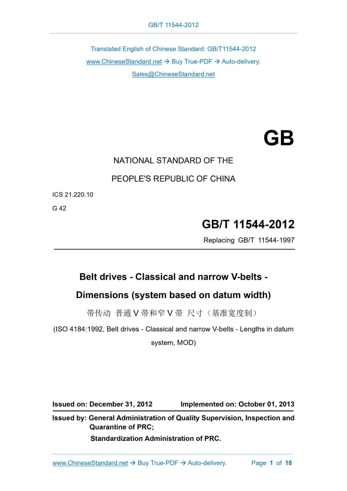 GB/T 11544-2012: Belt drives -- Classical and narrow V-belts -- Dimensions (system based on datum width) Delivery: 9 seconds. True-PDF full-copy in English & invoice will be downloaded + auto-delivered via email. See step-by-step procedure Status: Valid GB/T 11544: Historical versions