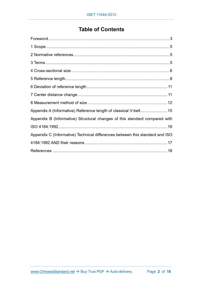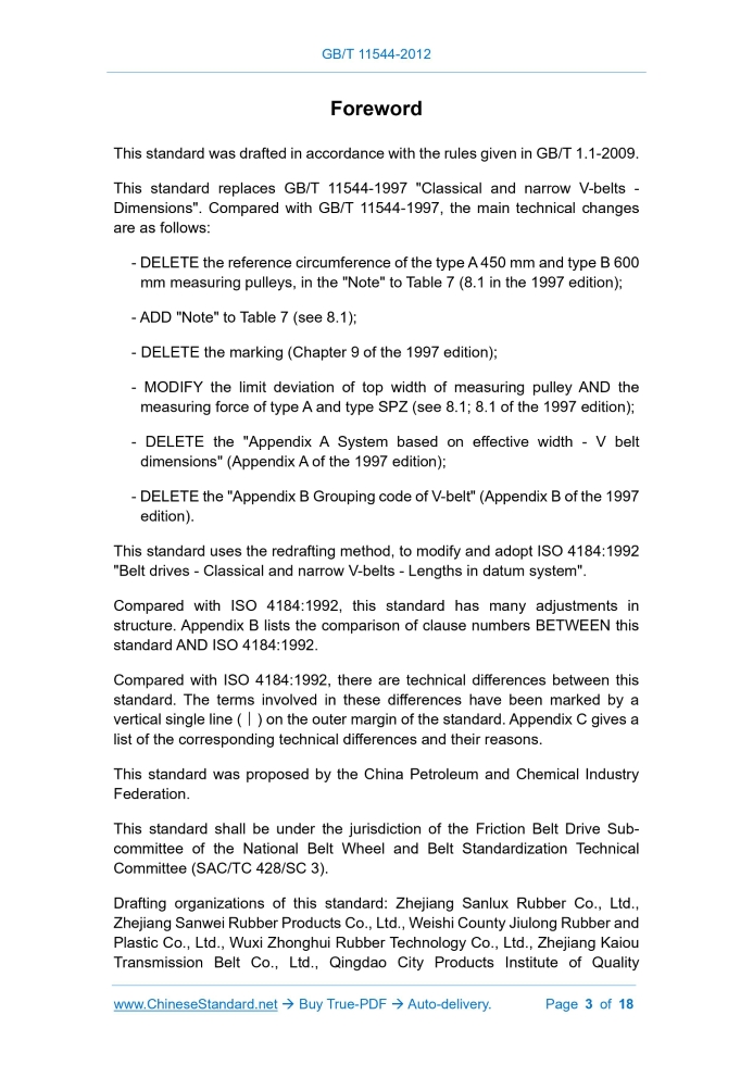 Similar standardsGB/T 11544-2012: Belt drives -- Classical and narrow V-belts -- Dimensions (system based on datum width)---This is an excerpt. Full copy of true-PDF in English version (including equations, symbols, images, flow-chart, tables, and figures etc.), auto-downloaded/delivered in 9 seconds, can be purchased online: https://www.ChineseStandard.net/PDF.aspx/GBT11544-2012 GB NATIONAL STANDARD OF THE PEOPLE'S REPUBLIC OF CHINA ICS 21.220.10 G 42 Replacing GB/T 11544-1997 Belt drives - Classical and narrow V-belts - Dimensions (system based on datum width) (ISO 4184:1992, Belt drives - Classical and narrow V-belts - Lengths in datum system, MOD) ISSUED ON: DECEMBER 31, 2012 IMPLEMENTED ON: OCTOBER 01, 2013 Issued by: General Administration of Quality Supervision, Inspection and Quarantine of PRC; Standardization Administration of PRC. Table of ContentsForeword ... 3 1 Scope ... 5 2 Normative references ... 5 3 Terms ... 5 4 Cross-sectional size ... 6 5 Reference length ... 8 6 Deviation of reference length ... 11 7 Center distance change ... 11 8 Measurement method of size ... 12 Appendix A (Informative) Reference length of classical V-belt ... 15 Appendix B (Informative) Structural changes of this standard compared with ISO 4184:1992 ... 16 Appendix C (Informative) Technical differences between this standard and ISO 4184:1992 AND their reasons ... 17 References ... 18ForewordThis standard was drafted in accordance with the rules given in GB/T 1.1-2009. This standard replaces GB/T 11544-1997 "Classical and narrow V-belts - Dimensions". Compared with GB/T 11544-1997, the main technical changes are as follows: - DELETE the reference circumference of the type A 450 mm and type B 600 mm measuring pulleys, in the "Note" to Table 7 (8.1 in the 1997 edition); - ADD "Note" to Table 7 (see 8.1); - DELETE the marking (Chapter 9 of the 1997 edition); - MODIFY the limit deviation of top width of measuring pulley AND the measuring force of type A and type SPZ (see 8.1; 8.1 of the 1997 edition); - DELETE the "Appendix A System based on effective width - V belt dimensions" (Appendix A of the 1997 edition); - DELETE the "Appendix B Grouping code of V-belt" (Appendix B of the 1997 edition). This standard uses the redrafting method, to modify and adopt ISO 4184:1992 "Belt drives - Classical and narrow V-belts - Lengths in datum system". Compared with ISO 4184:1992, this standard has many adjustments in structure. Appendix B lists the comparison of clause numbers BETWEEN this standard AND ISO 4184:1992. Compared with ISO 4184:1992, there are technical differences between this standard. The terms involved in these differences have been marked by a vertical single line (︱) on the outer margin of the standard. Appendix C gives a list of the corresponding technical differences and their reasons. This standard was proposed by the China Petroleum and Chemical Industry Federation. This standard shall be under the jurisdiction of the Friction Belt Drive Sub- committee of the National Belt Wheel and Belt Standardization Technical Committee (SAC/TC 428/SC 3). Drafting organizations of this standard: Zhejiang Sanlux Rubber Co., Ltd., Zhejiang Sanwei Rubber Products Co., Ltd., Weishi County Jiulong Rubber and Plastic Co., Ltd., Wuxi Zhonghui Rubber Technology Co., Ltd., Zhejiang Kaiou Transmission Belt Co., Ltd., Qingdao City Products Institute of Quality Belt drives - Classical and narrow V-belts - Dimensions (system based on datum width)1 ScopeThis standard specifies the cross-sectional dimensions, reference length, reference length deviation, center distance change, size measurement methods for classical V-belts and narrow V-belts. This standard applies to classical V-belts and narrow V-belts (hereinafter referred to as V-belts) for general mechanical transmission.2 Normative referencesThe following documents are essential to the application of this document. For the dated documents, only the versions with the dates indicated are applicable to this document; for the undated documents, only the latest version (including all the amendments) is applicable to this standard. GB/T 321 Preferred numbers - Series of preferred numbers (GB/T 321-2005, ISO3:1973, IDT) GB/T 6931.2 Belt drives vocabulary - Part 2: V-belts and V-ribbed belt drives vocabulary (GB/T 6931.2-2008, ISO 1081:1995, MOD) GB/T 10412 classical and narrow V-belt wheels (standard width system) (GB/T 10412-2002, ISO 4183:1995, MOD) GB/T 11356.1 Grooved pulleys for classical and narrow V-belts (system based on datum width) (GB/T 11356.1-2008, ISO 255:1990, MOD) GB/T 13490 V-belts - Uniformity of belts - Test method for determination of center distance variation (GB/T 13490-2006, ISO 9608:1994, IDT)3 TermsThe terms and definitions of V-belt drive, which are defined in GB/T 6931.2, apply to this document.4 Cross-sectional sizeV-belts, which have cross-sections of type Y, Z, A, B, C, D, E are called classical V-belts. The V-belts, which have cross-sections of types SPZ, SPA, SPB, SPC are narrow V-belts. For classical V-belts and narrow V-belts in the standard width system, the corresponding basic widths of the pulley grooves are specified as follows: - Type Y (for groove type, which has a reference width of 5.3 mm) - Type Z (for groove type, which has a reference width of 8.5 mm) - Type A (for groove type, which has a reference width of 11 mm) - Type B (for groove type, which has a reference width of 14 mm) - Type C (for groove type, which has a reference width of 19 mm) - Type D (for groove type, which has a reference width of 27 mm) - Type E (for groove type, which has a reference width of 32 mm) - Type SPZ (for groove type, which has a reference width of 8.5 mm) - Type SPA (for groove type, which has a reference width of 11 mm) - Type SPB (for groove type, which has a reference width of 14 mm) - Type SPC (for groove type, which has a reference width of 19 mm) The nominal size of the cross-section of the V-belt is as shown in Figure 1 and Table 1. Whet