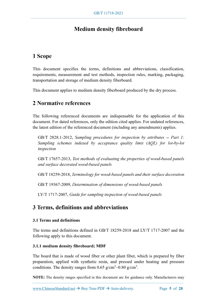 Similar standardsGB/T 11718-2021: Medium density fibreboard---This is an excerpt. Full copy of true-PDF in English version (including equations, symbols, images, flow-chart, tables, and figures etc.), auto-downloaded/delivered in 9 seconds, can be purchased online: https://www.ChineseStandard.net/PDF.aspx/GBT11718-2021GB NATIONAL STANDARD OF THE PEOPLE’S REPUBLIC OF CHINA ICS 79.060.20 CCS B 70 Replacing GB/T 11718-2009 Medium density fibreboard 中密度纤维板 (ISO 16895:2016, Wood-based panels -- Dry-process fibreboard, NEQ) ISSUED ON: NOVEMBER 26, 2021 IMPLEMENTED ON: JUNE 01, 2022 Issued by: State Administration for Market Regulation; Standardization Administration of the People's Republic of China. Table of ContentsForeword ... 3 1 Scope ... 5 2 Normative references ... 5 3 Terms, definitions and abbreviations ... 5 4 Classification ... 8 5 Requirements ... 8 6 Measurement and test methods ... 17 7 Specification limits ... 21 8 Inspection rules ... 22 9 Marking, packaging, transportation and storage ... 24 Annex A (normative) Calculation of 5% and 95% quantiles ... 26 Bibliography ... 28 Medium density fibreboard1 ScopeThis document specifies the terms, definitions and abbreviations, classification, requirements, measurement and test methods, inspection rules, marking, packaging, transportation and storage of medium density fiberboard. This document applies to medium density fiberboard produced by the dry process.2 Normative referencesThe following referenced documents are indispensable for the application of this document. For dated references, only the edition cited applies. For undated references, the latest edition of the referenced document (including any amendments) applies. GB/T 2828.1-2012, Sampling procedures for inspection by attributes -- Part 1: Sampling schemes indexed by acceptance quality limit (AQL) for lot-by-lot inspection GB/T 17657-2013, Test methods of evaluating the properties of wood-based panels and surface decorated wood-based panels GB/T 18259-2018, Terminology for wood-based panels and their surface decoration GB/T 19367-2009, Determination of dimensions of wood-based panels LY/T 1717-2007, Guide for sampling inspection of wood-based panels3 Terms, definitions and abbreviations3.1 Terms and definitions The terms and definitions defined in GB/T 18259-2018 and LY/T 1717-2007 and the following apply to this document. 3.1.1 medium density fibreboard; MDF The board that is made of wood fiber or other plant fiber, which is prepared by fiber preparation, applied with synthetic resin, and pressed under heating and pressure conditions. The density ranges from 0.65 g/cm3~0.80 g/cm3. NOTE: The density ranges specified in this document are for guidance only. Manufacturers may classify products as MDF boards of a specified type if their density is within ±10% of the density range and they meet all the performance requirements of a specified type of MDF board. For example, a fiberboard with a density of 0.83 g/cm3 may also be called MDF if it meets all the performance requirements of a specified type of MDF board grade. 3.1.2 general purpose medium density fibreboard Medium density fiberboard for non-furniture or non-structural grade applications. Example: Temporary display boards and partition boards used in exhibitions, etc. [Source: GB/T 18259-2018, 3.2.18, modified] 3.1.3 furniture grade medium density fibreboard Medium density fiberboard used for furniture or decoration usually requires secondary surface processing. [Source: GB/T 18259-2018, 3.2.19] 3.1.4 load bearing medium density fibreboard Medium density fiberboard usually used for small structural parts, or used in load- bearing conditions. [Source: GB/T 18259-2018, 3.2.20] 3.1.5 building medium density fibreboard Medium density fiberboard for general construction. Example: window frames, door linings, etc. 3.1.6 dry conditions Indoor environment or outdoor environment with protective measures. The moisture content of the material in this state is equivalent to the moisture content in an environment with a temperature of 20°C and a relative humidity not higher than 65% (or the relative humidity exceeds 65% only for a few weeks in a year). [Source: GB/T 18259-2018, 2.54] 3.1.7 humid conditions Indoor environment or outdoor environment with protective measures. Usually refers to an environment with a temperature of 20°C and a relative humidity higher than 65% but not exceeding 85%, or an environment with a relative humidity exceeding 85% for only a few weeks in a year. 3.1.8 humid conditions-temperate Indoor environment or outdoor environment with protective measures. The moisture content of the material in this state is equivalent to the moisture content in an environment with a temperature of 20°C and a relative humidity higher than 65% but not exceeding 85% (or the relative humidity exceeds 85% for only a few weeks in a year). [Source: GB/T 18259-2018, 2.55, modified] 3.1.9 humid conditions-tropical Indoor environment or outdoor environment with protective measures. The moisture content of the material in this state is equivalent to the moisture content in an environment with a temperature of 30°C and a relative humidity higher than 65% but not exceeding 85% (or the relative humidity exceeds 85% for only a few weeks in a year). [Source: GB/T 18259-2018, 2.56, modified] 3.1.10 high-humid conditions Indoor environment or outdoor environment with protective measures. The moisture content of the material in this state is equivalent to the moisture content in an environment with a temperature higher than 30°C and a relative humidity higher than 85%, or in an environment where it may occasionally come into contact with water (except immersion or watering). [Source: GB/T 18259-2018, 2.57] 3.1.11 exterior conditions Environmental conditions under outdoor natural climatic conditions. [Source: GB/T 18259-2018, 2.58] 3.2 Abbreviations BL: building EXT: exterior F: fungi retardant FN: furniture; furniture maki