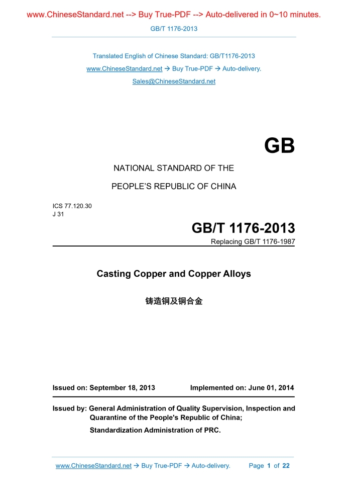 GB/T 1176-2013: Casting copper and copper alloys Delivery: 9 seconds. True-PDF full-copy in English & invoice will be downloaded + auto-delivered via email. See step-by-step procedure Status: Valid GB/T 1176: Historical versions