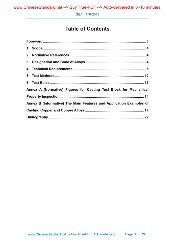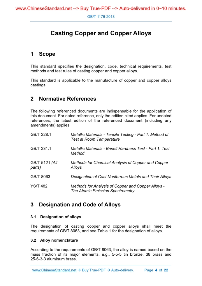GB/T 1176-2013: Casting copper and copper alloys---This is an excerpt. Full copy of true-PDF in English version (including equations, symbols, images, flow-chart, tables, and figures etc.), auto-downloaded/delivered in 9 seconds, can be purchased online: https://www.ChineseStandard.net/PDF.aspx/GBT1176-2013NATIONAL STANDARD OF THE PEOPLE’S REPUBLIC OF CHINA ICS 77.120.30 J 31 Replacing GB/T 1176-1987 Casting Copper and Copper Alloys Issued on. SEPTEMBER 18, 2013 Implemented on. JUNE 01, 2014 Issued by. General Administration of Quality Supervision, Inspection and Quarantine of the People's Republic of China; Standardization Administration of PRC. Table of ContentsForeword... 3 1 Scope... 4 2 Normative References... 4 3 Designation and Code of Alloys... 4 4 Technical Requirements... 5 5 Test Methods... 12 6 Test Rules... 13 Annex A (Normative) Figures for Casting Test Block for Mechanical Property Inspection... 14 Annex B (Informative) The Main Features and Application Examples of Casting Copper and Copper Alloys... 17 Bibliography... 22ForewordThis standard is developed in accordance with the rules given in GB/T 1.1-2009. This standard replaces GB/T 1176-1987 Specification for Cast Copper Alloys. The following main technical changes have been made, comparing with GB/T 1176-1987. -- the standard name is changed to "Casting Copper and Copper Alloys"; -- the designations of casting copper and copper alloys, i.e., ZCu99, ZCuPb9Sn5, ZCuAl8Mn14Fe3Ni2, ZCuAl8Be1Co1, ZCuZn21Al5Fe2Mn2, ZCuAl10Fe4Ni4, ZCuNi10Fe1Mn1 and ZCuNi30Fe1Mn1 are added; -- the scope is added; -- the spectral analysis method of alloy chemical compositions is added; -- the composition range of ZCuSn10P1, ZCuSn10Zn2, ZCuPb10Sn10, ZCuZn38, ZCuZn25Al6Fe3Mn3, ZCuZn26Al4Fe3Mn3 and ZCuAl8Mn14Fe3Ni2 is modified; -- the expression method of Brinell hardness number in Table 3 is modified; -- Annex A and Annex B are modified; -- Annex C is deleted. This standard was proposed by and shall be under the jurisdiction of the National Technical Committee on Foundry of Standardization Administration of China (SAC/TC 54). The previous editions of this standard are as follows. -- GB/T 1176-1974, GB/T 1176-1987. Casting Copper and Copper Alloys1 ScopeThis standard specifies the designation, code, technical requirements, test methods and test rules of casting copper and copper alloys. This standard is applicable to the manufacture of copper and copper alloys castings.2 Normative ReferencesThe following referenced documents are indispensable for the application of this document. For dated reference, only the edition cited applies. For undated references, the latest edition of the referenced document (including any amendments) applies. GB/T 228.1 Metallic Materials - Tensile Testing - Part 1.Method of Test at Room Temperature GB/T 231.1 Metallic Materials - Brinell Hardness Test - Part 1.Test Method GB/T 5121 (All parts) Methods for Chemical Analysis of Copper and Copper Alloys3 Designation and Code of Alloys3.1 Designation of alloys The designation of casting copper and copper alloys shall meet the requirements of GB/T 8063, and see Table 1 for the designation of alloys. 3.2 Alloy nomenclature According to the requirements of GB/T 8063, the alloy is named based on the mass fraction of its major elements, e.g., 5-5-5 tin bronze, 38 brass and 25-6-3-3 aluminum brass.4 Technical Requirements4.1 Chemical compositions 4.1.1 The content of major elements in the alloy shall be in accordance with those specified in Table 1; the content of impurity elements shall be in accordance with those specified in Table 2.Elements not contained in Tables 1 and 2 shall be determined through negotiation of the supplier and the purchaser. 4.1.4 ZCuSn5Pb5Zn5, ZCuSn10Zn2, ZCuPb10Sn10, ZCuPb15Sn8 and ZCuPb20Sn5 alloys are applicable to centrifugal casting and continuous casting, and the phosphorus content is determined through negotiation of the supplier and the purchaser. 4.2 Mechanical properties 4.2.1 The room-temperature mechanical properties of as-cast alloy shall be in accordance with those specified in Table 3. 4.2.2 The mechanical properties of the alloy shall be determined with separately cast test bar, test block, or the sample processed with attached test block. The shape and dimension of the casting test block are detailed in Annex A.5 Test Methods5.1 Chemical compositions The chemical compositions of alloys are inspected according to those specified in GB/T 5121 (all parts) or YS/T 482.Other test methods are allowable to be adopted only if the analysis precision is guaranteed. 5.2 Mechanical properties6 Test Rules6.1 Chemical compositions 6.1.1 Only the major elements of the alloy compositions are analyzed, and the analysis for impurity elements is determined through negotiation of the supplier and the purchaser. 6.2 Mechanical properties 6.2.1 Tensile test is conducted with the tensile sample (one) specified in 4.2.4.If the test result fails to meet those specified in Table 3, retest is conducted with another two samples, if one sample in the retest is unqualified, the mechanical properties of the alloy are regarded as unqualified. 6.2.2 If the property is unqualified due to the test or the defect on the sample, the test is invalid and resample shall be done for retest.Annex A(Normative) Figures for Casting Test Block for Mechanical Property Inspection A.1 Sand mold test bars Sand mold test bars applicable to tin bronze, lead bronze and silicon brass are detailed in Figure A.1. In mmAnnex B(Informative) The Main Features and Application Examples of Casting Copper and Copper Alloys The main features and application examples of casting copper and copper alloys are detailed in Table B.1. ......Source: Above contents are excerpted from the full-copy PDF -- translated/reviewed by: www.ChineseStandard.net / Wayne Zheng et al. Tips & Frequently Asked Questions:Question 1: How long will the true-PDF of English version of GB/T 1176-2013 be delivered?Answer: The full