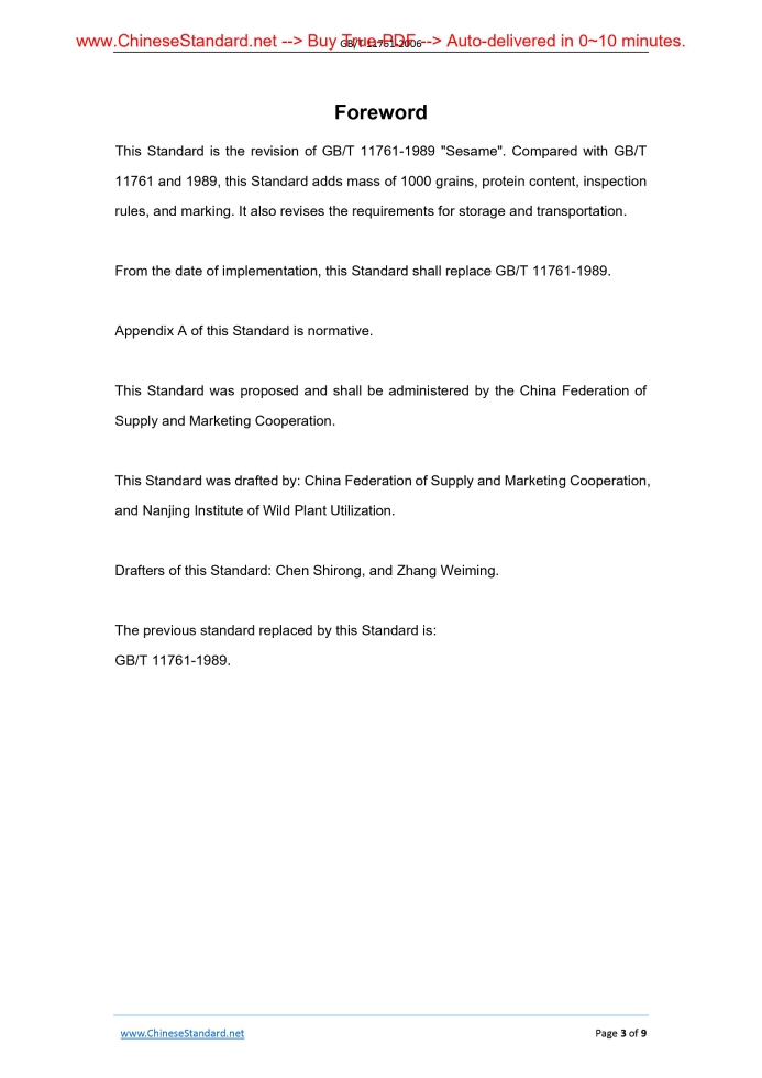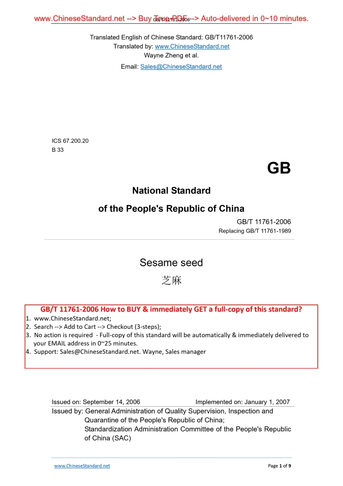 GB/T 11761-2006: Sesame seed Delivery: 9 seconds. True-PDF full-copy in English & invoice will be downloaded + auto-delivered via email. See step-by-step procedure Status: Obsolete GB/T 11761: Historical versions