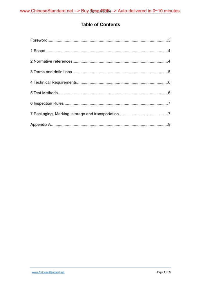 Similar standardsGB/T 11761-2006: Sesame seed---This is an excerpt. Full copy of true-PDF in English version (including equations, symbols, images, flow-chart, tables, and figures etc.), auto-downloaded/delivered in 9 seconds, can be purchased online: https://www.ChineseStandard.net/PDF.aspx/GBT11761-2006ICS 67.200.20 B 33 GB National Standard of the People's Republic of China Replacing GB/T 11761-1989 Sesame seed 芝麻 Issued on: SEPTEMBER 14, 2006 Implemented on: JANUARY 1, 2007 Issued by. General Administration of Quality Supervision, Inspection and Quarantine of the People's Republic of China; Standardization Administration Committee of the People's Republic of China (SAC) Table of ContentsForeword... 3 1 Scope... 4 2 Normative references... 4 3 Terms and definitions... 5 4 Technical Requirements... 6 5 Test Methods... 6 6 Inspection Rules... 7 7 Packaging, Marking, storage and transportation... 7 Appendix A... 9ForewordThis Standard is the revision of GB/T 11761-1989 "Sesame". Compared with GB/T 11761 and 1989, this Standard adds mass of 1000 grains, protein content, inspection rules, and marking. It also revises the requirements for storage and transportation. From the date of implementation, this Standard shall replace GB/T 11761-1989. Appendix A of this Standard is normative. This Standard was proposed and shall be administered by the China Federation of Supply and Marketing Cooperation. This Standard was drafted by. China Federation of Supply and Marketing Cooperation, and Nanjing Institute of Wild Plant Utilization. Drafters of this Standard. Chen Shirong, and Zhang Weiming. The previous standard replaced by this Standard is. GB/T 11761-1989. Sesame seed1 ScopeThis Standard specifies sesame’s terms and definitions, technical requirements, test methods, inspection rules, packaging, marking, storage and transportation. This Standard applies to sesame’s quality assessment and trading.2 Normative referencesThe following documents contain provisions which, through reference in this Standard, become provisions of this Standard. For dated references, their subsequent amendments (excluding corrections) or revisions do not apply to this Standard. However, the parties who enter into agreement based on this Standard are encouraged to investigate whether the latest versions of these documents are applicable. For undated reference documents, the latest versions apply to this Standard. GB 2762 Maximum levels of contaminants in foods GB 2763 Maximum residue limits for pesticides in food GB 5491 Inspection of grain and oilseeds - Methods for sampling and sample reduction GB/T 5492 Inspection of grain and oils. Identification of color, odor and taste of grain and oilseeds GB/T 5493 Inspection of grain and oils. Determination of type purity and their mixture GB/T 5494 Inspection of grain and oils. Determination of foreign matter and unsound kernels of grain and oilseeds GB/T 5497 Inspection of grain and oilseeds - Methods for determination of moisture content GB/T 5512 Inspect of grain and oilseeds. Determination of crude fat content in grain GB/T 5519 Cereals and pulses. Determination of the mass of 1000 grains GB/T 14489.2 Inspection of grain and oils. Determination of crude protein in oilseeds GB 15199 Tolerance limit of copper in foods GB 15569 Quarantine protocol for the movement of agricultural plants and plant products3 Terms and definitionsThe following terms and definitions apply to this Standard. 3.1 Mass of 1000 grains The mass of finished product of one thousand sesame, in grams (g). 3.2 Ratio of pure quality The percentage - mass of net sample minus half imperfect grains TO sample quality. 3.3 Imperfect grain The grains which are imperfect but still have usage value, including immature grains, worm-eaten grains, damaged grains and moldy grains. 3.3.1 Unripe gain The grains which are immature or deflated. It is significantly different from the normal grains. 3.3.2 Worm-eaten grain The grains which are moth-eaten or of which the cotyledons are damaged. 3.3.3 Damaged grain The grains which are rushed or cracked. 3.3.4 Mildewly grain The grains of which the surface is mildewed or the cotyledons are discolored. 3.4 Impurity The matter which passes through sieve layer and has no food value, including matter-under-sieve and inorganic impurities. 3.4.1 Matter under sieve The matter which passes through a sieve with 1.0 mm diameter hole. 3.4.2 Inorganic impurity Gravel, mud, brick blocks and other inorganic substances. 3.5 Organic impurity Sesame grains without food value, dissimilar grains and oil grains, and other organic impurities. 3.6 Oil content The mass fraction of crude fat in sesame. 3.7 Protein content The mass fraction of crude protein in sesame.Appendix A(Normative) Quality indicators of oil-making sesame A.1 The grade of oil-making sesame shall be determined by oil content with standard water and impurity. Quality indicators of each grade refer to Table A.1. Table A.1 Quality indicators of oil-making sesame Grade Oil content (with standard water, impurity) / (%) Mass of grains / g Moisture (%) Protein (%) Impurity (%) Color & odor 1 ≥ 51.0 ≥ 2.2 ≤ 8.0 ≥ 19.0 ≤ 2.0 Normal 2 ≥ 50.0 3 ≥ 49.0 4 ≥ 48.0 5 ≥ 47.0 A.2 Pricing basis of oil-making sesame shall be based on grade 3.When the oil content is above 52.0% or below 47.0%, price shall be adjusted according to the actual oil content. A.3 Health indicators. Health indicators shall be performed according to the standards. GB 2762, GB 2763, and GB 15199. ......Source: Above contents are excerpted from the full-copy PDF -- translated/reviewed by: www.ChineseStandard.net / Wayne Zheng et al. |