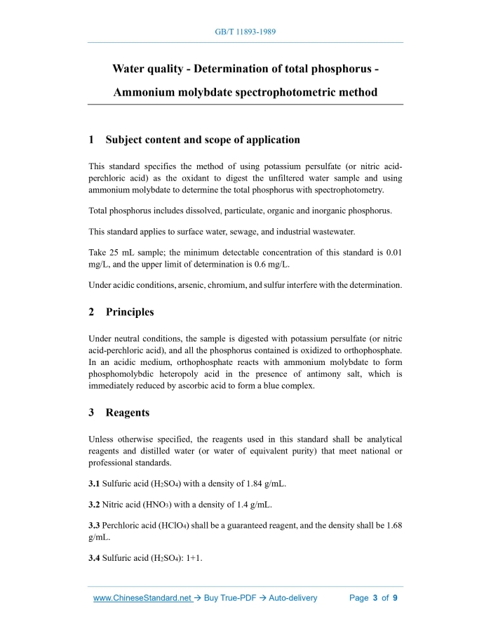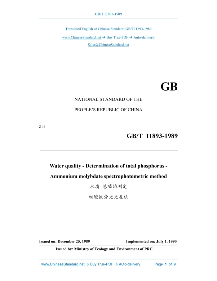 GB/T 11893-1989: Water quality. Determination of total phosphorus. Ammonium molybdate spectrophotometric method Delivery: 9 seconds. True-PDF full-copy in English & invoice will be downloaded + auto-delivered via email. See step-by-step procedure