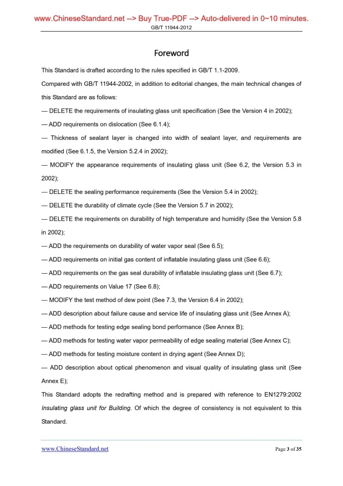Similar standardsGB/T 11944-2012: Insulating glass unit---This is an excerpt. Full copy of true-PDF in English version (including equations, symbols, images, flow-chart, tables, and figures etc.), auto-downloaded/delivered in 9 seconds, can be purchased online: https://www.ChineseStandard.net/PDF.aspx/GBT11944-2012ICS 81.040 Q 33 GB NATIONAL STANDARD Replacing GB/T 11944-2002 Insulating glass unit Issued on. DECEMBER 31, 2012 Implemented on. SEPTEMBER 1, 2013 Issued by. General Administration of Quality Supervision, Inspection and Quarantine of the People’s Republic of China; Standardization Administration of the People’s Republic of China Table of ContentsForeword... 3 1 Scope... 5 2 Normative references... 5 3 Terms and definitions... 5 4 Classification... 6 5 Material... 6 6 Requirements... 6 7 Test methods... 9 8 Inspection rules... 18 9 Packaging, marks, transportation and storage... 20 Annex A... 21 Annex B... 22 Annex C... 25 Annex D... 27 Annex E... 321 ScopeThis Standard specifies the terms, definitions, classification, requirements, test methods, inspection rules. Packaging, marks, transportation and storage of Insulating glass unit. This Standard applies to the insulating glass unit used for cold storage, decoration and transportation in the field of building and other fields, and can be taken as reference by the insulating glass unit used for other purposes.2 Normative referencesThe articles contained in the following documents have become part of this Standard when they are quoted herein. For the dated documents so quoted, all the modifications (Including all corrections) or revisions made thereafter shall be applicable to this Standard. GB/T 1216 External micrometer GB/T 8170 Rules of rounding off for numerical values & expression and judgment of limiting values GB/T 22476 Calculation and determination of steady-state U values (thermal transmittance) of multiple glazing3 Terms and definitionsThe following terms and definitions are applicable to this document. 3.1 Insulating glass unit 2 or more sheets of glass are separated with effective support and are bond-sealed at edges, thus it becomes the glass product with dry gas space in between the glass layers.4 Classification4.1 Classified according to the shape Flat insulating glass; Curved surface insulating glass.5 Material5.1 Glass The sheet glass, coated glass, laminated glass, toughened glass, fire-resistant glass, semi-toughened glass, figured glass and other glasses can be adopted. The glass used shall be in compliance with the corresponding standard requirements. 5.3 Spacing materials Spacing materials can be aluminum spacing strip, stainless steel spacing strip, composite spacing strip, composite gaskets, etc., and shall conform to the requirements of relevant standards and technical documents. 5.4 Desiccant Desiccant shall be in compliance with the requirements of relevant standards.6 RequirementsThe performance and test methods of insulating glass unit shall comply with the provisions of the corresponding terms in Table 1. 6.1 Dimensional deviation 6.1.1 The allowable deviation for length and width of insulating glass unit are shown in Table 2. Table 2 Length (width) allowable deviation Unit. mm 6.1.3 Diagonal difference of insulating glass unit Diagonal difference of rectangular flat insulating glass unit shall not be more than 0.2% of the average length of the diagonal. Diagonal difference of curved and irregular shaped insulating glass unit shall be negotiated between the supplier and demander. 6.1.4 Dislocation The maximum dislocation of flat insulating glass unit shall comply with the provisions in Table 4. Table 4 Allowable dislocation Unit. mm 6.1.5 Bond-line thickness of insulating glass unit Width of secondary line of sealant for insulating glass unit shall be ≥5mm; glue line width of composite sealing strip shall be 8mm±2mm; width of primary line of butyl sealant layer shall be ≥3mm; Special specifications or specially required product shall be negotiated between the supplier and demander. 6.3 Dew point Dew point of insulating glass unit shall be < -40 ºC. 6.4 Ultraviolet irradiation resistant performance After test, the inner surface of sample shall be free of traces of fogging, water vapor condensation or contamination, or obvious deformation of sealant. 6.5 Durability of water vapor seal Moisture permeability index I≤0.25, average value Iav≤0.20. 6.6 The initial gas content The initial gas content of inflatable insulating glass unit shall be ≥ 85% (V/V). 6.7 Durability of gas seal After gas seal durability test, the gas content of inflatable insulating glass unit shall be ≥ 80% (V/V). 6.8 U value The supplier and the demander shall negotiate about whether this test is necessary.7 Test methods7.1 Dimensional deviation 7.1.1 Insulating glass unit length, width deviation and diagonal difference shall be measured with the steel tap or straight steel ruler with accuracy of 1.0mm; sealant layer width and dislocation shall be measured with the steel tap or straight steel ruler with accuracy of 0.5mm. 7.1.2 The thickness of the insulating glass unit shall be measured at the midpoint of four sides 15mm from the glass edge by using the outside micrometer with accuracy of 0.01mm required by GB/T1216 or the vernier caliper with accuracy of 0.02mm. The arithmetic mean of the measurement results will be the thickness value. 7.2 Appearance It shall use product or sample to test, observe with the naked eye at a distance of 600mm from the insulating glass unit under good natural light or scattered light background illumination conditions. Scratch width shall be measured with the 10-fold reading microscope with accuracy of 0.1mm; and the length shall be measured with the straight steel ruler with accuracy of 0.5mm. 7.3 Dew point test 7.3.1 Sample Sample shall be the product or shall be made of the same material into the size of 510mm × 360mm under the same process condition as the product; the number o