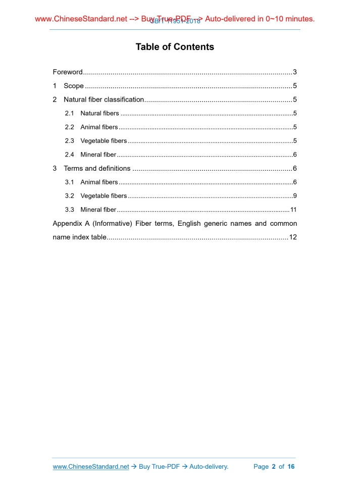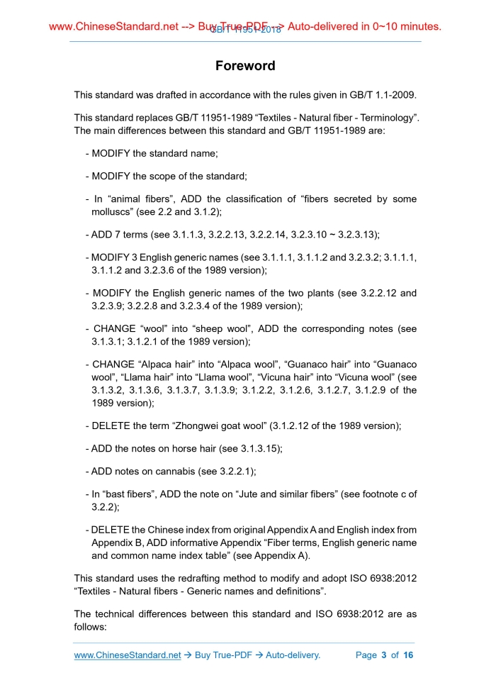 Similar standardsGB/T 11951-2018: Natural fibres -- Terminology---This is an excerpt. Full copy of true-PDF in English version (including equations, symbols, images, flow-chart, tables, and figures etc.), auto-downloaded/delivered in 9 seconds, can be purchased online: https://www.ChineseStandard.net/PDF.aspx/GBT11951-2018GB NATIONAL STANDARD OF THE PEOPLE’S REPUBLIC OF CHINA ICS 59.060.10 W 04 Replacing GB/T 11951-1989 Natural fibers - Terminology (ISO 6938.2012, Textiles - Natural fibers - Generic name and definitions, MOD) Issued on: FEBRUARY 06, 2018 Implemented on: SEPTEMBER 01, 2018 Issued by. General Administration of Quality Supervision, Inspection and Quarantine; Standardization Administration of the People's Republic of China. Table of ContentsForeword ... 3 1 Scope ... 5 2 Natural fiber classification ... 5 2.1 Natural fibers ... 5 2.2 Animal fibers ... 5 2.3 Vegetable fibers ... 5 2.4 Mineral fiber ... 6 3 Terms and definitions ... 6 3.1 Animal fibers ... 6 3.2 Vegetable fibers ... 9 3.3 Mineral fiber ... 11 Appendix A (Informative) Fiber terms, English generic names and common name index table ... 12ForewordThis standard was drafted in accordance with the rules given in GB/T 1.1-2009. This standard replaces GB/T 11951-1989 “Textiles - Natural fiber - Terminology”. The main differences between this standard and GB/T 11951-1989 are. - MODIFY the standard name; - MODIFY the scope of the standard; - In “animal fibers”, ADD the classification of “fibers secreted by some molluscs” (see 2.2 and 3.1.2); - ADD 7 terms (see 3.1.1.3, 3.2.2.13, 3.2.2.14, 3.2.3.10 ~ 3.2.3.13); - MODIFY 3 English generic names (see 3.1.1.1, 3.1.1.2 and 3.2.3.2; 3.1.1.1, 3.1.1.2 and 3.2.3.6 of the 1989 version); - MODIFY the English generic names of the two plants (see 3.2.2.12 and 3.2.3.9; 3.2.2.8 and 3.2.3.4 of the 1989 version); - CHANGE “wool” into “sheep wool”, ADD the corresponding notes (see 3.1.3.1; 3.1.2.1 of the 1989 version); - CHANGE “Alpaca hair” into “Alpaca wool”, “Guanaco hair” into “Guanaco wool”, “Llama hair” into “Llama wool”, “Vicuna hair” into “Vicuna wool” (see 3.1.3.2, 3.1.3.6, 3.1.3.7, 3.1.3.9; 3.1.2.2, 3.1.2.6, 3.1.2.7, 3.1.2.9 of the 1989 version); - DELETE the term “Zhongwei goat wool” (3.1.2.12 of the 1989 version); - ADD the notes on horse hair (see 3.1.3.15); - ADD notes on cannabis (see 3.2.2.1); - In “bast fibers”, ADD the note on “Jute and similar fibers” (see footnote c of 3.2.2); - DELETE the Chinese index from original Appendix A and English index from Appendix B, ADD informative Appendix “Fiber terms, English generic name and common name index table” (see Appendix A). This standard uses the redrafting method to modify and adopt ISO 6938.2012 “Textiles - Natural fibers - Generic names and definitions”. The technical differences between this standard and ISO 6938.2012 are as follows. Natural fibers - Terminology1 ScopeThis standard defines the terms and definitions of the main natural fibers used for textiles based on the source or composition of the fibers, and provides the corresponding English generic names and common names. This standard applies to textile natural fibers. Note. The English generic name for various natural fibers defined in this standard is shown in Appendix A.2 Natural fiber classification2.1 Natural fibers Natural fibers are divided into animal fibers, vegetable fibers, and mineral fibers by source. 2.2 Animal fibers Animal fibers mainly include. - Fiber from silk glands. secreted by some insects, particularly by larvae of the lepidopter order, in the form of two filaments of fibroin cemented together by sericin. - Fibers secreted by molluscs. fibres secreted by some molluscs. - Fiber from hair follicles. with a multicellular structure, composed of keratin, forming the animal hair follicles. 2.3 Vegetable fibers Vegetable fibers mainly include. - Fiber from seeds. Single-cell structure, generated by the epidermal cells of the seed, almost entirely constituted of cellulose. (Castor) 3.1.3.13 d 鹿毛 DEER (Daim) Fiber obtained from Genus cervus 3.1.3.14 d 山羊毛 GOAT (Chèvre) Fiber obtained from Genus capra 3.1.3.15 d 马毛 e HORSE (Cheval) Fiber obtained from Equus caballus 3.1.3.16 d 兔毛 RABBIT (Lapin) Fiber obtained from Oryctolagus cuniculus 3.1.3.17 d 野兔毛 HARE (Lièvre) Fiber obtained from Lepus europaeus and Lepus timidus 3.1.3.18 d 水獭毛 OTTER (Loutre) Fiber obtained from Lutra lutra 3.1.3.19 d 河狸鼠毛 NUTRIA (Myocastor) Fiber obtained from Myocastor coypus 3.1.3.20 d 海豹毛 SEAL (Phoque) Fiber obtained from Family pinnipedia 3.1.3.21 d 麝鼠毛 MUSKRAT (Ratmusqué) Fiber obtained from Fiber zibathicus 3.1.3.22 d 驯鹿毛 REINDEER (Renne) Fiber obtained from Genus rangifer Table 3 (continued) Entry number Chinese name English generic name a Definition 3.1.3.23 d 水貂毛 MINK (Vison) Fiber obtained from Mustela vison 3.1.3.24 d 貂毛 MARTEN (Martre) Fiber obtained from Mustela martes 3.1.3.25 d 黑貂毛 SABLE (Zibeline) Fiber obtained from Mustela zibellina 3.1.3.26 d 鼬鼠毛 WEASEL (Belette) Fiber obtained from Mustela misalis 3.1.3.27 d 熊毛 BEAR (Ours) Fiber obtained from Ursus arctos 3.1.3.28 d 银鼠毛 ERMINE (Hermine) Fiber obtained from Mustela eminea 3.1.3.29 d 北极狐毛 ARTICFOX (Renardarctique) Fiber obtained from Vulpus lagopus, Canis isatis a Names in brackets are equivalent French-language names. b Synonym. wool. c The affixes “wool” and “hair” can be added after the English generic names of 3.1.3.2 ~ 3.1.3.10, 3.1.3.12, and 3.1.3.18. ......Source: Above contents are excerpted from the full-copy PDF -- translated/reviewed by: www.ChineseStandard.net / Wayne Zheng et al. Tips & Frequently Asked Questions:Question 1: How long will the true-PDF of English version of GB/T 11951-2018 be delivered?Answer: The full copy PDF of English version of GB/T 11951-2018 can be downloaded in 9 seconds, and it will also be emailed