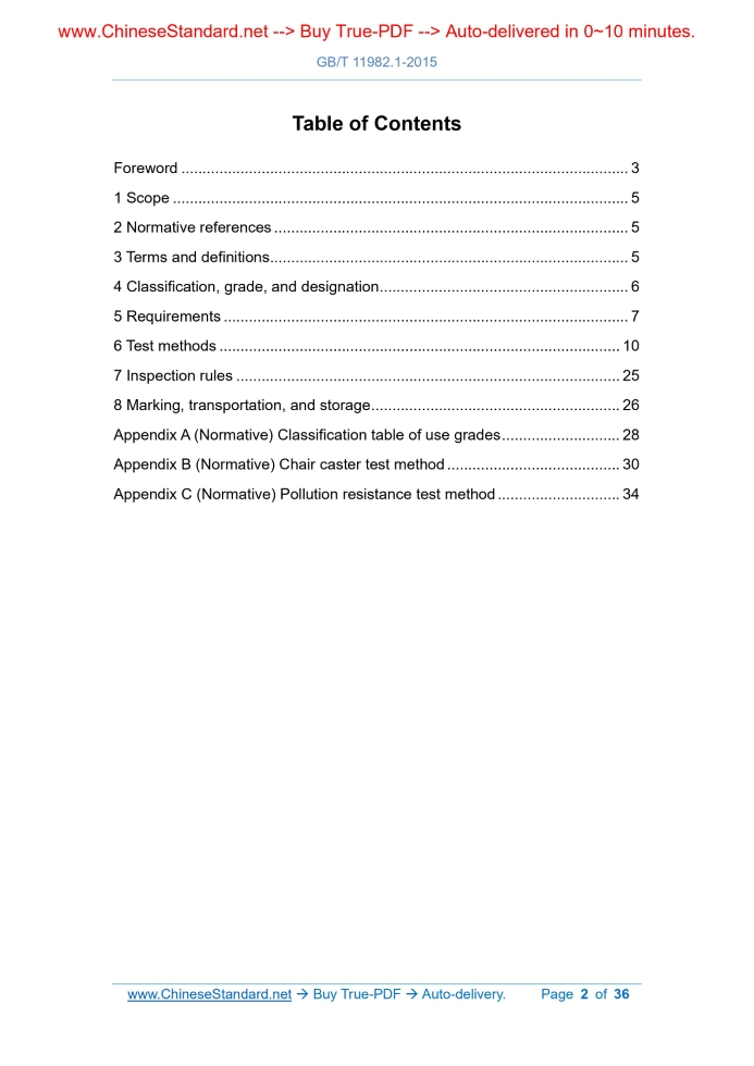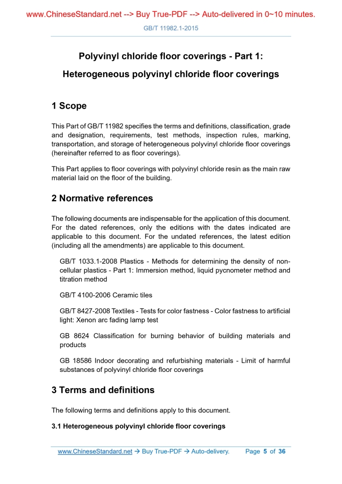 Similar standardsGB/T 11982.1-2015: Polyvinyl chloride floor coverings - Part 1: Heterogeneous polyvinyl chloride floor coverings---This is an excerpt. Full copy of true-PDF in English version (including equations, symbols, images, flow-chart, tables, and figures etc.), auto-downloaded/delivered in 9 seconds, can be purchased online: https://www.ChineseStandard.net/PDF.aspx/GBT11982.1-2015 NATIONAL STANDARD OF THE PEOPLE’S REPUBLIC OF CHINA ICS 83.140 Q 22 Replacing GB/T 11982.1-2005 Polyvinyl chloride floor coverings - Part 1: Heterogeneous polyvinyl chloride floor coverings 聚氯乙烯卷材地板 ISSUED ON: SEPTEMBER 11, 2015 IMPLEMENTED ON: AUGUST 01, 2016 Issued by: General Administration of Quality Supervision, Inspection and Quarantine of the PRC; Standardization Administration of the PRC. Table of ContentsForeword ... 3 1 Scope ... 5 2 Normative references ... 5 3 Terms and definitions ... 5 4 Classification, grade, and designation ... 6 5 Requirements ... 7 6 Test methods ... 10 7 Inspection rules ... 25 8 Marking, transportation, and storage ... 26 Appendix A (Normative) Classification table of use grades ... 28 Appendix B (Normative) Chair caster test method ... 30 Appendix C (Normative) Pollution resistance test method ... 34 Polyvinyl chloride floor coverings - Part 1: Heterogeneous polyvinyl chloride floor coverings1 ScopeThis Part of GB/T 11982 specifies the terms and definitions, classification, grade and designation, requirements, test methods, inspection rules, marking, transportation, and storage of heterogeneous polyvinyl chloride floor coverings (hereinafter referred to as floor coverings). This Part applies to floor coverings with polyvinyl chloride resin as the main raw material laid on the floor of the building.2 Normative referencesThe following documents are indispensable for the application of this document. For the dated references, only the editions with the dates indicated are applicable to this document. For the undated references, the latest edition (including all the amendments) are applicable to this document. GB/T 1033.1-2008 Plastics - Methods for determining the density of non- cellular plastics - Part 1: Immersion method, liquid pycnometer method and titration method GB/T 4100-2006 Ceramic tiles GB/T 8427-2008 Textiles - Tests for color fastness - Color fastness to artificial light: Xenon arc fading lamp test GB 8624 Classification for burning behavior of building materials and products GB 18586 Indoor decorating and refurbishing materials - Limit of harmful substances of polyvinyl chloride floor coverings3 Terms and definitionsThe following terms and definitions apply to this document. 3.1 Heterogeneous polyvinyl chloride floor coverings 5.3.4.2 Pollution resistance REPORT test results. 5.3.4.3 Welding strength USE grade 32 and above floor covering to conduct welding strength test as agreed by the supplier and the purchaser. The average welding strength is ≥240 N/50 mm; the minimum is ≥180 N/50 mm. 5.3.4.4 Skid resistance REPORT test results.6 Test methods6.1 Standard test conditions The test piece, before the test, shall be left for at least 24 h under standard conditions of temperature (23±2)°C and relative humidity (50±5)%. The test shall be performed under these conditions. 6.2 Appearance Under the scattered sunlight or fluorescent lamp, at 1 m from the test piece, obliquely visually check the appearance. RECORD whether there are various defects listed in Table 2. 6.3 Dimensional tolerances 6.3.1 Length PUT the wear layer of the entire floor covering under test upwards. Without tensile stress, lay it on a hard plane; USE a steel tape with a division value of 1 mm to measure the length at two positions parallel to the longitudinal direction at about 200 mm from both sides. TAKE the arithmetic mean of the two length measurement results to indicate the length of the floor covering, accurate to 10 mm. 6.3.2 Width According to the method of 6.3.1, use a steel tape with a division value of 1 mm to measure the width at the middle and both ends perpendicular to the longitudinal direction. TAKE the smallest width to indicate the width of the floor covering, accurate to 1 mm. PLACE the test piece with the section facing up on a microscope test bench; READ the thickness of the wear layer. If there are concave and convex patterns, measure the thickness of the protruding part. 3 measurements are performed on each test piece. RECORD the single thickness measured value of wear layer, accurate to 0.01 mm. 6.3.3.2.4 Test result Calculate the deviation of the arithmetic mean of all wear layer thickness measurements from the stated wear layer thickness value, accurate to 1%; and the deviation of a single wear layer thickness measurement from the arithmetic mean of all wear layer thickness measurements, accurate to 0.01 mm. 6.4 Surface mass deviation 6.4.1 Instrument 6.4.1.1 Vernier caliper The division value is not greater than 0.1 mm. 6.4.1.2 Balance The sensitivity is not more than 0.01 g. 6.4.2 Sampling TAKE 5 square test pieces with a size of 100 mm×100 mm from the floor covering. Any side of the test piece shall be at least 100 mm from the edge of the floor covering. 6.4.3 Test procedure MEASURE the side length of the middle of each test piece, accurate to 0.1 mm. WEIGH and record the mass m0 of each test piece, accurate to 0.01 g. 6.4.4 Test result The surface mass is calculated according to formula (1). The deviation between the arithmetic mean of the surface masses of the 5 test pieces and the explicit surface mass value is calculated as a percentage and accurate to 1%. Where: A - Surface mass, in grams per square meter (g/m2); m0 - The mass of test piece, in grams (g); l - The length of test piece, in millimeters (mm); b - The width of test piece, in millimeters (mm). 6.5 Variation rate of heating sizes 6.5.1 Instrument 6.5.1.1 Constant-temperature blast oven Thermostat sensitivity is ±1 °C. 6.5.1.2 Vernier caliper The division value is 0.02 