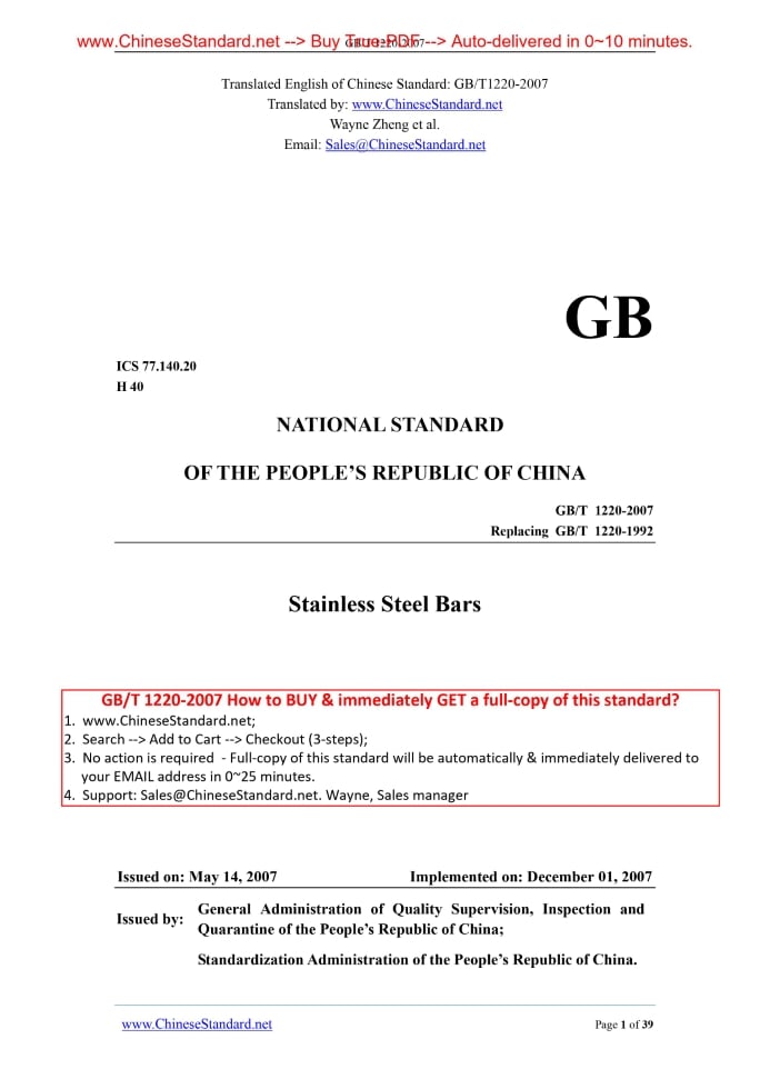 GB/T 1220-2007: Stainless steel rod Delivery: 9 seconds. True-PDF full-copy in English & invoice will be downloaded + auto-delivered via email. See step-by-step procedure Status: Valid GB/T 1220: Historical versions