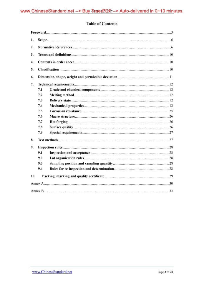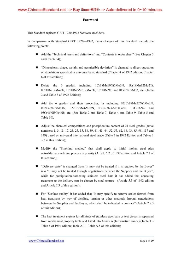GB/T 1220-2007: Stainless steel rod---This is an excerpt. Full copy of true-PDF in English version (including equations, symbols, images, flow-chart, tables, and figures etc.), auto-downloaded/delivered in 9 seconds, can be purchased online: https://www.ChineseStandard.net/PDF.aspx/GBT1220-2007GB ICS 77.140.20 H 40 NATIONAL STANDARD Replacing GB/T 1220-1992 Stainless Steel Bars Issued on. MAY 14, 2007 Implemented on. DECEMBER 01, 2007 Issued by. General Administration of Quality Supervision, Inspection and Quarantine of the People’s Republic of China; Standardization Administration of the People’s Republic of China. Table of ContentsForeword... 3 1.Scope... 6 2.Normative References... 6 3.Terms and definitions... 10 4.Contents in order sheet... 10 5.Classification... 10 6.Dimension, shape, weight and permissible deviation... 11 7.Technical requirements... 12 7.1 Grade and chemical components... 12 7.2 Melting method... 12 7.3 Delivery state... 12 7.4 Mechanical properties... 12 7.5 Corrosion resistance... 25 7.6 Macro structure... 26 7.7 Hot forging... 26 7.8 Surface quality... 26 7.9 Special requirements... 27 8.Test methods... 27 9.Inspection rules... 28 9.1 Inspection and acceptance... 28 9.2 Lot organization rules... 28 9.3 Sampling position and sampling quantity... 28 9.4 Rules for re-inspection and determination... 28 10.Packing, marking and quality certificate... 29 Annex A... 30 Annex B... 33 1.Scope This Standard specifies the dimensions, shape, technical requirements, test methods, inspection rules, packing marks, and certificate quality of stainless steel bars (generic terms of round steel, square steel, flat steel, hexagonal steel and octagonal steel, hereinafter refer to as “Steel bar”). This Standard is applicable to the hot rolled and forged steel bars of which the dimension (diameter, side length, thickness or subtense distance, hereinafter refer to as “Dimension”) is no more than 250mm. Through negotiations of both the Supplier and Buyer, it may also supply the hot rolled and forged steel bars of which the dimension is more than 250mm. 2.Normative References The articles contained in the following documents have become part of this Standard when they are quoted herein. For the dated documents so quoted, all the modifications (excluding corrections) or revisions made thereafter shall not be applicable to this Standard. For the undated documents so quoted, the latest editions shall be applicable to this Standard. GB/T 222 Permissible deviations for chemical composition of steel products GB/T 223.3 Methods for chemical analysis of iron, steel and alloy - The Diantipyrylmethane Phosphomolybdate Gravimetric Method for the Determination of phosphonium content GB/T 223.4 Methods for chemical analysis of iron, steel and alloy - The volumetric method for determination of manganese content by ammonium nitrate oxidation GB/T 223.5 Methods for chemical analysis of iron, steel and alloy – The reduction type silicomolybdic acid spectrophotometric method for the determination of acid-soluble silicon content GB/T 223.8 Methods for chemical analysis of iron, steel and alloy –The sodium fluoride separation-EDTA titration method for the determination of aluminium content 3.Terms and definitions The technical terms and definitions established in GB/T 20878 and GB/T 15574 are applicable to this Standard. 4.Contents in order sheet The contract for goods or order form made according this Standard shall contain the following contents. 5.Classification 5.1 By structural features, steel bars are divided into 5 categories - austenite type, austenite-ferrite type, ferrite type, martensite type, and precipitation-hardening type. 5.2 By application methods, steel bars are divided into 2 categories as follows. 6.Dimension, shape, weight and permissible deviation 6.1 Dimension, shape, weight and permissible deviation of hot-rolled round steel and square steel The dimension, shape, weight and permissible deviation of hot-rolled round steel and square steel shall conform to the stipulations set forth in GB/T 702-2004, the concrete requirements of which shall be indicated in contract. Otherwise it shall execute the second group contained in GB/T 802-2004 Standard. 6.2 Dimension, shape, weight and permissible deviation of hot-rolled flat steel The dimension, shape, weight and permissible deviation of hot-rolled flat steel shall conform to the stipulations set forth in GB/T 704-1988, the concrete requirements of which shall be indicated in contract. Otherwise it shall execute the contract according to the common class as specified in GB/T 704-1998. 6.3 Dimension, shape, weight and permissible deviation of hot-rolled hexagonal steel and octagonal steel The dimension, shape, weight and permissible deviation of hot-rolled hexagonal steel and octagonal steel shall conform to the stipulations set forth in GB/T 705-1985, the concrete requirements of which shall be indicated in contract. Otherwise it shall execute the contract according to the second group as specified in GB/T 705-1985. 6.5 Dimension, shape, weight and permissible deviation of forged flat steel The dimension, shape, weight and permissible deviation of forged flat steel shall conform to the stipulations set forth in GB/T 16761-1997, the concrete requirements of which shall be indicated in contract. Otherwise it shall execute the contract according to the second group as specified in GB/T 16761-1997. 6.6 Weight Steel bars shall be delivered by actual weight. 7.Technical requirements 7.1 Grade and chemical components 7.2 Melting method Unless it is otherwise stipulated in contract, it shall usually adopt initial molten steel plus out-of-furnace refining process. 7.3 Delivery state Steel bars can be delivered in heat-treated or non-heat-treated state and the order can select delivery state with reference to Articles 7.3.1 ~ 7.3.4, which shall be indicated in contract. Otherwise, it shall deliver non-heat-treated steels. The regulations