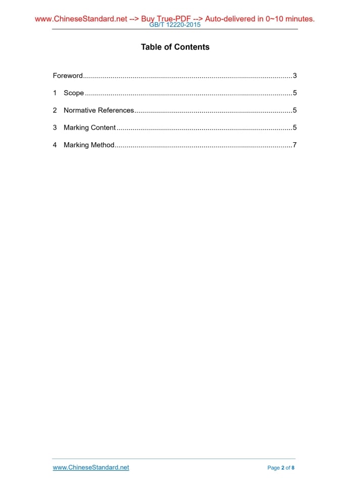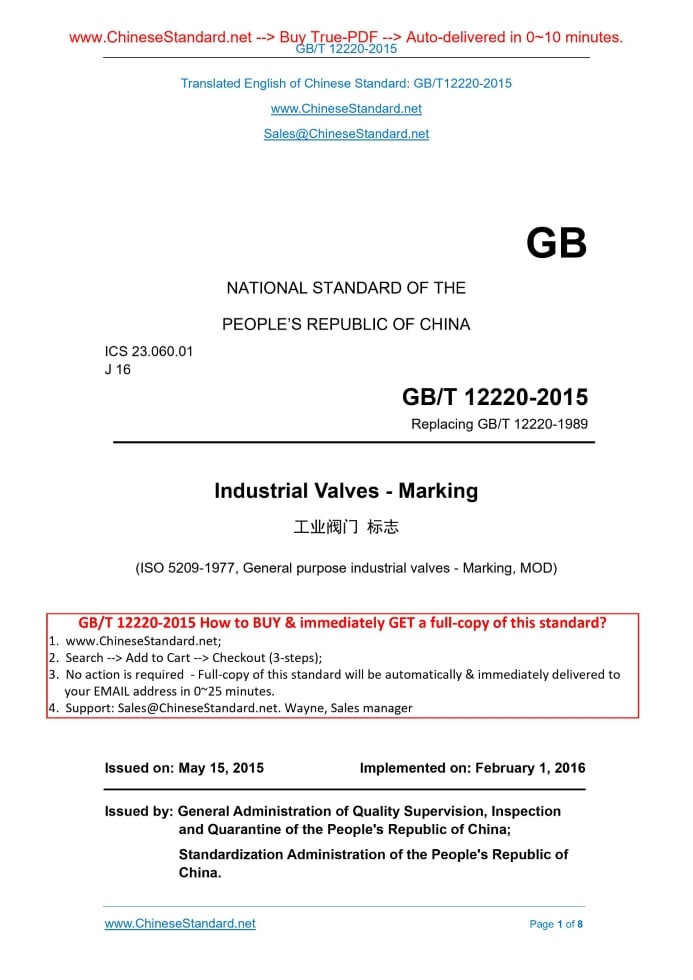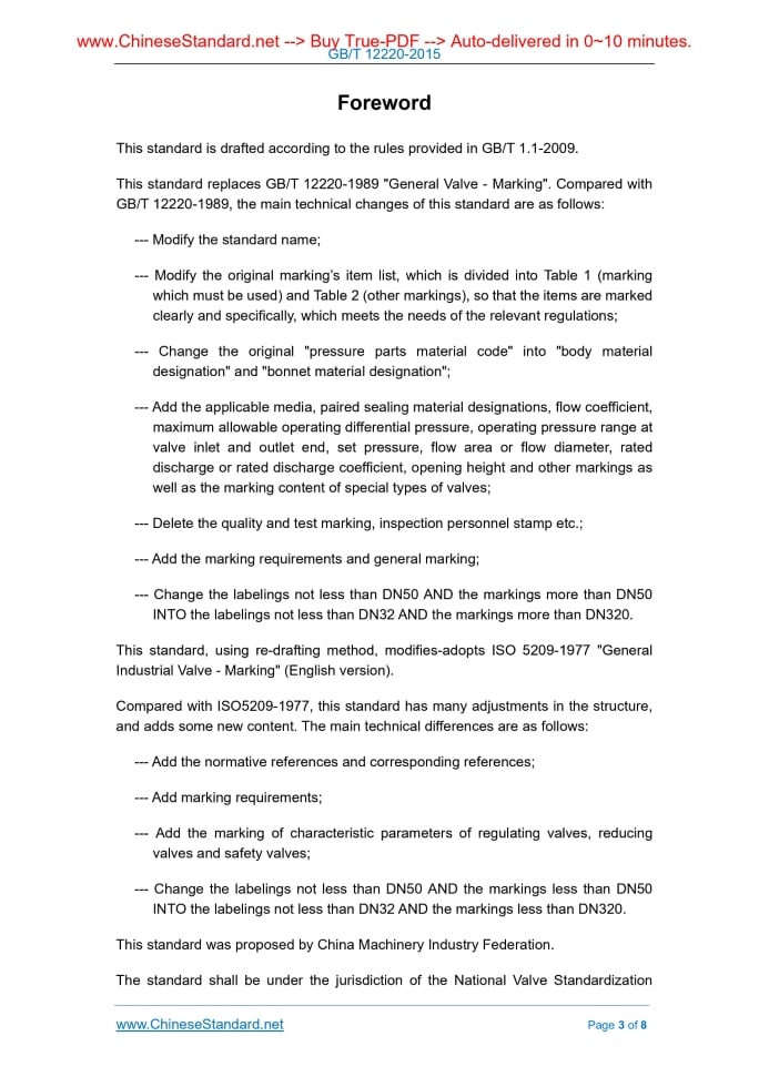 Similar standardsGB/T 12220-2015: Industrial valves -- Marking---This is an excerpt. Full copy of true-PDF in English version (including equations, symbols, images, flow-chart, tables, and figures etc.), auto-downloaded/delivered in 9 seconds, can be purchased online: https://www.ChineseStandard.net/PDF.aspx/GBT12220-2015GB NATIONAL STANDARD OF THE PEOPLE’S REPUBLIC OF CHINA ICS 23.060.01 J 16 Replacing GB/T 12220-1989 Industrial Valves - Marking (ISO 5209-1977, General purpose industrial valves - Marking, MOD) Issued on: MAY 15, 2015 Implemented on: FEBRUARY 1, 2016 Issued by. General Administration of Quality Supervision, Inspection and Quarantine of the People's Republic of China; Standardization Administration of the People's Republic of China. Table of ContentsForeword ... 3 1 Scope ... 5 2 Normative References ... 5 3 Marking Content ... 5 4 Marking Method ... 7ForewordThis standard is drafted according to the rules provided in GB/T 1.1-2009. This standard replaces GB/T 12220-1989 "General Valve - Marking". Compared with GB/T 12220-1989, the main technical changes of this standard are as follows. --- Modify the standard name; --- Modify the original marking’s item list, which is divided into Table 1 (marking which must be used) and Table 2 (other markings), so that the items are marked clearly and specifically, which meets the needs of the relevant regulations; --- Change the original "pressure parts material code" into "body material designation" and "bonnet material designation"; --- Add the applicable media, paired sealing material designations, flow coefficient, maximum allowable operating differential pressure, operating pressure range at valve inlet and outlet end, set pressure, flow area or flow diameter, rated discharge or rated discharge coefficient, opening height and other markings as well as the marking content of special types of valves; --- Delete the quality and test marking, inspection personnel stamp etc.; --- Add the marking requirements and general marking; --- Change the labelings not less than DN50 AND the markings more than DN50 INTO the labelings not less than DN32 AND the markings more than DN320. This standard, using re-drafting method, modifies-adopts ISO 5209-1977 "General Industrial Valve - Marking" (English version). Compared with ISO5209-1977, this standard has many adjustments in the structure, and adds some new content. The main technical differences are as follows. --- Add the normative references and corresponding references; --- Add marking requirements; --- Add the marking of characteristic parameters of regulating valves, reducing valves and safety valves; --- Change the labelings not less than DN50 AND the markings less than DN50 INTO the labelings not less than DN32 AND the markings less than DN320. This standard was proposed by China Machinery Industry Federation. The standard shall be under the jurisdiction of the National Valve Standardization Industrial Valves - Marking1 ScopeThis standard specifies the contents of marking and labeling methods of industrial valves. This standard applies to industrial metal valves. If any valve product standard is inconsistent with this standard, the requirements of the valve product standard prevail. For other valves, it can be implemented by referring to this standard.2 Normative ReferencesThe following documents are essential for the application of this document. For the cited documents with dates, only the dated edition applies to this document. For undated references, the latest edition (including any amendments) applies to this document. GB/T 1047 Pipework Component - Definition and Selection of DN (Nominal Size) (GB/T 1047-2005, ISO 6708.1995, MOD) GB/T 1048 Pipework Component - Definition and Selection of PN (Nominal Pressure) (GB/T 1048-2005, ISO/CD 7268.1996, MOD) GB/T 7306 (All Parts) Pipe Threads with 55 Degree Thread Angle Where Pressure- tight Joints Are Made on the Threads (GB/T 7306.1~7306.2-2000, eqv ISO 7- 1.1994) GB/T 7307 Pipe Threads with 55 Degree Thread Angle Where Pressure-Tight Joints Are not Made on the Threads (GB/T 7307-2001, eqv ISO 228-1.1994) GB/T 9113 Integral Steel Pipe Flanges GB/T 12716 Pipe Threads with 60 Degree Thread Angle Where Pressure-Tight Joints Are Made on the Threads3 Marking Content3.1 Marking which must be used by valve See Table 1 for the marking which must be used by the valves of nominal size not less ......Source: Above contents are excerpted from the full-copy PDF -- translated/reviewed by: www.ChineseStandard.net / Wayne Zheng et al. Tips & Frequently Asked Questions:Question 1: How long will the true-PDF of English version of GB/T 12220-2015 be delivered?Answer: The full copy PDF of English version of GB/T 12220-2015 can be downloaded in 9 seconds, and it will also be emailed to you in 9 seconds (double mechanisms to ensure the delivery reliably), with PDF-invoice.Question 2: Can I share the purchased PDF of GB/T 12220-2015_English with my colleagues?Answer: Yes. The purchased PDF of GB/T 12220-2015_English will be deemed to be sold to your employer/organization who actually paid for it, including your colleagues and your employer's intranet.Question 3: Does the price include tax/VAT?Answer: Yes. Our tax invoice, downloaded/delivered in 9 seconds, includes all tax/VAT and complies with 100+ countries' tax regulations (tax exempted in 100+ countries) -- See Avoidance of Double Taxation Agreements (DTAs): List of DTAs signed between Singapore and 100+ countriesQuestion 4: Do you accept my currency other than USD?Answer: Yes. www.ChineseStandard.us -- GB/T 12220-2015 -- Click this link and select your country/currency to pay, the exact amount in your currency will be printed on the invoice. Full PDF will also be downloaded/emailed in 9 seconds.Question 5: Should I purchase the latest version GB/T 12220-2015?Answer: Yes. Unless special scenarios such as technical constraints or academic study, you should always prioritize to purchase the latest version 