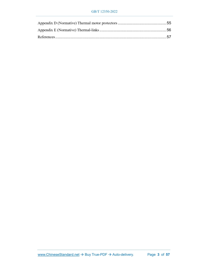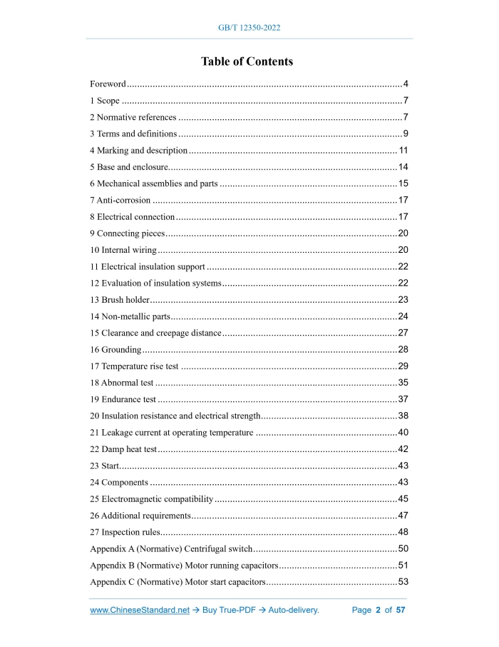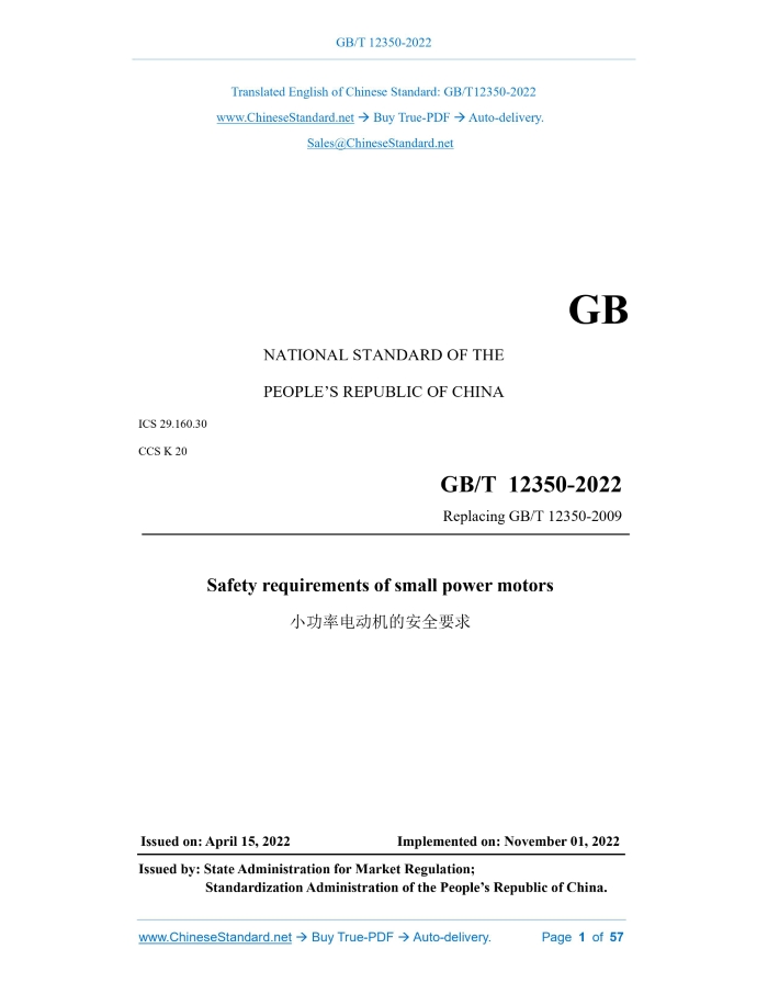 Similar standardsGB/T 12350-2022: Safety requirements of small power motors---This is an excerpt. Full copy of true-PDF in English version (including equations, symbols, images, flow-chart, tables, and figures etc.), auto-downloaded/delivered in 9 seconds, can be purchased online: https://www.ChineseStandard.net/PDF.aspx/GBT12350-2022GB NATIONAL STANDARD OF THE PEOPLE’S REPUBLIC OF CHINA ICS 29.160.30 CCS K 20 Replacing GB/T 12350-2009 Safety requirements of small power motors Issued on: APRIL 15, 2022 Implemented on: NOVEMBER 01, 2022 Issued by. State Administration for Market Regulation; Standardization Administration of the People’s Republic of China. Table of ContentsForeword... 4 1 Scope... 7 2 Normative references... 7 3 Terms and definitions... 9 4 Marking and description... 11 5 Base and enclosure... 14 6 Mechanical assemblies and parts... 15 7 Anti-corrosion... 17 8 Electrical connection... 17 9 Connecting pieces... 20 10 Internal wiring... 20 11 Electrical insulation support... 22 12 Evaluation of insulation systems... 22 13 Brush holder... 23 14 Non-metallic parts... 24 15 Clearance and creepage distance... 27 16 Grounding... 28 17 Temperature rise test... 29 18 Abnormal test... 35 19 Endurance test... 37 20 Insulation resistance and electrical strength... 38 21 Leakage current at operating temperature... 40 22 Damp heat test... 42 23 Start... 43 24 Components... 43 25 Electromagnetic compatibility... 45 26 Additional requirements... 47 27 Inspection rules... 481 ScopeThis document specifies the general safety requirements of small power motors. This document applies to small power motors (hereinafter referred to as the motors) specified in GB/T 5171.1; it also applies as a reference to the implementation of other similar motors.2 Normative referencesThe following documents are normatively referenced in this document and are indispensable for its application. For dated references, only the version corresponding to that date is applicable to this document; for undated references, the latest version (including all amendments) is applicable to this document. GB/T 755, Rotating electrical machines - Rating and performance GB/T 1971, Rotating electrical machines - Terminal markings and direction of rotation GB/T 2423.3, Environmental testing - Part 2.Testing method - Test Cab. Damp heat, steady state GB/T 2423.4, Environmental testing for electric and electronic products - Part 2. Test method - Test Db. Damp heat, cyclic (12h+12h cycle) GB/T 2423.55, Environmental testing for electric and electronic products - Part 2. Test methods - Test Eh. hammer tests GB/T 2900.25, Electrotechnical terminology - Rotating electrical machines GB/T 2900.27, Electrotechnical terminology - Small-power motor GB/T 3667.1-2016, AC motor capacitors - Part 1.General - Performance, testing and rating - Safety requirements - Guide for installation and operation GB/T 3667.2-2016, AC motor capacitors - Part 2.Motor start capacitors GB/T 4207, Method for the determination of the proof and the comparative tracking indices of solid insulating materials GB 4343.1, Electromagnetic compatibility requirements for household appliances, electric tools and similar apparatus - Part 1.Emission GB 4706.1, Household and similar electrical appliances – safety - Part 1.General requirements GB/T 4942, Degrees of protection provided by the integral design of rotating electrical machines (IP code) - Classification GB/T 5169.5, Fire hazard testing for electric and electronic products - Part 5.Test flames - Needle-flame test method - Apparatus, confirmatory test arrangement and guidance GB/T 5169.11, Fire hazard testing for electric and electronic products - Part 11. Glowing/hot-wire based test methods - Glow-wire flammability test method for end-products (GWEPT) GB/T 5169.16, Fire hazard testing for electric and electronic products - Part 16. Test flames - 50 W horizontal and vertical flame test methods GB/T 5169.21, Fire hazard testing for electric and electronic products - Part 21. Abnormal heat - Ball pressure test method3 Terms and definitionsTerms and definitions determined by GB/T 2900.25, GB/T 2900.27, GB 4706.1 and GB/T 5171.1, as well as the following, are applicable to this document. 3.1 Creepage distance The shortest path distance along the surface of insulating material between two conductive parts, or between a conductive part and an accessible surface. 3.2 Clearance The shortest spatial distance between two conductive parts, or between a conductive part and an accessible surface. 3.3 Enclosure Easy-to-reach motor surfaces, including the surfaces of motor junction box and other parts. Excluding hard-to-reach parts. 3.4 Component Special accessories for motors. Examples. centrifugal switch, capacitor, thermal protector, etc. 3.5 Insulator A component used to insulate and support conductors. 3.6 Diameter of motor Diameter measured on the circumscribed circle of the motor stator casing, excluding the dimensions of the motor’s radiation ribs, junction boxes and welds. 3.7 Pollution degree Expected degree of contamination of the microenvironment, represented by numbers. Note. Pollution degree 1.non-pollution, or only dry, non-conductive pollution, which is of no effect. Pollution degree 2.only non-conductive pollution in general; but occasional short-lived conductive pollution by must-be-expected condensation. Pollution degree 3.conductive pollution; or conductive pollution changed from dry non-conductive pollution due to expected condensation. Pollution degree 4.persistent conductive pollution, for example, caused by conductive dust or rain or snow. 3.8 Basic insulation Insulation applied to live parts to provide basic protection against electric shock. 3.9 Supplementary insulation Separate insulation additionally applied to basic insulation in order to provide protection against electric shock in the event of failure of the basic insulation.4 Marking and description4.1 Each motor shall have a firm nameplate ind