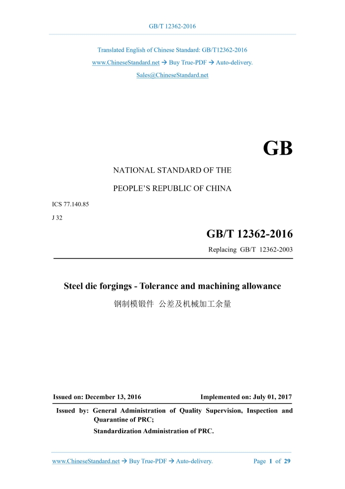 GB/T 12362-2016: Steel die forgings - Tolerance and machining allowance Delivery: 9 seconds. True-PDF full-copy in English & invoice will be downloaded + auto-delivered via email. See step-by-step procedure Status: Valid GB/T 12362: Historical versions