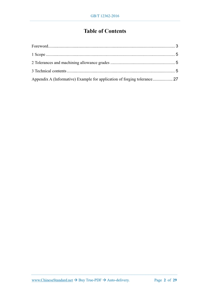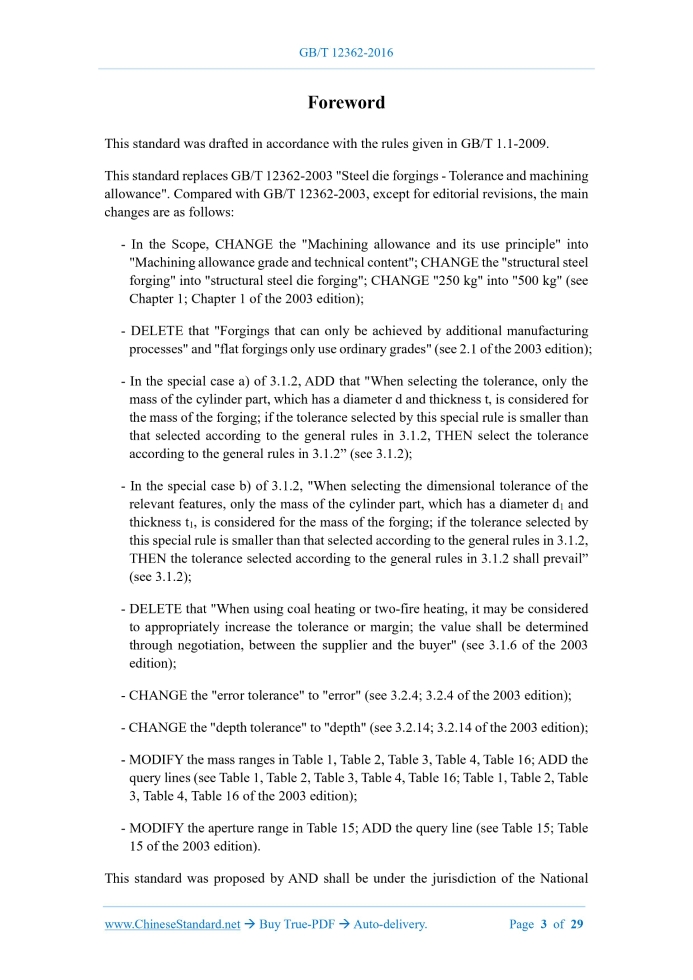 Similar standardsGB/T 12362-2016: Steel die forgings - Tolerance and machining allowance---This is an excerpt. Full copy of true-PDF in English version (including equations, symbols, images, flow-chart, tables, and figures etc.), auto-downloaded/delivered in 9 seconds, can be purchased online: https://www.ChineseStandard.net/PDF.aspx/GBT12362-2016NATIONAL STANDARD OF THE PEOPLE’S REPUBLIC OF CHINA ICS 77.140.85 J 32 Replacing GB/T 12362-2003 Steel die forgings - Tolerance and machining allowance Issued on. DECEMBER 13, 2016 Implemented on. JULY 01, 2017 Issued by. General Administration of Quality Supervision, Inspection and Quarantine of PRC; Standardization Administration of PRC. Table of ContentsForeword... 3 1 Scope... 5 2 Tolerances and machining allowance grades... 5 3 Technical contents... 5 Appendix A (Informative) Example for application of forging tolerance... 27ForewordThis standard was drafted in accordance with the rules given in GB/T 1.1-2009. This standard replaces GB/T 12362-2003 "Steel die forgings - Tolerance and machining allowance". Compared with GB/T 12362-2003, except for editorial revisions, the main changes are as follows. - In the Scope, CHANGE the "Machining allowance and its use principle" into "Machining allowance grade and technical content"; CHANGE the "structural steel forging" into "structural steel die forging"; CHANGE "250 kg" into "500 kg" (see Chapter 1; Chapter 1 of the 2003 edition); - DELETE that "Forgings that can only be achieved by additional manufacturing processes" and "flat forgings only use ordinary grades" (see 2.1 of the 2003 edition); - In the special case a) of 3.1.2, ADD that "When selecting the tolerance, only the mass of the cylinder part, which has a diameter d and thickness t, is considered for the mass of the forging; if the tolerance selected by this special rule is smaller than that selected according to the general rules in 3.1.2, THEN select the tolerance according to the general rules in 3.1.2” (see 3.1.2); - In the special case b) of 3.1.2, "When selecting the dimensional tolerance of the relevant features, only the mass of the cylinder part, which has a diameter d1 and thickness t1, is considered for the mass of the forging; if the tolerance selected by this special rule is smaller than that selected according to the general rules in 3.1.2, THEN the tolerance selected according to the general rules in 3.1.2 shall prevail” (see 3.1.2); - DELETE that "When using coal heating or two-fire heating, it may be considered to appropriately increase the tolerance or margin; the value shall be determined through negotiation, between the supplier and the buyer" (see 3.1.6 of the 2003 edition); - CHANGE the "error tolerance" to "error" (see 3.2.4; 3.2.4 of the 2003 edition); - CHANGE the "depth tolerance" to "depth" (see 3.2.14; 3.2.14 of the 2003 edition); - MODIFY the mass ranges in Table 1, Table 2, Table 3, Table 4, Table 16; ADD the query lines (see Table 1, Table 2, Table 3, Table 4, Table 16; Table 1, Table 2, Table 3, Table 4, Table 16 of the 2003 edition); - MODIFY the aperture range in Table 15; ADD the query line (see Table 15; Table 15 of the 2003 edition). This standard was proposed by AND shall be under the jurisdiction of the National Forging Standardization Technical Committee (SAC/TC 74). Drafting organizations of this standard. Dongfeng Forging Co., Ltd., Beijing Electromechanical Research Institute. The main drafters of this standard. Wu Yujian, Wu Tingsong, Wei Wei, Jin Hong, Zhao Yeqin, Chen Wenjing, Cheng Chenwen. This standard replaces the standard previously issued as follows. - GB/T 12362-1990, GB/T 12362-2003. Steel die forgings - Tolerance and machining allowance1 ScopeThis standard specifies the tolerances, machining allowance grades, technical content of steel die forgings (hereinafter referred to as "forgings"). This standard applies to structural steel die forgings, which are produced by forging hammers, hot die forging presses, screw presses, flat forging machines and other forging equipment. Forgings of other steel grades can also make reference to this standard. This standard applies to forgings, which have a mass less than or equal to 500 kg and a length (maximum dimension) less than or equal to 2500 mm.2 Tolerances and machining allowance grades2.1 The tolerances in this standard are divided into two grades. ordinary grade and precision grade. Ordinary tolerances are suitable for forgings, that can meet technical requirements in general die forging processes. 2.2 Only one grade is used for machining allowance.3 Technical contents3.1 Main factors for determining forging tolerances and machining allowances 3.1.3 Forging material factor M The forging material factor is divided into two grades. M1 and M2. Grade M1.Carbon steel which has a maximum carbon content of less than 0.65%, OR alloy steel which has a total alloying element content of less than 3%. Grade M2.Carbon steel which has a maximum carbon content greater than or equal to 0.65%, OR alloy steel which has a total content of alloy elements greater than or equal to 3%. 3.2 Tolerance 3.2.1 Length, width, height tolerances 3.2.8 Steps and thickness tolerances of flat forgings 3.2.8.1 Step dimensional tolerances The step dimension refers to the dimension p of the upsetting part, along the axial direction (Figure 12); its dimensional tolerance is determined by Table 1. 3.2.8.2 Thickness dimension tolerance The thickness dimension refers to the dimension, t, from the punch across the parting line to the die (Figure 12); its tolerance value is determined in Table 3, according to the maximum thickness dimension. 3.2.9 Concentricity tolerance of flat forgings The coaxiality tolerance of flat forgings refers to the allowable offset value of the axis of the forming part of the punch, to the axis of the forming outer diameter of the die. The coaxiality tolerance is determined by Table 1; 3.2.10 Local deformation tolerance of flat forgings For the connec