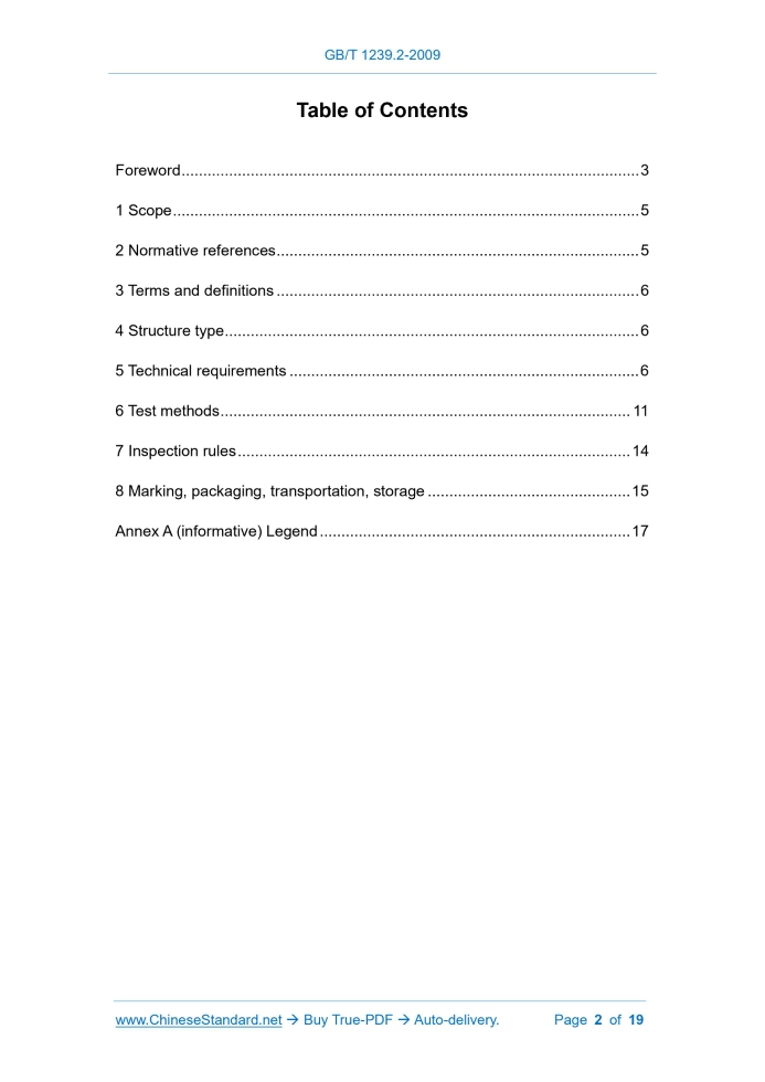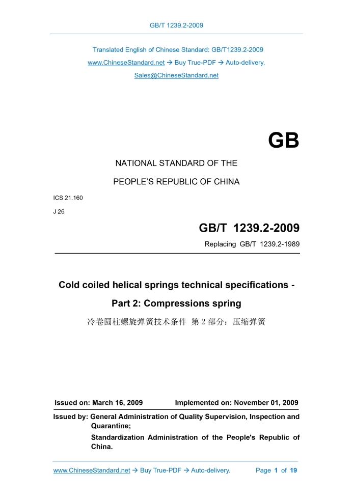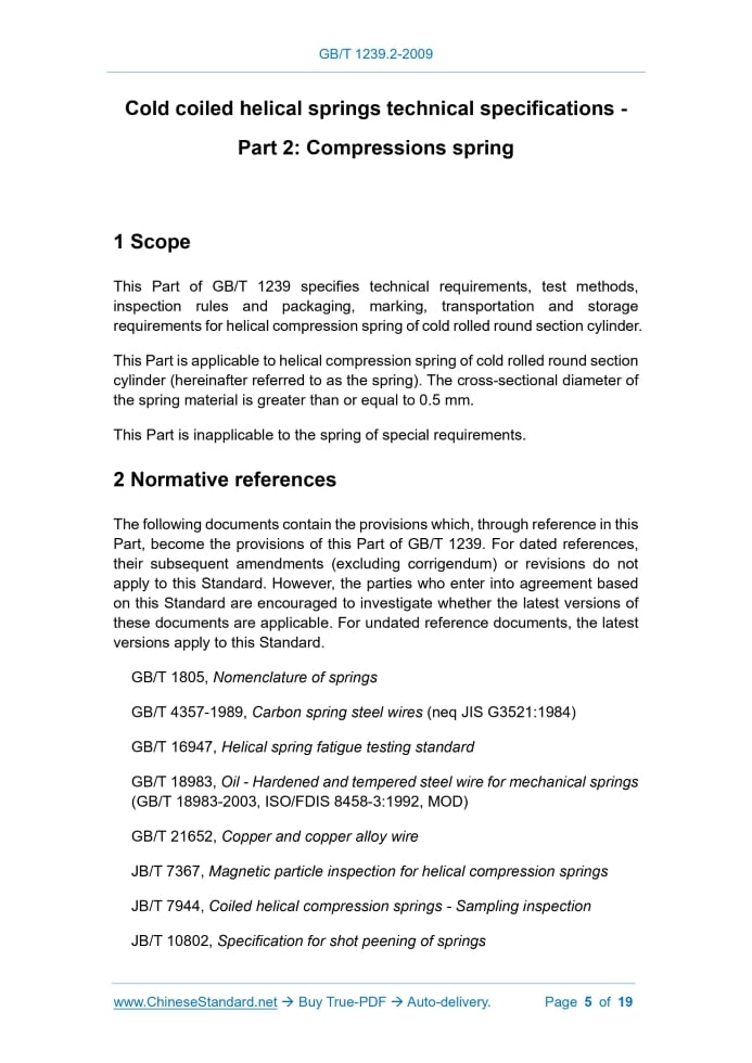 Similar standardsGB/T 1239.2-2009: Cold coiled helical springs technical specifications - Part 2: Compressions spring---This is an excerpt. Full copy of true-PDF in English version (including equations, symbols, images, flow-chart, tables, and figures etc.), auto-downloaded/delivered in 9 seconds, can be purchased online: https://www.ChineseStandard.net/PDF.aspx/GBT1239.2-2009 GB NATIONAL STANDARD OF THE PEOPLE’S REPUBLIC OF CHINA ICS 21.160 J 26 Replacing GB/T 1239.2-1989 Cold coiled helical springs technical specifications - Part 2.Compressions spring Issued on. MARCH 16, 2009 Implemented on. NOVEMBER 01, 2009 Issued by. General Administration of Quality Supervision, Inspection and Quarantine; Standardization Administration of the People's Republic of China. Table of ContentsForeword... 3 1 Scope... 5 2 Normative references... 5 3 Terms and definitions... 6 4 Structure type... 6 5 Technical requirements... 6 6 Test methods... 11 7 Inspection rules... 14 8 Marking, packaging, transportation, storage... 15 Annex A (informative) Legend... 17ForewordGB/T 1239 "Cold coiled helical springs technical specifications" consists of the following three parts. - Part 1.Extension Spring; - Part 2.Compressions spring; - Part 3.Torsion spring. This Part is Part 2 of GB/T 1239. This Part is a revision to GB/T 1239.2-1989 "Cold coiled helical compressions springs - Technical specifications". During the revision, the effective parts of GB/T 1239.2-1989 "Cold coiled helical compressions springs - Technical specifications" are remained. It revised the content that has become unsuitable. The main technical differences between this Part and the revised standard are as follows. - according to GB/T 1805-2001 "Nomenclature of springs", it revised the symbols such as load, stiffness, and deformation in the original standard; - due to the renewal of materials, a comprehensive review of the referenced material standards has been carried out; replaced the old version cited in the original standard with the latest version that has been revised; - added the selection conditions and direction of spring characteristics; expanded the range of spring winding ratio; - due to the changes in the supply of raw materials, the production and manufacturing models have changed, so it deleted the provisions that use soft conditions such as annealing material; - added the measuring methods of straightness and compression height; - added the classification of spring inspection items; - adjusted the order of chapters so that the order of chapters of GB/T 1239.1~1239.3 is consistent. Annex A of this Part is informative. This Part was proposed by China Machinery Industry Federation. This Part shall be under the jurisdiction of National Technical Committee on Springs of Standardization Administration of China (SAC/TC 235). Main drafting organizations of this Part. Hangzhou Spring Co., Ltd., China Machinery Productivity Promotion Center. The drafting organizations of this Standard. Changzhou Mingjin Spring Co., Ltd., People's Liberation Army 101 Strong Spring Research Institute, Zhejiang Meili Spring Co., Ltd., Zhejiang Jinchang Spring Co., Ltd., Qianjiang Spring Co., Ltd., Wuxi Weifu Accuracy Machinery Manufacturing Co., Ltd. Spring Factory, Beijing Spring Factory, Li Zhou (Fujian) Spring Co., Ltd., Hangzhou Fuchun Spring Co., Ltd., Wuxi Fengli Spring Co., Ltd. Main drafters of this Standard. Jiang Xiaowei, Yang Weiming, Jiang Ying, Shu Rongfu, Cao Huirong, Jiang Xinrong, Wu Gang, Chen Jie, He Yongyi, Yan Shiping, Wang Wei, Zhang Bihong, Zhang Yongsen, Shao Wenwu, You Weiming, Lu Peigen, Zhao Zhipeng. Versions of standard substituted by this Standard are. - GB 1239-1976, GB/T 1239.2-1989. Cold coiled helical springs technical specifications - Part 2.Compressions spring1 ScopeThis Part of GB/T 1239 specifies technical requirements, test methods, inspection rules and packaging, marking, transportation and storage requirements for helical compression spring of cold rolled round section cylinder. This Part is applicable to helical compression spring of cold rolled round section cylinder (hereinafter referred to as the spring). The cross-sectional diameter of the spring material is greater than or equal to 0.5 mm. This Part is inapplicable to the spring of special requirements.2 Normative referencesThe following documents contain the provisions which, through reference in this Part, become the provisions of this Part of GB/T 1239.For dated references, their subsequent amendments (excluding corrigendum) or revisions do not apply to this Standard. However, the parties who enter into agreement based on this Standard are encouraged to investigate whether the latest versions of these documents are applicable. For undated reference documents, the latest versions apply to this Standard. GB/T 1805, Nomenclature of springs GB/T 4357-1989, Carbon spring steel wires (neq JIS G3521.1984) GB/T 16947, Helical spring fatigue testing standard GB/T 18983, Oil - Hardened and tempered steel wire for mechanical springs (GB/T 18983-2003, ISO/FDIS 8458-3.1992, MOD) GB/T 21652, Copper and copper alloy wire JB/T 7367, Magnetic particle inspection for helical compression springs3 Terms and definitionsFor the purposes of this Part of GB/T 1239, the terms and definitions defined in GB/T 1805 apply.4 Structure typeSee Table 1 for the structure type of the spring end.5 Technical requirementsProducts shall be manufactured in accordance with product drawings and technical documents approved by prescribed procedures. 5.1 Materials 5.1.1 The spring generally uses the materials specified in Table 2.If other materials are needed, it shall be negotiated between the supplier and the purchaser. 5.2 Limit deviation level The limit deviation of spring size and characteristics is divided into three grades. 1, 2, 3.Each item level shall be independently selected according to the needs of use. 5.3 Dimensional parameters and limit deviation 5.3.1 Inner diameter or outer diameter Th