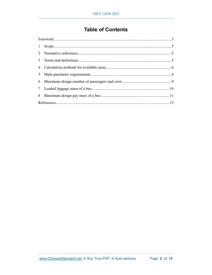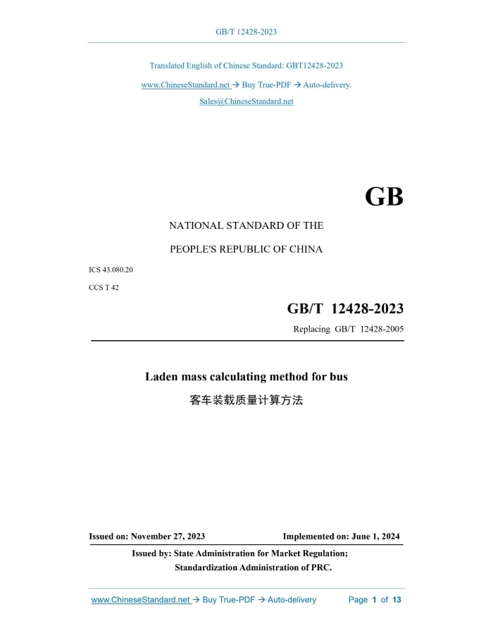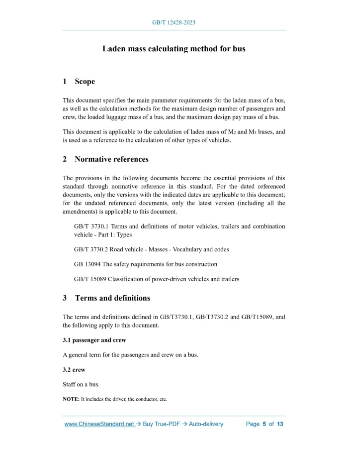Similar standardsGB/T 12428-2023: Laden mass calculating method for bus---This is an excerpt. Full copy of true-PDF in English version (including equations, symbols, images, flow-chart, tables, and figures etc.), auto-downloaded/delivered in 9 seconds, can be purchased online: https://www.ChineseStandard.net/PDF.aspx/GBT12428-2023GB NATIONAL STANDARD OF THE PEOPLE'S REPUBLIC OF CHINA ICS 43.080.20 CCS T 42 Replacing GB/T 12428-2005 Laden mass calculating method for bus Issued on. NOVEMBER 27, 2023 Implemented on. JUNE 1, 2024 Issued by. State Administration for Market Regulation; Standardization Administration of PRC. Table of ContentsForeword... 3 1 Scope... 5 2 Normative references... 5 3 Terms and definitions... 5 4 Calculation methods for available areas... 6 5 Main parameter requirements... 8 6 Maximum design number of passengers and crew... 9 7 Loaded luggage mass of a bus... 10 8 Maximum design pay mass of a bus... 11 References... 13ForewordThis document was drafted in accordance with the provisions of GB/T1.1-2020 Directives for standardization - Part 1.Rules for the structure and drafting of standardizing documents. This document replaces GB/T 12428-2005 Laden mass calculating method for buses. Compared with GB/T 12428-2005, in addition to structural adjustments and editorial changes, the main technical changes are as follows. a) The term "passengers" is deleted (see 3.2 of the 2005 edition); b) The terms "crew" and "volume of luggage compartment" are added (see 3.2 and 3.8); c) The definitions of the terms "surface area available for passenger compartment" and "surface area available for standing passenger" are changed (see 3.4 and 3.5; see 3.4 and 3.5 of the 2005 edition); d) The calculation method of the available surface area is added (see Chapter 4); e) The average passenger mass is changed (see Table 1; see Table 1 of the 2005 edition); f) The method for calculating the number of passengers and crew is changed (see Chapter 6; see Chapter 7 of the 2005 edition); g) The method for calculating the loaded luggage mass of a bus is changed (see Chapter 7; see Chapter 8 of the 2005 edition); h) The calculation method for the maximum design pay mass of a bus is changed (see Chapter 8; see Chapter 9 of the 2005 edition). Please note that some content in this document may be subject to patents. The publisher of this document assumes no responsibility for identifying patents. This document is proposed by the Ministry of Industry and Information Technology of the People's Republic of China. This document is under the jurisdiction of the National Technical Committee of Auto Standardization (SAC/TC114). Drafting organizations of this document. China Highway Vehicle & Machinery Co., Ltd., Chang'an University, Yutong Bus Co., Ltd., Xiamen Golden Dragon Bus Co., Ltd., CRRC Times Electric Vehicle Co., Ltd., Zhongtong Bus Holding Co., Ltd., BYD Auto Industry Co., Ltd., Higer Bus Co., Ltd., China Automotive Engineering Research Institute Co., Ltd., China Merchants Testing Vehicle Technology Research Institute Co., Ltd. Main drafters of this document. Yu Yali, Shen Fulin, Song Jiangquan, Guo Jingang, Kang Tuanjie, Chen Yan, Liang Bo, Liu Houlin, Shi Hong, Cai Pengfei, Li Wei, Chu Guanyao, Li Zhaokai. This document was first published in 1990, and revised for the first time in 2005; this is the second revision. Laden mass calculating method for bus1 ScopeThis document specifies the main parameter requirements for the laden mass of a bus, as well as the calculation methods for the maximum design number of passengers and crew, the loaded luggage mass of a bus, and the maximum design pay mass of a bus. This document is applicable to the calculation of laden mass of M2 and M3 buses, and is used as a reference to the calculation of other types of vehicles.2 Normative referencesThe provisions in the following documents become the essential provisions of this standard through normative reference in this standard. For the dated referenced documents, only the versions with the indicated dates are applicable to this document; for the undated referenced documents, only the latest version (including all the amendments) is applicable to this document. GB/T 3730.1 Terms and definitions of motor vehicles, trailers and combination vehicle - Part 1.Types GB/T 3730.2 Road vehicle - Masses - Vocabulary and codes GB 13094 The safety requirements for bus construction GB/T 15089 Classification of power-driven vehicles and trailers3 Terms and definitionsThe terms and definitions defined in GB/T3730.1, GB/T3730.2 and GB/T15089, and the following apply to this document. 3.1 passenger and crew A general term for the passengers and crew on a bus. 3.2 crew Staff on a bus. NOTE. It includes the driver, the conductor, etc. 3.3 passenger compartment A space on a bus dedicated to passengers. 3.7 bulky luggage Other luggage carried by passengers and placed in the luggage compartment except for hand luggage. 3.8 volume of luggage compartment The available volume for bulky luggage when the bus is in operation.4 Calculation methods for available areas4.1 Calculation of surface area available for passenger compartment The surface area available for passenger compartment shall be calculated by subtracting the following areas from the total horizontal projected area inside the bus (no double calculations). 4.2 Calculation of surface area available for standing passengers The surface area available for standing passengers shall be calculated by subtracting the following areas from the surface area available for passenger compartment (no double calculation).5 Main parameter requirements5.1 Per capita mass of (passenger and crew) 5.1.1 The per capita mass of (passengers and crew) includes the average mass per passenger and the per capita mass of the crew. The values shall comply with the provisions of Table 1. 5.2 Surface area available per standing passenger The surface area available per standing passenger (Ssp) shall comply with th
