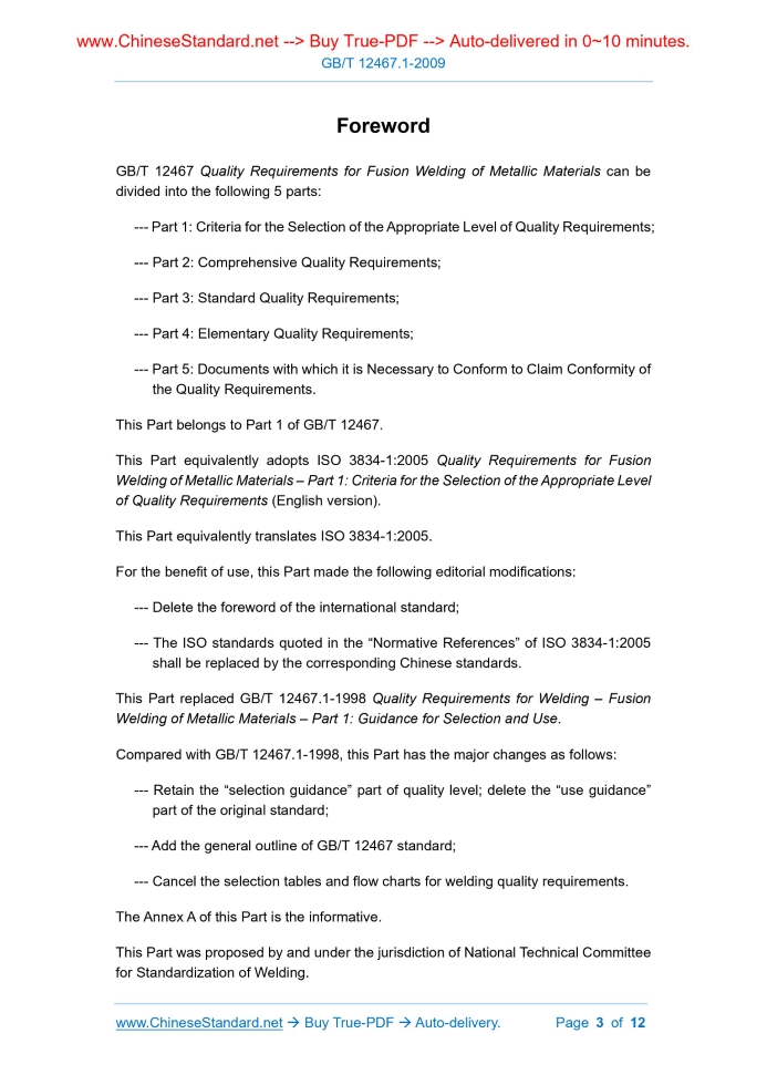 Similar standardsGB/T 12467.1-2009: Quality requirements for fusion welding of metallic materials -- Part 1: Criteria for the selection of the appropriate level of quality requirements---This is an excerpt. Full copy of true-PDF in English version (including equations, symbols, images, flow-chart, tables, and figures etc.), auto-downloaded/delivered in 9 seconds, can be purchased online: https://www.ChineseStandard.net/PDF.aspx/GBT12467.1-2009 Quality reqirements for fusion welding of metallic materials. Part 1. Criteria for the selection of the appropriate level of quality requirements ICS 25.160.01 J33 National Standards of People's Republic of China GB/T 12467.1-2009/ISO 3834-1.2005 Replace GB/T 12467.1-1998 Metal material welding quality requirements Part 1. Quality requirements corresponding level Selection criteria (ISO 3834-1.2005, IDT) Released on.2009-10-30 2010-04-01 implementation General Administration of Quality Supervision, Inspection and Quarantine of the People's Republic of China China National Standardization Administration issued ForewordGB/T 12467 "Metal material fusion welding quality requirements" is divided into five parts. --- Part 1. Selection criteria for the corresponding level of quality requirements; --- Part 2. Complete quality requirements; --- Part 3. General quality requirements; --- Part 4. Basic quality requirements; --- Part 5. Standard guidelines for meeting quality requirements. This part is the first part of GB/T 12467. This part is equivalent to ISO 3834-1.2005 "Quality requirements for fusion welding of metallic materials - Part 1. Selection of corresponding grades of quality requirements Guidelines (English version). This section is equivalent to translation ISO 3834-1.2005. For ease of use, this section has made the following editorial changes. --- Removed the preface to international standards; --- Replace the ISO standard referenced in ISO 3834-1.2005 "normative reference documents" with equivalent Chinese standards. This part replaces GB/T 12467.1-1998 "Welding quality requirements - Fusion welding of metallic materials - Part 1. Selection and use guide". The main changes in this section compared with GB/T 12467.1-1998 are as follows. ---Retained the "Selection Guide" section of the quality level, and removed the "Application Guide" section of the original standard; --- Added "Overall overview of GB/T 12467 standard"; --- Cancel the selection form and flow chart of welding quality requirements. Appendix A of this section is an informative annex. This part is proposed and managed by the National Welding Standardization Technical Committee. This section drafted by. Harbin Welding Research Institute, Harbin Welding Technology Training Center of Machinery Industry. The main drafters of this section. Pu Dongguang, Jie Yinglong, Wang Lin, Chen Yu, Su Jinhua. The previous versions of the standards replaced by this section are. ---GB/T 12467.1-1998; ---GB/T 12467-1990, GB/T 12468-1990. GB/T 12467.1-2009/ISO 3834-1.2005 Metal material welding quality requirements Part 1. Quality requirements corresponding level Selection criteria1 ScopeThis part of GB/T 12467 specifies the criteria to be considered when selecting the quality level of fusion welding of metal materials. This section applies to welding manufacturing in the workshop and on site.2 Normative referencesThe provisions in the following documents become the provisions of this part by reference to this part of GB/T 12467. Quotations with dated , all subsequent amendments (not including errata content) or revisions do not apply to this section, however, encouragement is achieved under this section The parties to the agreement study whether the latest versions of these documents can be used. For undated references, the latest edition applies to this section. GB/T 19000 Quality Management System Foundation and Terminology (GB/T 19000-2008, ISO 9000.2005, IDT)3 Terms and definitionsThe following terms and definitions established by GB/T 19000 apply to this section. 3.1 Product requirements as specified by the user (or user organization, or by rules). Design technical conditions may also include relevant requirements such as. Technical specifications, product standards, process standards, contractual agreements and regulatory requirements. Note. Products and certain process-related requirements may also be included, such as. technical specifications, product standards, process standards, contractual agreements and rules. Claim. 3.2 People who have acquired sufficient skills and knowledge through education, training, and or related practices. Note. In order to demonstrate their abilities and knowledge, a qualification exam may be required. 3.3 Product, component or all welded parts. 3.4 The person or organization responsible for the welding manufacturing. 3.5 Suppliers of products, services and/or activities are provided to manufacturers under contractual conditions. 3.6 A person who performs mechanized or automated fusion welding operations. GB/T 12467.1-2009/ISO 3834-1.2005 Overall overview of 4 GB/T 12467 GB/T 12467 specifies the quality requirements for fusion welding of metal materials. These quality requirements contained in this section may also apply to other Welding method. These quality requirements relate only to those aspects of product quality that are affected by fusion welding and are not limited by product type. GB/T 12467 provides a means for manufacturers to demonstrate their ability to manufacture specific quality products. The development of standards is based on the following considerations. a) the standard is not limited by the type of manufacturing structure; b) the standard specifies the quality requirements for the workshop and or on-site welding; c) standards provide guidance for describing the ability of manufacturers to produce structures that meet specified requirements; d) The standard provides the basis for evaluating the manufacturer's welding capabilities. Manufacturer