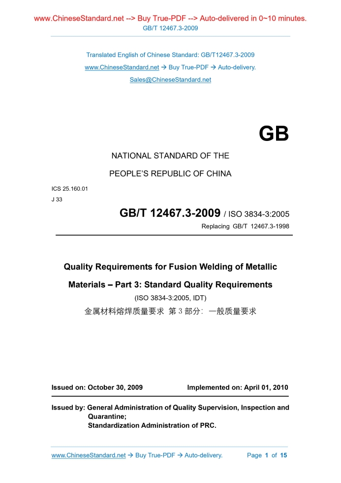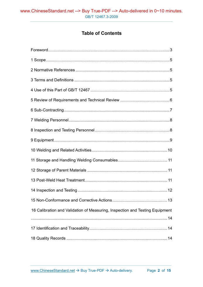 Similar standardsGB/T 12467.3-2009: Quality requirements for fusion welding of metallic materials -- Part 3: Standard quality requirements---This is an excerpt. Full copy of true-PDF in English version (including equations, symbols, images, flow-chart, tables, and figures etc.), auto-downloaded/delivered in 9 seconds, can be purchased online: https://www.ChineseStandard.net/PDF.aspx/GBT12467.3-2009 Quality requirements for fusion welding of metallic materials.Part 3. Standard quality requirements ICS 25.160.01 J33 National Standards of People's Republic of China GB/T 12467.3-2009/ISO 3834-3.2005 Replace GB/T 12467.3-1998 Metal material welding quality requirements Part 3. General quality requirements (ISO 3834-3.2005, IDT) Released on.2009-10-30 2010-04-01 implementation General Administration of Quality Supervision, Inspection and Quarantine of the People's Republic of China China National Standardization Administration issued Content Foreword I 1 Scope 1 2 Normative references 1 3 Terms and Definitions 1 4 GB/T 12467 use of this part 1 5 Requirements review and technical review 1 6 points contract 2 7 welding staff 2 8 Test and inspection personnel 3 9 equipment 3 10 Welding and related activities 3 11 Welding materials storage and storage 4 12 Storage of base metal 4 13 Post-weld heat treatment 4 14 Tests and tests 4 15 Non-conformities and corrective actions 5 16 Calibration of test, test and inspection equipment 5 17 Marking and traceability 5 18 Quality Report 6 GB/T 12467.3-2009/ISO 3834-3.2005 ForewordGB/T 12467 "Metal material fusion welding quality requirements" is divided into five parts. --- Part 1. Selection criteria for the corresponding level of quality requirements; --- Part 2. Complete quality requirements; --- Part 3. General quality requirements; --- Part 4. Basic quality requirements; --- Part 5. Standard documents to be based on the quality requirements. This part is the third part of GB/T 12467. This part is equivalent to ISO 3834-3.2005 "Metal material fusion welding quality requirements Part 3. General quality requirements" (English version). This section is equivalent to translation ISO 3834-3.2005. For ease of use, this section has made the following editorial changes. --- Removed the preface to international standards; --- Replace the ISO standard referenced in the ISO 3834-3.2005 "normative reference document" with the equivalent of our national standard. This part replaces GB/T 12467.3-1998 "Welding quality requirements - Fusion welding of metallic materials - Part 3. General quality begging". The main changes in this section compared with GB/T 12467.3-1998 are as follows. --- Cancel the conditions for providing a suitable framework for welding control within the scope of application; --- "Contract review" and "design review" were revised to "required review" and "technical review"; --- Canceled Appendix A. This part is proposed and managed by the National Welding Standardization Technical Committee. This section is responsible for drafting units. Harbin Welding Technology Training Center of Machinery Industry, Harbin Welding Research Institute. The main drafters of this section. Chen Yu, Pu Dongguang, Jie Yinglong, Deng Yigang, Wang Lin. The previous versions of the standards replaced by this section are. ---GB/T 12467.3-1998. GB/T 12467.3-2009/ISO 3834-3.2005 Metal material welding quality requirements Part 3. General quality requirements1 ScopeThis part of GB/T 12467 specifies the general quality requirements for fusion welding of metallic materials. This section applies to welding in the workshop and on site.2 Normative referencesThe provisions in the following documents become the provisions of this part by reference to this part of GB/T 12467. Quotations with dated , all subsequent amendments (not including errata content) or revisions do not apply to this section, however, encouragement is achieved under this section The parties to the agreement study whether the latest versions of these documents can be used. For undated references, the latest edition applies to this section. GB/T 12467.1 Metallic materials - Welding quality requirements - Part 1. Selection criteria for quality requirements (GB/T 12467.1-2009, ISO 3834-1.2005, IDT) GB/T 12467.5-2009 Metallic materials - Welding quality requirements - Part 5. Standard documents to be used to meet quality requirements (ISO 3834-5.2005, IDT)3 Terms and definitionsThe terms and definitions established in GB/T 12467.1 apply to this section. 4 GB/T 12467 use of this part The general principles of application of this section can be found in the provisions of GB/T 12467.1. When confirming whether the quality requirements specified in this section are met, the relevant standard requirements specified in GB/T 12467.5-2009 can be checked. This section specifies the general quality requirements under normal conditions, but in some cases, the manufacturer may be based on specific product conditions and needs. Seek selective exchange (such as GB/T 12467.4).5 Request for review and technical review5.1 General The manufacturer shall review all design data in response to the contractual requirements and all other requirements. Manufacturers should establish a mechanism to ensure that the information required for production operations is complete and feasible before the start of work. When conducting requirements review and technical review, the manufacturer should focus on its ability to meet all requirements; all quality activities have Appropriate plan; relevant documents are clear, accurate and non-controversial; have sufficient resources to ensure timely delivery. Manufacturer should guarantee contract and previous report Changes between price documents are easily identifiable, allowing users to understand all the changes in procedures, costs, or engineering that may arise. Typical amounts that should be considered at the time of the review (or before) are listed in 5.2. The main contents of the technical review a