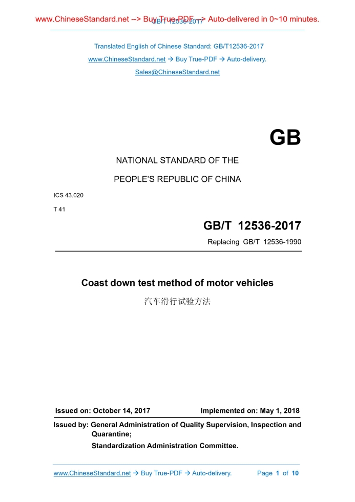 GB/T 12536-2017: Coast down test method of motor vehicles Delivery: 9 seconds. True-PDF full-copy in English & invoice will be downloaded + auto-delivered via email. See step-by-step procedure Status: Valid GB/T 12536: Historical versions