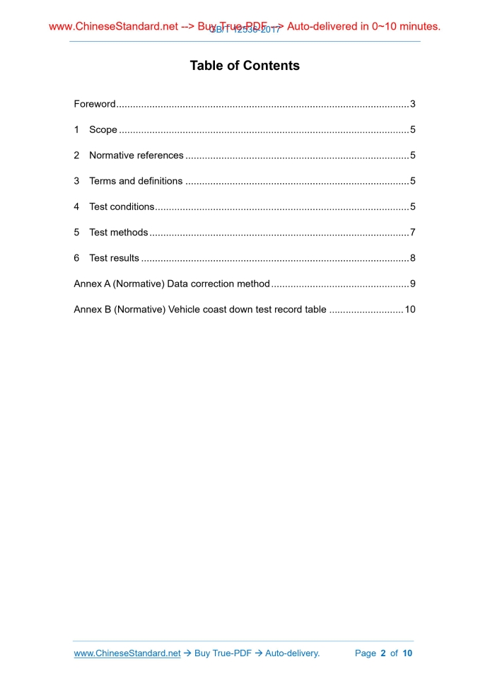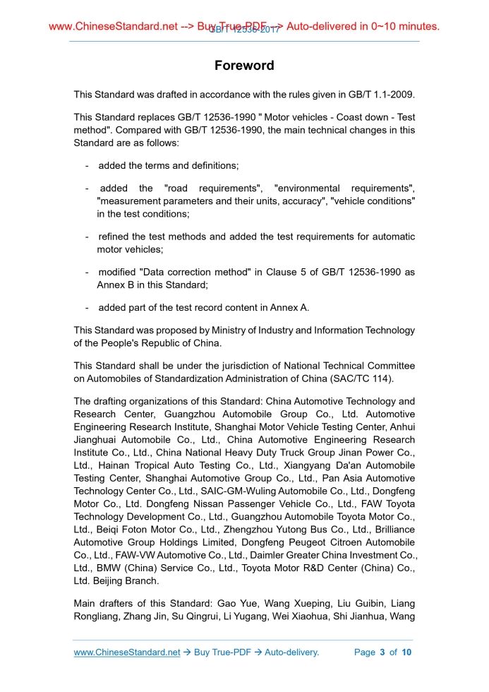 Similar standardsGB/T 12536-2017: Coast down test method of motor vehicles---This is an excerpt. Full copy of true-PDF in English version (including equations, symbols, images, flow-chart, tables, and figures etc.), auto-downloaded/delivered in 9 seconds, can be purchased online: https://www.ChineseStandard.net/PDF.aspx/GBT12536-2017GB NATIONAL STANDARD OF THE PEOPLE’S REPUBLIC OF CHINA ICS 43.020 T 41 Replacing GB/T 12536-1990 Coast down test method of motor vehicles Issued on: OCTOBER 14, 2017 Implemented on: MAY 1, 2018 Issued by. General Administration of Quality Supervision, Inspection and Quarantine; Standardization Administration Committee. Table of ContentsForeword . 3 1 Scope .. 5 2 Normative references . 5 3 Terms and definitions . 5 4 Test conditions . 5 5 Test methods .. 7 6 Test results .. 8 Annex A (Normative) Data correction method . 9 Annex B (Normative) Vehicle coast down test record table . 10 Foreword This Standard was drafted in accordance with the rules given in GB/T 1.1-2009. This Standard replaces GB/T 12536-1990 " Motor vehicles - Coast down - Test method". Compared with GB/T 12536-1990, the main technical changes in this Standard are as follows. - added the terms and definitions; - added the "road requirements", "environmental requirements", "measurement parameters and their units, accuracy", "vehicle conditions" in the test conditions; - refined the test methods and added the test requirements for automatic motor vehicles; - modified "Data correction method" in Clause 5 of GB/T 12536-1990 as Annex B in this Standard; - added part of the test record content in Annex A. This Standard was proposed by Ministry of Industry and Information Technology of the People's Republic of China. This Standard shall be under the jurisdiction of National Technical Committee on Automobiles of Standardization Administration of China (SAC/TC 114). The drafting organizations of this Standard. China Automotive Technology and Research Center, Guangzhou Automobile Group Co., Ltd. Automotive Engineering Research Institute, Shanghai Motor Vehicle Testing Center, Anhui Jianghuai Automobile Co., Ltd., China Automotive Engineering Research Institute Co., Ltd., China National Heavy Duty Truck Group Jinan Power Co., Ltd., Hainan Tropical Auto Testing Co., Ltd., Xiangyang Da'an Automobile Testing Center, Shanghai Automotive Group Co., Ltd., Pan Asia Automotive Technology Center Co., Ltd., SAIC-GM-Wuling Automobile Co., Ltd., Dongfeng Motor Co., Ltd. Dongfeng Nissan Passenger Vehicle Co., Ltd., FAW Toyota Technology Development Co., Ltd., Guangzhou Automobile Toyota Motor Co., Ltd., Beiqi Foton Motor Co., Ltd., Zhengzhou Yutong Bus Co., Ltd., Brilliance Automotive Group Holdings Limited, Dongfeng Peugeot Citroen Automobile Co., Ltd., FAW-VW Automotive Co., Ltd., Daimler Greater China Investment Co., Ltd., BMW (China) Service Co., Ltd., Toyota Motor R&D Center (China) Co., Ltd. Beijing Branch. Main drafters of this Standard. Gao Yue, Wang Xueping, Liu Guibin, Liang Rongliang, Zhang Jin, Su Qingrui, Li Yugang, Wei Xiaohua, Shi Jianhua, Wang Coast down test method of motor vehicles1 ScopeThis Standard specifies the test conditions and test methods of coast down tests for various types of motor vehicles. This Standard is applicable to various types of motor vehicles.2 Normative referencesThe following referenced documents are indispensable for the application of this document. For dated references, only the edition cited applies. For undated references, the latest edition of the referenced document (including any amendments) applies. GB/T 12428, Laden mass calculating method for buses GB/T 12534, Motor vehicles - General rules of road test method GB/T 15089, Classification of power-driven vehicles and trailers3 Terms and definitionsFor the purposes of this document, the following terms and definitions apply. 3.1 coast down when the vehicle runs in a straight line, the transmission is disengaged from the power mechanism, and it advances on inertia4 Test conditions4.1 Road requirements 4.1.1 General requirements The test pavement shall be hard, straight, clean, dry and long enough asphalt or concrete pavement. 4.1.2 Longitudinal slope 4.4.2.1 M1 vehicles and N1 vehicles with a maximum total design mass of less than 2t 4.4.2.1.1 When the vehicle's 50% maximum allowable load mass is less than or equal to 180 kg, the test mass is the entire vehicle trim mass plus 180 kg. When the vehicle's 50% maximum allowable loading mass is greater than 180 kg, the vehicle's test mass is the vehicle's total mass plus 50% of the maximum allowable loading mass. 4.4.2.1.2 The load shall be distributed as uniform as possible. 4.4.2.2 M2, M3 vehicles and N vehicles with maximum design total mass not less than 2t 4.4.2.2.1 Except for special regulations, it applies to 65% of the load mass of M2 and M3 urban passenger vehicles; other vehicles are fully loaded. 4.4.2.2.2 The load of M2 and M3 vehicles is uniformly distributed according to GB/T 12428. The load of N vehicles is uniformly distributed according to GB/T 12543. 4.4.3 Vehicle preparation 4.4.3.1 If there are no special requirements, the vehicle shall be clean and the windows and ventilation device in the passenger compartment shall be closed and turned off. 4.4.3.2 if the lighting device may affect the test results when it is turned on, it shall be turned off. 4.4.3.3 Tire cold inflation pressure shall meet the requirements of the technical conditions of the vehicle. 4.4.3.4 Prior to the start of the test, the vehicle shall be brought into normal operating temperature in a suitable manner. 4.4.3.5 For test vehicles with energy recovery devices, ensure that the energy recovery device does not produce or stop the vehicle from sliding when the transmission gear is in the N gear.5 Test methods5.1 Markers are set up on both sides of a sufficiently long test pavement as a coast down section. 5.2 The test vehicle shall stop accelerating before entering the coast down sect