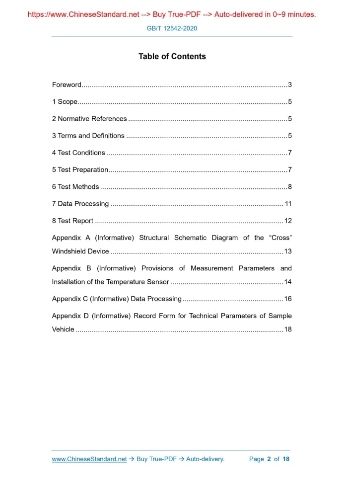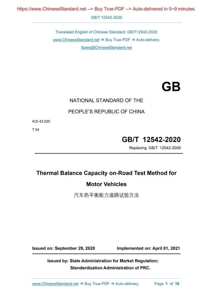 Similar standardsGB/T 12542-2020: Thermal Balance Capacity on-Road Test Method for Motor Vehicles---This is an excerpt. Full copy of true-PDF in English version (including equations, symbols, images, flow-chart, tables, and figures etc.), auto-downloaded/delivered in 9 seconds, can be purchased online: https://www.ChineseStandard.net/PDF.aspx/GBT12542-2020GB NATIONAL STANDARD OF THE PEOPLE’S REPUBLIC OF CHINA ICS 43.020 T 04 Replacing GB/T 12542-2009 Thermal Balance Capacity on-Road Test Method for Motor Vehicles ISSUED ON: SEPTEMBER 29, 2020 IMPLEMENTED ON: APRIL 01, 2021 Issued by: State Administration for Market Regulation; Standardization Administration of PRC. Table of ContentsForeword ... 3 1 Scope ... 5 2 Normative References ... 5 3 Terms and Definitions ... 5 4 Test Conditions ... 7 5 Test Preparation ... 7 6 Test Methods ... 8 7 Data Processing ... 11 8 Test Report ... 12 Appendix A (Informative) Structural Schematic Diagram of the “Cross” Windshield Device ... 13 Appendix B (Informative) Provisions of Measurement Parameters and Installation of the Temperature Sensor ... 14 Appendix C (Informative) Data Processing ... 16 Appendix D (Informative) Record Form for Technical Parameters of Sample Vehicle ... 18ForewordThis Standard was drafted as per the rules specified in GB/T 1.1-2009. This Standard replaced GB/T 12542-2009 Thermal Balance Capacity on-Road Test Method for Motor Vehicles. Compared with GB/T 12542-2009, this Standard has the major technical changes as follows besides the editorial modifications: --- Add the provisions for indoor tests, and revise the provisions for applicable vehicle models (see Clause 1 of this Edition); --- Modify the definitions of environment temperature and motor vehicle thermal balance (see 3.1, 3.3 of this Edition; 3.1, 3.4 of 2009 Edition); --- Replace the cooling constant by the temperature difference constant; replace the maximum approved temperature of the cooling medium by the temperature limit; replace the approved environment temperature for limit use and approved environment temperature for normal use by the approved environment temperature (see 3.4, 3.6, 3.7 of this Edition; 3.5, 3.6, 3.9, 3.10 of 2009 Edition); --- Add the terms and definitions of temperature difference, resistance apply device, the maximum torque speed, rated power speed, and no obvious upward trend (see 3.2, 3.5, 3.8, 3.9, 3.10 of this Edition); --- Delete the terms and definitions of cooling medium, thermal balance, limit use conditions, and normal use conditions (see 3.2, 3.3, 3.7, 3.8 of 2009 Edition); --- Modify the relevant requirements for climatic conditions and measurement parameters (see 4.1, 4.3 of this Edition; 4.1 of 2009 Edition); --- Modify the load requirements for the vehicle test and the requirements for the selection of measuring points and the installation of sensors (see 5.1.2, 5.2 and Appendix B of this Edition; 5.2 and Appendix B of 2009 Edition); --- Add the test requirements after the air conditioner stops working (see 6.2 of this Edition); --- Add the provisions that automobile manufacturers can select test conditions according to the actual conditions of normal use of automobiles (see 6.3.7 of this Edition); --- Modify the requirements for gear, vehicle speed, rotation speed and resistance of each test condition (see 6.3 of this Edition; 6.3, 6.4 of 2009 Edition); --- Increase the sampling frequency requirements for each measurement parameter during the test (see 6.5 of this Edition); Thermal Balance Capacity on-Road Test Method for Motor Vehicles1 ScopeThis Standard specifies the test conditions, test preparation, test methods, data processing and test reports for the thermal balance capacity on-road test method of for motor vehicles. This Standard is applicable to the thermal balance capacity on-road test of Type-M and Type-N vehicles with forced circulation liquid-cooled engines, which can be implemented by reference when testing indoors; other Type-M and Type-N vehicles can also be implemented by reference.2 Normative ReferencesThe following documents are essential to the application of this document. For the dated documents, only the versions with the dates indicated are applicable to this document; for the undated documents, only the latest version (including all the amendments) is applicable to this document. GB/T 3730.2 Road Vehicle – Masses - Vocabulary and Codes GB/T 12534 Motor Vehicles-General Rules of Road Test Method GB/T 15089 Classification of Power-Driven Vehicles and Trailers3 Terms and DefinitionsFor the purpose of this document, the terms and definitions given in GB/T 3730.2, GB/T 15089 and the following apply. 3.1 Environment temperature The temperature of the environment where the vehicle is located. NOTE: During the measurement, the sensor for measuring the environment temperature is installed on the outside of the sample vehicle in an appropriate manner, 1.5m from the ground. Avoid direct sunlight, reflections and interference from other heat sources. 3.2 Temperature difference; ΔT The difference between the temperature of each system, assembly, and parts of the automobile and the environment temperature. 3.3 Motor vehicles thermal balance The temperature difference between the temperature of each system, assembly and parts of the automobile and the environment temperature becomes stable. 3.4 Temperature difference constants; ΔTc The temperature difference of each system, assembly and parts of the automobile during the thermal balance. 3.5 Resistance apply device The device that provides the driving resistance (such as load trailer, chassis dynamometer, etc.), which may be measured. 3.6 Temperature limits; Tlim The maximum approved operating temperature of each system, assembly, and parts of the automobile that is given by the automobile manufacturer. 3.7 Approved environment temperature; Tapr Due to the limitation of temperature limit, the highest environment temperature at which the automobile can work 