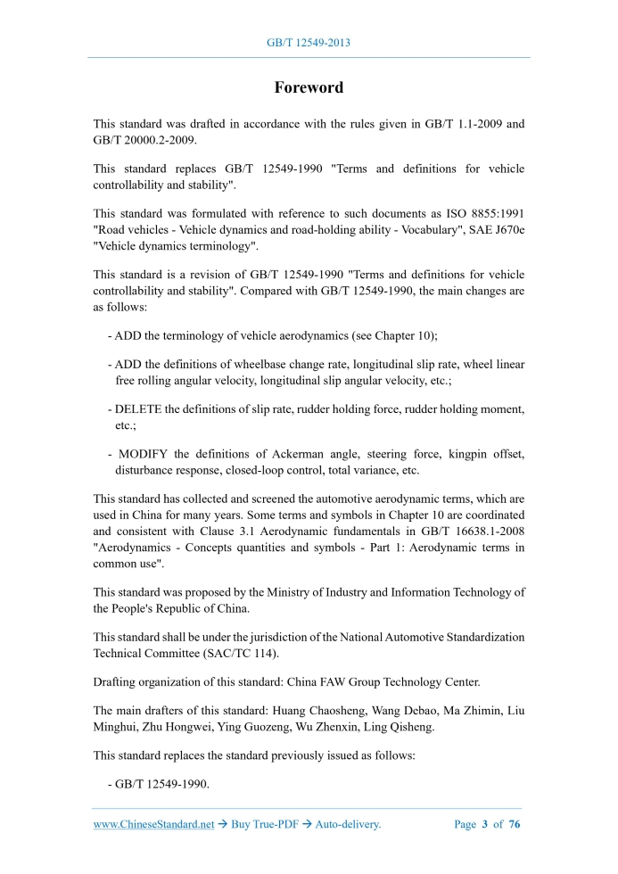 Similar standardsGB/T 12549-2013: Terms and definitions for vehicle controllability and stability---This is an excerpt. Full copy of true-PDF in English version (including equations, symbols, images, flow-chart, tables, and figures etc.), auto-downloaded/delivered in 9 seconds, can be purchased online: https://www.ChineseStandard.net/PDF.aspx/GBT12549-2013NATIONAL STANDARD OF THE PEOPLE’S REPUBLIC OF CHINA ICS 43.040.50 T 23 Replacing GB/T 12549-1990 Terms and definitions for vehicle controllability and stability Issued on. NOVEMBER 27, 2013 Implemented on. JULY 01, 2014 Issued by. General Administration of Quality Supervision, Inspection and Quarantine of PRC; Standardization Administration of PRC. Table of ContentsForeword... 3 1 Scope... 4 2 Normative references... 4 3 Steering system... 4 4 Suspension system... 7 5 Tires and wheels... 13 6 Axis systems and motion... 22 7 Movement characteristics... 32 8 Characteristics of limit maneuver and abnormal motion... 40 9 Test and evaluation... 43 10 Aerodynamics... 51 Index in English... 681 ScopeThis standard specifies the terms and definitions of vehicle controllability and stability. This standard applies to all types of vehicles.2 Normative referencesThe following documents are essential to the application of this document. For the dated documents, only the versions with the dates indicated are applicable to this document; for the undated documents, only the latest version (including all the amendments) is applicable to this standard. GB/T 3730.3-1992 Motor vehicles and towed vehicles - Dimensions of vehicles - Terms and definitions GB/T 6326-2005 Tyre terms and definitions GB/T 16638.1-2008 Aerodynamics - Concepts quantities and symbols - Part 1. Aerodynamic terms in common use3 Steering system3.1 Angles in steering system 3.1.1 Steer angle δs The angle, BETWEEN the vehicle's longitudinal symmetry plane (see 6.1.6) and the center plane of the steering wheel (see 4.1.1) AND the intersection of the pavement (see Figure 1). 3.1.2 Steering wheel angle δsw Steering wheel's angular displacement, which is measured based on the position of the steering wheel, when the vehicle is going straight.4 Suspension system4.1 Suspension geometry 4.1.1 Wheel plane For a single wheel, the wheel plane is the plane, which is equidistant from the inner edge of the wheel rim, on both sides. 4.1.6 Caster angle The angle, between the projection of the centerline of the steering kingpin on the longitudinal plane of symmetry of the vehicle (see 6.1.6) AND the plumb line. If the upper end of the steering kingpin is inclined backward, this angle is positive; if the upper end of the steering kingpin is inclined forward, the angle is negative (see Figure 3). 4.1.10 Kingpin offset The length of the projection of the line, which connects the intersection of the kingpin's extension line and the pavement AND the center of tire contact (see 5.1.1), on the Y'-axis (see 5.1.2). If the center of tire contact is outside the intersection of the kingpin's extension line and the pavement relative to the vehicle body, the kingpin offset is positive; otherwise, it is negative. 4.1.11 Lateral slip The lateral slip value of the straight-running tire, per unit travel distance, which is measured on the lateral slip test bench. It is expressed in m/km, mm/m. 4.1.12 Wheelbase The distance, between two planes that pass through point A or (B) of two adjacent wheels on the same side of the vehicle AND are perpendicular to the Y and X planes, respectively. 4.2 Suspension system mechanics 4.2.1 Suspension vertical stiffness Under a certain load state, the change in the vertical load of the wheel, which is corresponding to the unit displacement of the sprung center of mass, as relative to the center of the wheel, in the vertical direction. 4.2.2 Suspension longitudinal stiffness The change in longitudinal force at the wheel center, which is corresponding to a unit displacement of the wheel center, as relative to the sprung center of mass, in the longitudinal [x-axis (see 6.1.3) direction]. 4.2.10 Roll axis A line, which connects the front and rear roll centers. 4.2.11 Suspension compliance Reciprocal of suspension stiffness. 4.2.12 Damping force characteristic The relationship between the damping force of a shock absorber and its piston speed. 4.2.13 Overturning couple Moment of the force acting on the vehicle, relative to the longitudinal axis of the vehicle on the pavement, due to the effects of lateral acceleration (see 6.4.16) and roll angular acceleration.5 Tires and wheels5.1 Tire axis system and variables 5.1.1 Center of tire contact The intersection, BETWEEN the intersection line of wheel plane and the ground AND the projection of the wheel rotation center line on the ground (see Figure 1, Figure 4). 5.1.2 Tire axis system (X', Y', Z') A right-handed rectangular axis system, which uses the center of tire contact as the origin. The X' axis is the intersection of the wheel plane and the road plane, wherein the travel direction of the wheel plane is positive 5.1.3 Slip angle of tire The angle, between the traveling direction of the center of tire contact and the X' axis of the tire axis system (see Figure 4 and Figure 5). 5.4.6 Cornering stiffness The increment of lateral force, which is corresponding to a unit increment of tire slip angle (usually refers to the measured value, when the tire slip angle is zero). 5.4.9 Aligning stiffness (aligning torque stiffness) The increment of the aligning torque, which is corresponding to the unit increment of the tire slip angle (usually refers to the measured value, when the tire slip angle is zero). 5.4.10 Cornering stiffness coefficient The ratio of cornering stiffness to vertical load, for a free-rolling wheel. 5.4.11 Camber stiffness coefficient The ratio of camber stiffness to vertical load, for a free-rolling wheel. 5.5.5 Slipping braking adhesion coefficient At a given trim, the braking force coefficient, when the wheels are locked.6 Ax