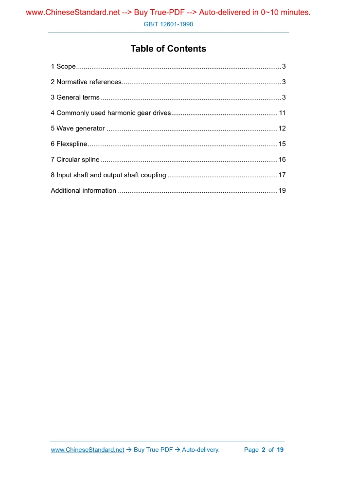 Similar standardsGB/T 12601-1990: Basic terminology of harmonic gear drive---This is an excerpt. Full copy of true-PDF in English version (including equations, symbols, images, flow-chart, tables, and figures etc.), auto-downloaded/delivered in 9 seconds, can be purchased online: https://www.ChineseStandard.net/PDF.aspx/GBT12601-1990GB NATIONAL STANDARD OF THE PEOPLE’S REPUBLIC OF CHINA GB/T 12601-90 Basic terminology of harmonic gear drive ISSUED ON: DECEMBER 18, 1990 IMPLEMENTED ON: DECEMBER 01, 1991 Issued by: State Bureau of Technical Supervision Table of Contents1 Scope ... 3 2 Normative references ... 3 3 General terms ... 3 4 Commonly used harmonic gear drives ... 11 5 Wave generator ... 12 6 Flexspline ... 15 7 Circular spline ... 16 8 Input shaft and output shaft coupling ... 17 Additional information ... 19 Basic terminology of harmonic gear drive1 ScopeThis standard specifies the basic terms and definitions of harmonic gear drives. This standard applies to harmonic gear drives.2 Normative referencesGB 3374 Basic terminology of gears GB 11366 Basic terminology of planetary drives GB 10853 Terminology for the theory of machines and mechanisms SJ 2604 Single-stage harmonic gear reducer SJ 2557 Accuracy calculating method for spur gear-driven chain with fine pitch3 General terms3.1 Transmission elements and components 3.1.1 Harmonic gear drive Harmonic gear drive is mainly composed of three basic components: wave generator, flexspline and circular spline. It is a drive that relies on wave generator to make flexspline produce controllable elastic deformation and mesh with circular spline to transmit motion and force. 3.1.2 Mechanism of the harmonic gear drive The main components in the mechanism of harmonic gear drive are: a. Wave generator; b. Flexspline; c. Circular spline; d. Input shaft connection; 3.1.8 Deflection Under the action of the wave generator, the amount of deformation (radial, tangential or axial) at any point on the neutral layer of the flexspline toothed ring. Synonym: displacement 3.1.8.1 Radial deflection Under the action of the wave generator, the amount of deformation in the radial direction at any point on the neutral layer of the flexspline toothed ring. Synonym: Radial displacement 3.1.8.2 Tangential deflection Under the action of the wave generator, the amount of deformation in the tangential direction at any point on the neutral layer of the flexspline toothed ring. Synonym: Tangential displacement 3.1.8.3 Axial deflection Under the action of the wave generator, the amount of deformation in the axial direction at any point on the neutral layer of the flexspline toothed ring. Synonym: Axial displacement 3.1.8.4 Maximum deflection Refers to the maximum value of deformation (radial, tangential, axial) at any point on the neutral layer of the flexspline toothed ring under the action of the wave generator. Synonym: Maximum displacement 3.1.8.5 Coefficient of maximum deflection The ratio of maximum deformation to modulus. 3.1.9 Distortion When the drive mechanism is overloaded, the actual profile of the neutral layer of the flexspline's toothed ring will deviate or twist from its original profile under no load. 3.1.10 Equidistant curve The lost motion caused by the backlash between the flexspline and the circular spline as well as the gaps in other components, which is called the lost motion caused by clearance. 3.2.5.2 Lost motion caused by elastic deflection Lost motion as caused by elastic deformation of components. 3.2.6 Moment of inertia The sum of the product of each mass or the mass of mass unit in the component and the square of the distance from the given axis, which is called the moment of inertia of the rigid component to the given axis. 3.2.7 Natural frequency The frequency determined by the mass (moment of inertia) and stiffness (torsional stiffness) of the system itself. 3.2.8 Resonance frequency The vibration when the excited frequency coincides with the natural frequency of the system, which is called resonance. The forced vibration frequency when resonance occurs is called the resonance frequency. 3.2.9 Slippage phenomenon or ratcheting phenomenon Due to overload or improper design and manufacturing, the flexspline tooth slips away from the circular spline tooth during meshing (when slipping off, it produces noise). 3.3 Gear characteristics and size parameters 3.3.1 Mating flank In a gear pair, two flanks that mesh with each other are called mating flank. 3.3.2 Working flank A flank on a gear tooth that meshes with the flank of a mating gear and transmits movement. 3.3.3 Non-working flank The opposite side of the working flank of the gear tooth. 3.3.4 Left flank When an observer looks at the end face of the gear selected as the reference The process from the point when the flexspline starts withdrawal from the maximum depth of engagement to the point when the flexspline's teeth is disengaged. 3.4.1.3 Total number of teeth in engagement The number of teeth meshed simultaneously between the flexspline and the circular spline. 3.4.1.4 Region of engagement Under the action of the wave generator, the region where there is engagement between the flexspline's teeth and the circular spline's teeth. 3.4.1.5 Engaging-in region The region passed by the engaging-in process. 3.4.1.6 Engaging-out region The region passed by the engaging-out process. 3.4.1.7 Circular arc angle of engagement The center angle corresponding to the region of engagement. 3.4.1.8 Normal engagement The contact point between the flexspline tooth and the circular spline tooth is located within the working section of the tooth profile. 3.4.1.9 Tip edge engagement The engagement where the tooth tip edge of the flexspline is in contact with the tooth profile of the circular spline, or the tooth tip edge of the circular spline is in contact with the tooth profile of the flexspline. 3.4.1.10 Maximum depth in engaging In the engagement state, the absolute value of the difference between t