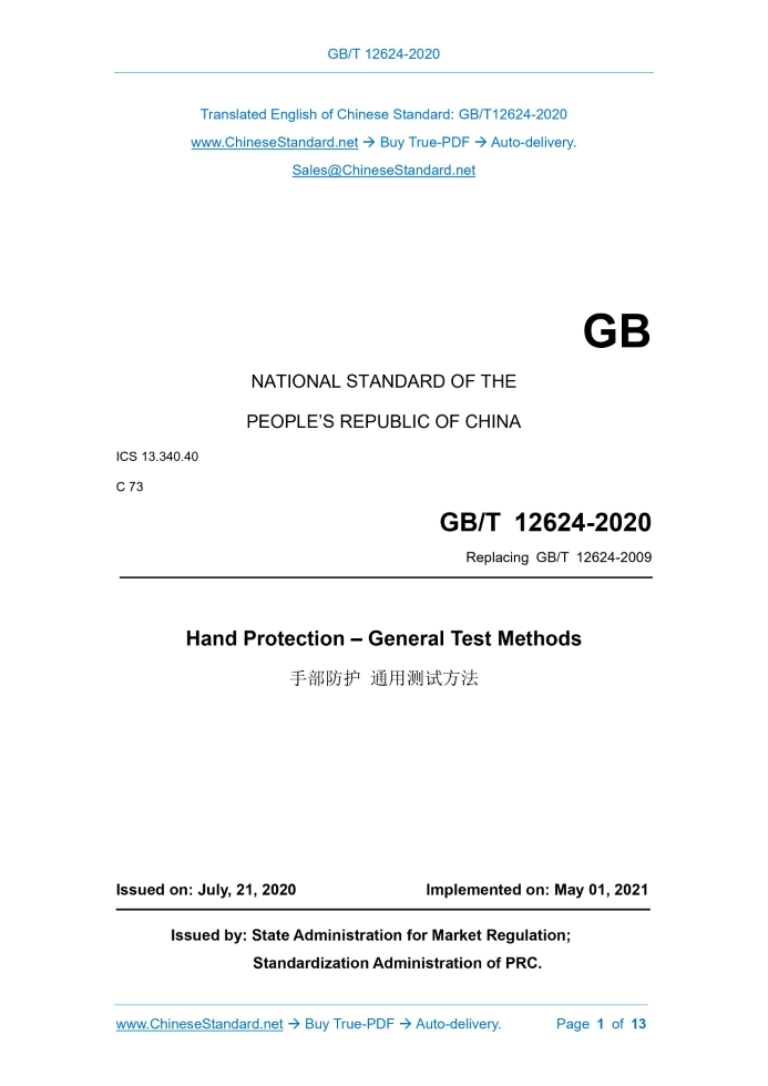 GB/T 12624-2020: Hand protection - General test methods Delivery: 9 seconds. True-PDF full-copy in English & invoice will be downloaded + auto-delivered via email. See step-by-step procedure Status: Valid GB/T 12624: Historical versions