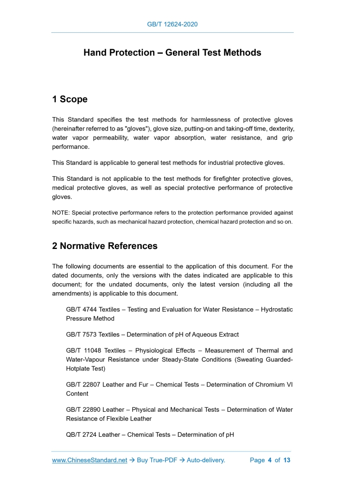 Similar standardsGB/T 12624-2020: Hand protection - General test methods---This is an excerpt. Full copy of true-PDF in English version (including equations, symbols, images, flow-chart, tables, and figures etc.), auto-downloaded/delivered in 9 seconds, can be purchased online: https://www.ChineseStandard.net/PDF.aspx/GBT12624-2020GB NATIONAL STANDARD OF THE PEOPLE’S REPUBLIC OF CHINA ICS 13.340.40 C 73 Replacing GB/T 12624-2009 Hand Protection – General Test Methods ISSUED ON: JULY, 21, 2020 IMPLEMENTED ON: MAY 01, 2021 Issued by: State Administration for Market Regulation; Standardization Administration of PRC. Table of ContentsForeword ... 3 1 Scope ... 4 2 Normative References ... 4 3 Terms and Definitions ... 5 4 Test Methods ... 5 Hand Protection – General Test Methods1 ScopeThis Standard specifies the test methods for harmlessness of protective gloves (hereinafter referred to as "gloves"), glove size, putting-on and taking-off time, dexterity, water vapor permeability, water vapor absorption, water resistance, and grip performance. This Standard is applicable to general test methods for industrial protective gloves. This Standard is not applicable to the test methods for firefighter protective gloves, medical protective gloves, as well as special protective performance of protective gloves. NOTE: Special protective performance refers to the protection performance provided against specific hazards, such as mechanical hazard protection, chemical hazard protection and so on.2 Normative ReferencesThe following documents are essential to the application of this document. For the dated documents, only the versions with the dates indicated are applicable to this document; for the undated documents, only the latest version (including all the amendments) is applicable to this document. GB/T 4744 Textiles – Testing and Evaluation for Water Resistance – Hydrostatic Pressure Method GB/T 7573 Textiles – Determination of pH of Aqueous Extract GB/T 11048 Textiles – Physiological Effects – Measurement of Thermal and Water-Vapour Resistance under Steady-State Conditions (Sweating Guarded- Hotplate Test) GB/T 22807 Leather and Fur – Chemical Tests – Determination of Chromium VI Content GB/T 22890 Leather – Physical and Mechanical Tests – Determination of Water Resistance of Flexible Leather QB/T 2724 Leather – Chemical Tests – Determination of pH3 Terms and DefinitionsFor the purpose of this Document, the following terms and definitions apply. 3.1 Glove Hand protective equipment that is used to protect the hands from injury. NOTE: The length can also be increased to cover the forelimbs and the entire arm. [GB/T 12903-2008, definition 8.1.1] 3.2 Glove back The part of glove that covers the back of the hand. 3.3 Glove palm The part of glove that covers the palm. 3.4 Dexterity The flexibility of the hand to complete a task after putting on the glove.4 Test Methods4.1 Harmlessness test method 4.1.1 pH test The specimen shall be taken from the glove palm. If the material of other parts of the glove is different from that of the palm, sampling and testing of other materials shall be carried out at the same time. If the glove is composed of multiple layers, it shall be tested as a whole. Leather gloves are tested according to the method specified in QB/T 2724. Textile material gloves are tested according to the method specified in GB/T 7573. 4.1.2 Hexavalent chromium test Leather materials are tested in accordance with the method specified in GB/T 22807. If gloves contain different types of leather materials, all types of leather shall be tested separately; and the highest value of all test results shall be taken. 4.2.3 Glove width test The glove width is measured by a ruler with an accuracy of no less than 0.1mm. When measuring, the glove shall be naturally placed flat on the test platform; and the shortest distance of the glove palm shall be measured 20mm upwards from the bifurcation of the thumb and index finger of the glove. The result is accurate to 1mm. 4.3 Test methods for putting-on and taking-off time 4.3.1 Quantities and conditions of specimens The specimens are 3 pairs of new gloves of the same specification, without any softening treatment (such as tapping or squeezing, etc.). It shall be placed for at least 24h under the conditions of (23±2)°C and relative humidity (50±5)%. 4.3.2 Test equipment A timer with an accuracy of 0.1s. 4.3.3 Test procedures The test shall be carried out by 1 wearer and 1 timekeeper. The wearer shall start the test after understanding the requirements for wearing gloves. The size of the wearer's hand shall match the size of the glove under test. The specimen shall be placed on a platform that is easy to pick up before testing. The putting-on time counts from the wearer picking up the glove from the platform to showing the wearing state to the timekeeper after the putting-on is completed. The taking-off time counts from both hands of wearer completes the putting-on gloves to the wearer placing the gloves on the platform. NOTE: In order to preserve the test procedures, video recording can be used as a supplement. 4.3.4 Test results The putting-on and taking-off time of each pair of specimens shall be recorded separately; and the arithmetic mean of the 3 pairs of specimens shall be calculated. The arithmetic mean of putting-on and taking-off time shall be rounded-off to an integer. 4.4 Dexterity test methods 4.4.1 Quantities and conditions of specimens The specimens are 2 pairs of new gloves of the same specification, without any softening treatment (such as tapping or squeezing, etc.). It shall be placed for at least 24h under the conditions of (23±2)°C and relative humidity (50±5)%. 4.4.2 Test equipment 5 pieces of stainless-steel test rods. Each is 40mm long; and has a diameter of 5.0mm, 6.5mm, 8.0mm, 9.5mm, and 11.0mm, respectively. 4.4.3 Test procedures Place the test rod on a flat surface; and a wearer whose hand size matches the g