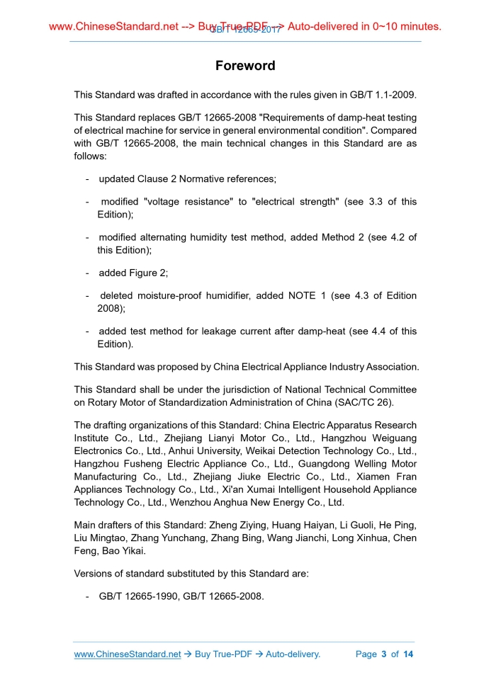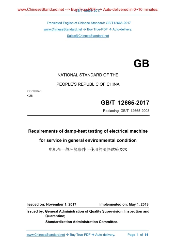 Similar standardsGB/T 12665-2017: Requirements of damp-heat testing of electrical machine for service in general environmental condition---This is an excerpt. Full copy of true-PDF in English version (including equations, symbols, images, flow-chart, tables, and figures etc.), auto-downloaded/delivered in 9 seconds, can be purchased online: https://www.ChineseStandard.net/PDF.aspx/GBT12665-2017 GB NATIONAL STANDARD OF THE PEOPLE’S REPUBLIC OF CHINA ICS 19.040 K 26 Replacing GB/T 12665-2008 Requirements of damp-heat testing of electrical machine for service in general environmental condition Issued on. NOVEMBER 1, 2017 Implemented on. MAY 1, 2018 Issued by. General Administration of Quality Supervision, Inspection and Quarantine; Standardization Administration Committee. Table of ContentsForeword... 3 1 Scope... 4 2 Normative references... 4 3 Technical requirements... 4 4 Test method... 7 5 Inspection rules... 13ForewordThis Standard was drafted in accordance with the rules given in GB/T 1.1-2009. This Standard replaces GB/T 12665-2008 "Requirements of damp-heat testing of electrical machine for service in general environmental condition". Compared with GB/T 12665-2008, the main technical changes in this Standard are as follows. - updated Clause 2 Normative references; - modified "voltage resistance" to "electrical strength" (see 3.3 of this Edition); - modified alternating humidity test method, added Method 2 (see 4.2 of this Edition); - added Figure 2; - deleted moisture-proof humidifier, added NOTE 1 (see 4.3 of Edition 2008); - added test method for leakage current after damp-heat (see 4.4 of this Edition). This Standard was proposed by China Electrical Appliance Industry Association. This Standard shall be under the jurisdiction of National Technical Committee on Rotary Motor of Standardization Administration of China (SAC/TC 26). The drafting organizations of this Standard. China Electric Apparatus Research Institute Co., Ltd., Zhejiang Lianyi Motor Co., Ltd., Hangzhou Weiguang Electronics Co., Ltd., Anhui University, Weikai Detection Technology Co., Ltd., Hangzhou Fusheng Electric Appliance Co., Ltd., Guangdong Welling Motor Manufacturing Co., Ltd., Zhejiang Jiuke Electric Co., Ltd., Xiamen Fran Appliances Technology Co., Ltd., Xi'an Xumai Intelligent Household Appliance Technology Co., Ltd., Wenzhou Anghua New Energy Co., Ltd. Main drafters of this Standard. Zheng Ziying, Huang Haiyan, Li Guoli, He Ping, Liu Mingtao, Zhang Yunchang, Zhang Bing, Wang Jianchi, Long Xinhua, Chen Feng, Bao Yikai. Versions of standard substituted by this Standard are. - GB/T 12665-1990, GB/T 12665-2008. Requirements of damp-heat testing of electrical machine for service in general environmental condition1 ScopeThis Standard specifies the damp-heat test method, technical requirements and inspection rules of rotary electrical machine in general environmental condition. This Standard applies to all types of rotary electrical machines (except micro- control electrical machine, hereinafter referred to as the electrical machine).2 Normative referencesThe following referenced documents are indispensable for the application of this document. For dated references, only the edition cited applies. For undated references, the latest edition of the referenced document (including any amendments) applies. GB/T 755, Rotating electrical machines - Rating and performance GB/T 2423.3-2006, Environmental testing for electric and electronic products - Part 2.Testing method test Cab. Damp heat Steady state GB/T 2423.4-2008, Environmental testing for electric and electronic products - Part 2.Test method - Test Db. Damp heat, cyclic (12h+12h cycle) GB/T 12113-2003, Methods of measurement of touch current and protective conductor current3 Technical requirements3.1 Insulation resistance 3.1.1 The insulation resistance value between the windings of the whole machine to the casing and the winding shall not be lower than the following values. 3.1.2 When a large-scale motor component is used for the damp-heat test, the insulation resistance converted to the complete machine is determined according to equation (2). 3.4 Running performance The electrical machine shall be able to operate normally. No sticking or other effects on the normal operation of the motor shall occur. The performance shall meet the requirements of relevant product standards.4 Test method4.1 Preparation before test 4.1.1 Test equipment and instruments The damp-heat test chamber shall meet the requirements of Clause 4 of GB/T 2423.4-2008. 4.1.2 Test specimen requirements When the large-scale electrical machine tests components, aluminum foil is used for the measuring electrode of the high-voltage stator winding and the DC electrical machine compensation winding. For slotted insulation and impregnated coils, a simulation slot shall be made. 4.1.3 Pre-treatment of test specimen Before the damp-heat test, the test specimen shall be placed in a hot and humid test chamber for preheating. The preheating temperature is 25°C ~ 35°C. From the time when the temperature of the damp-heat test chamber reaches 25°C, the time is not less than 8h. 4.2 Damp-heat test method According to GB/T 2423.4-2008, perform the alternating damp-heat test. High temperature is generally 40°C. According to the severity of the use of occasions, it can choose 55°C. There are two ways to reduce the temperature (see Figure 1 and Figure 2). Choose one of them to test. The conditions for each test cycle are shown in Figure 1 and Figure 2.Carry out 6 cycles in total. 4.3 Measurement of insulation resistance When carrying out the alternating test, the low temperature and high humidity stage of the last week of the damp-heat test shall be maintained at a temperature of 25°C ± 3°C and a relative humidity of 95% ~ 98%. 4.4 Measurement of leakage current After subjected to the damp-heat test, the leakage current of the electrical machine shall be measured by using the circuit device described in