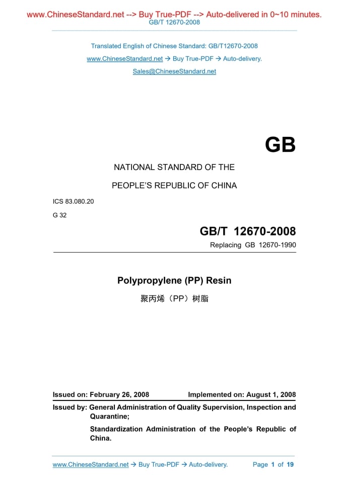 GB/T 12670-2008: Polypropylene (PP) Resin Delivery: 9 seconds. True-PDF full-copy in English & invoice will be downloaded + auto-delivered via email. See step-by-step procedure Status: Valid GB/T 12670: Historical versions