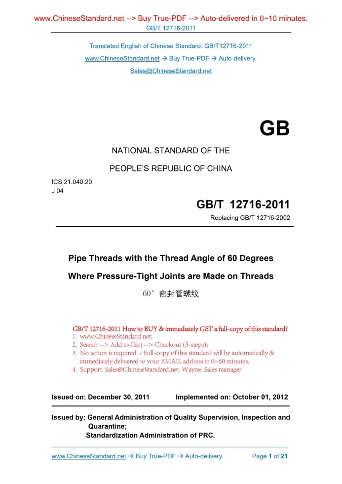 GB/T 12716-2011: Pipe threads with the thread angle of 60 degrees where pressure-tight joints are made on threads Delivery: 9 seconds. True-PDF full-copy in English & invoice will be downloaded + auto-delivered via email. See step-by-step procedure Status: Valid GB/T 12716: Historical versions