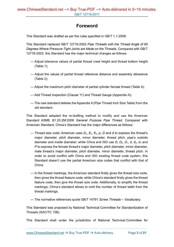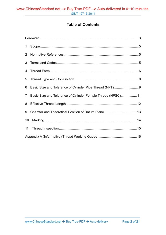 Similar standardsGB/T 12716-2011: Pipe threads with the thread angle of 60 degrees where pressure-tight joints are made on threads---This is an excerpt. Full copy of true-PDF in English version (including equations, symbols, images, flow-chart, tables, and figures etc.), auto-downloaded/delivered in 9 seconds, can be purchased online: https://www.ChineseStandard.net/PDF.aspx/GBT12716-2011 GB NATIONAL STANDARD OF THE PEOPLE’S REPUBLIC OF CHINA ICS 21.040.20 J 04 Replacing GB/T 12716-2002 Pipe Threads with the Thread Angle of 60 Degrees Where Pressure-Tight Joints are Made on Threads Issued on. DECEMBER 30, 2011 Implemented on. OCTOBER 01, 2012 Issued by. General Administration of Quality Supervision, Inspection and Quarantine; Standardization Administration of PRC. Table of ContentsForeword... 3 1 Scope... 5 2 Normative References... 5 3 Terms and Codes... 5 4 Thread Form... 6 5 Thread Type and Conjunction... 8 6 Basic Size and Tolerance of Cylinder Pipe Thread (NPT)... 9 7 Basic Size and Tolerance of Cylinder Female Thread (NPSC)... 11 8 Effective Thread Length... 12 9 Chamfer and Theoretical Position of Datum Plane... 13 10 Marking... 14 11 Thread Inspection... 15 Appendix A (Informative) Thread Working Gauge... 161 ScopeThis Standard specifies the thread form, basic size, tolerance, marking and gauge of pipe thread (NPT and NPSC) with sealed thread pair and thread form angle of 60°. This Standard is applicable to sealed thread connection for pipe, valve, pipe joint, cock, and other pipe fittings.2 Normative ReferencesThe following documents are essential to the application of this document. For the dated documents, only the versions with the dates indicated are applicable to this document; for the undated documents, only the latest version (including all the amendments) are applicable to this document. GB/T 14791 Screw Threads – Vocabulary3 Terms and Codes3.1 Terms and definitions The following terms and definitions and those ones stipulated in GB/T 14791 are applicable to this document. 3.1.1 Reference plane The visible plane of reference workpiece for reading the inspection values (position deviation of the datum plane) during using the gauge to inspect the thread. It is the outer end-face of female thread and small end-face of male thread.4 Thread Form4.1 Design of thread form See Figure 1 for thread form of cylinder female thread (NPSC); see Figure 2 for thread from of cylinder thread (NPT). 4.2 Size of thread form The size of thread form shall be calculated as per the following formula. 4.3 Tolerance of thread height The distribution positions of tolerance zones for thread crest height and thread root height can refer to Figure 3; while the tolerance value shall be consistent with the provisions of Table 1.5 Thread Type and ConjunctionThe female thread can be divided into the taper and cylinder threads; while the male thread only has the taper thread.6 Basic Size and Tolerance of Cylinder Pipe Thread (NPT)6.1 Basic dimension The distribution position of main size of cylinder pipe thread can refer to Figure 4; the basic size shall conform to the provisions of Table 2. 6.3 Integrated position tolerance The taper pipe thread (NPT) datum plane axial position limit deviation. ±1P. 6.4 Tolerance between major and minor diameters In the same axial position plane, the sizes of the thread major and minor diameters shall be changed as the change of the pitch diameter; so that ensure the sizes of thread crest height and thread root height shall be within the tolerance range specified in Clause 4. 6.5 Single element tolerance of thread The conical degree, lead and flank angle limit deviation of taper pipe thread (NPT) shall comply with the provisions of Table 3.7 Basic Size and Tolerance of Cylinder Female Thread (NPSC)7.1 Basic size The basic sizes of the major diameter, pitch diameter and minor diameter of cylinder Limit Deviation of Pitch Diameter 7.3 Integrated position tolerance The limit deviation for axial position of cylinder female thread (NPSC) datum plane. ±1.5P. 7.4 Tolerance between major diameter and minor diameter In the same axial position plane, the sizes of thread major and minor diameters shall be changed as the change of pitch diameter; so that ensure the sizes of thread crest and thread root shall be within the tolerance range specified in Clause 4.8 Effective Thread LengthThe effective thread length of male thread shall be no less than the sum between the Thread Size Code Number of Teeth Pitch Diameter / mm Minor Diameter / mm9 Chamfer and Theoretical Position of Datum PlaneFor the chamfer on the small end-face of male thread, the theoretical position of its datum plane shall be unchanged, see Figure 5a).10 Marking10.1 Marking methods The pipe thread marking consists of thread feature code, thread size code and thread number of teeth. ......Source: Above contents are excerpted from the full-copy PDF -- translated/reviewed by: www.ChineseStandard.net / Wayne Zheng et al. Tips & Frequently Asked Questions:Question 1: How long will the true-PDF of English version of GB/T 12716-2011 be delivered?Answer: The full copy PDF of English version of GB/T 12716-2011 can be downloaded in 9 seconds, and it will also be emailed to you in 9 seconds (double mechanisms to ensure the delivery reliably), with PDF-invoice.Question 2: Can I share the purchased PDF of GB/T 12716-2011_English with my colleagues?Answer: Yes. The purchased PDF of GB/T 12716-2011_English will be deemed to be sold to your employer/organization who actually paid for it, including your colleagues and your employer's intranet.Question 3: Does the price include tax/VAT?Answer: Yes. Our tax invoice, downloaded/delivered in 9 seconds, includes all tax/VAT and complies with 100+ countries' tax regulations (tax exempted in 100+ countries) -- See Avoidance of Double Taxation Agreements (DTAs): List of DTAs signed between Singapore and 100+ countriesQuestion 4: Do you accept my currency other than USD?Answer: Yes. www