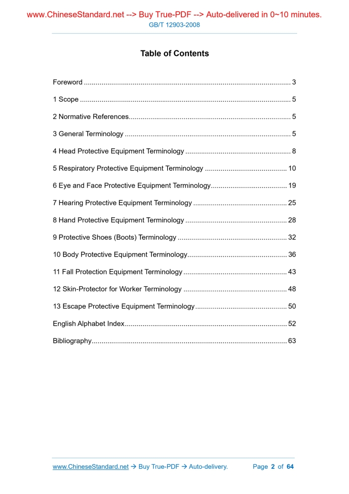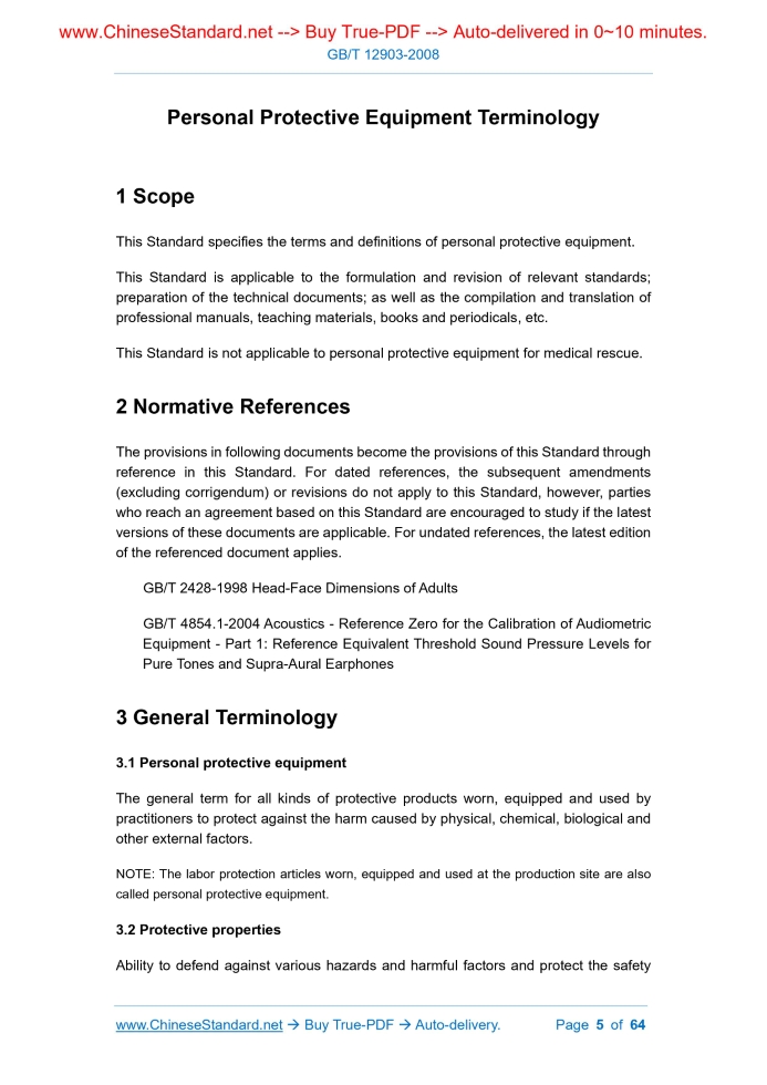 Similar standardsGB/T 12903-2008: Personal Protective Equipment Terminology---This is an excerpt. Full copy of true-PDF in English version (including equations, symbols, images, flow-chart, tables, and figures etc.), auto-downloaded/delivered in 9 seconds, can be purchased online: https://www.ChineseStandard.net/PDF.aspx/GBT12903-2008NATIONAL STANDARD OF THE PEOPLE’S REPUBLIC OF CHINA ICS 13.340.01 C 73 Replacing GB/T 12903-1991 Personal Protective Equipment Terminology Issued on. DECEMBER 11, 2008 Implemented on. OCTOBER 01, 2009 Issued by. General Administration of Quality Supervision, Inspection and Quarantine; Standardization Administration of PRC. Table of ContentsForeword... 3 1 Scope... 5 2 Normative References... 5 3 General Terminology... 5 4 Head Protective Equipment Terminology... 8 5 Respiratory Protective Equipment Terminology... 10 6 Eye and Face Protective Equipment Terminology... 19 7 Hearing Protective Equipment Terminology... 25 8 Hand Protective Equipment Terminology... 28 9 Protective Shoes (Boots) Terminology... 32 10 Body Protective Equipment Terminology... 36 11 Fall Protection Equipment Terminology... 43 12 Skin-Protector for Worker Terminology... 48 13 Escape Protective Equipment Terminology... 50 English Alphabet Index... 52 Bibliography... 631 ScopeThis Standard specifies the terms and definitions of personal protective equipment. This Standard is applicable to the formulation and revision of relevant standards; preparation of the technical documents; as well as the compilation and translation of professional manuals, teaching materials, books and periodicals, etc. This Standard is not applicable to personal protective equipment for medical rescue.2 Normative ReferencesThe provisions in following documents become the provisions of this Standard through reference in this Standard. For dated references, the subsequent amendments (excluding corrigendum) or revisions do not apply to this Standard, however, parties who reach an agreement based on this Standard are encouraged to study if the latest versions of these documents are applicable. For undated references, the latest edition of the referenced document applies. GB/T 2428-1998 Head-Face Dimensions of Adults GB/T 4854.1-2004 Acoustics - Reference Zero for the Calibration of Audiometric Equipment - Part 1.Reference Equivalent Threshold Sound Pressure Levels for Pure Tones and Supra-Aural Earphones3 General Terminology3.1 Personal protective equipment The general term for all kinds of protective products worn, equipped and used by practitioners to protect against the harm caused by physical, chemical, biological and other external factors. 3.2 Protective properties Ability to defend against various hazards and harmful factors and protect the safety and health of workers. 3.3 Dustproof properties Ability to defend against the harms caused by the dust. 3.4 Chemical protective properties Ability to defend against the harms caused by the toxic substances. 3.5 Acid resistance properties Ability to defend against the harms caused by the acid substances. 3.6 Alkali resistance properties Ability to defend against the harms caused by the alkali substances.4 Head Protective Equipment Terminology4.1 Basic terms 4.1.1 Head-protectors A general term for various head protective equipment that protects the head from the harms caused by shock, puncture, squeezing, crushing, scraping, and dirt, etc. 4.2 Component terms 4.2.1 Shell Components of the outer sur face of the head-protector. 4.2.2 Peak The protruding part of the front of the shell. 4.2.3 Brim On the shell, except for the peak, other protruding parts around the shell. 4.2.8 Inner cushion A component that absorbs impact between the safety helmet headband and shell. 4.2.9 Liner strip The strap inside the safety helmet directly contacting the top of the head. 4.2.10 Chin Strap A strap attached to the chin to assist in fixing. 4.2.11 Lock Adjust and fix the effective length of the harnesses. 4.2.12 Vent In order to make the helmet breathable, the hole made in the shell. 4.3 Property terms 4.3.5 Wearing height When wearing a safety helmet, the axial distance from the bottom of the headband to the highest point of the liner strip. 4.3.6 Head-form Simulated human head model made according to the standard size, and used to test the safety helmet.5 Respiratory Protective Equipment Terminology5.1 Basic terms 5.1.1 Respiratory protective equipment The equipment to prevent hypoxic air and air pollutants from entering the respiratory tract. 5.1.5 Non-powered air-purifying respirator The air-purifying protective article that relies on the wearer's breath to overcome the resistance of the components, so as to defend against toxic, harmful gases or vapors, particulate matter (such as toxic fume, toxic mist), etc. that harm the respiratory system, eyes and face. 5.1.8 Long tube breathing apparatus Long tube mask The protective article that can isolate the wearer's respiratory organs from the surrounding air; obtain the clean air for breathing through a long tube. 5.1.9 Supplied air respirator The protective article for the wearer’s spontaneous breathing or for the isolated breathing that relies on mechanical force to introduce the clean air through the catheter. 5.1.10 Self-contained breathing apparatus The isolated type respiratory protective articles that the wearer carries the air bottle, oxygen bottle or oxygen generator as air source. 5.1.12 Positive-pressure respirator The respiratory protective articles that the pressure in the mask is greater than the ambient pressure during any breathing cycle. 5.1.13 Negative-pressure respirator The respiratory protective equipment that the pressure in the mask is less than the ambient pressure in the inhalation phase during the breathing cycle. 5.2.2 Facepiece (Respiratory protection) It is used to connect the wearer's respiratory tract and other devices, and isolate the respiratory tract from the outside air environment. 5.2.2.1 Loose-fi