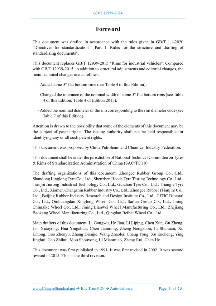 Similar standardsGB/T 12939-2024: Industrial vehicle rims---This is an excerpt. Full copy of true-PDF in English version (including equations, symbols, images, flow-chart, tables, and figures etc.), auto-downloaded/delivered in 9 seconds, can be purchased online: https://www.ChineseStandard.net/PDF.aspx/GBT12939-2024GB NATIONAL STANDARD OF THE PEOPLE’S REPUBLIC OF CHINA ICS 83.160.99 CCS G 41 Replacing GB/T 12939-2015 Industrial vehicle rims ISSUED ON: SEPTEMBER 29, 2024 IMPLEMENTED ON: APRIL 01, 2025 Issued by: State Administration for Market Regulation; Standardization Administration of the People's Republic of China. Table of ContentsForeword ... 3 1 Scope ... 4 2 Normative references ... 4 3 Terms and definitions ... 4 4 Rim profile size codes ... 4 5 Rim profiles and dimensions ... 5 5.1 Split rim profiles (5°DT) ... 5 5.2 C and E deep groove rim profiles (5°DC) ... 8 5.3 Flat bottom rim profile (5°FB) ... 9 5.4 15° deep groove rim profile (15°DC) ... 12 6 Rim nominal diameter ... 13ForewordThis document was drafted in accordance with the rules given in GB/T 1.1-2020 "Directives for standardization - Part 1: Rules for the structure and drafting of standardizing documents". This document replaces GB/T 12939-2015 "Rims for industrial vehicles". Compared with GB/T 12939-2015, in addition to structural adjustments and editorial changes, the main technical changes are as follows: - Added some 5° flat bottom rims (see Table 4 of this Edition); - Changed the tolerance of the nominal width of some 5° flat bottom rims (see Table 4 of this Edition; Table 4 of Edition 2015); - Added the nominal diameter of the rim corresponding to the rim diameter code (see Table 7 of this Edition). Attention is drawn to the possibility that some of the elements of this document may be the subject of patent rights. The issuing authority shall not be held responsible for identifying any or all such patent rights. This document was proposed by China Petroleum and Chemical Industry Federation. This document shall be under the jurisdiction of National Technical Committee on Tyres & Rims of Standardization Administration of China (SAC/TC 19). The drafting organizations of this document: Zhongce Rubber Group Co., Ltd., Shandong Linglong Tyre Co., Ltd., Shenzhen Haoda Tyre Testing Technology Co., Ltd., Tianjin Jiurong Industrial Technology Co., Ltd., Guizhou Tyre Co., Ltd., Triangle Tyre Co., Ltd., Xiamen Chengshin Rubber Industry Co., Ltd., Zhongce Rubber (Tianjin) Co., Ltd., Beijing Rubber Industry Research and Design Institute Co., Ltd., CITIC Dicastal Co., Ltd., Qinhuangdao Xinglong Wheel Co., Ltd., Sailun Group Co., Ltd., Jining Chimaike Wheel Co., Ltd., Jining Lianwei Wheel Manufacturing Co., Ltd., Zhejiang Baokang Wheel Manufacturing Co., Ltd., Qingdao Beihai Wheel Co., Ltd. Main drafters of this document: Li Gongwu, He Jian, Li Liping, Chen Xun, Gu Zheng, Lin Xiaoyong, Hua Yingchun, Chen Jianming, Zheng Nengzhou, Li Shuhuan, Xu Lihong, Guo Zhenyu, Zhang Dianjie, Wang Zhaolei, Chang Yong, Xu Encheng, Ying Jinghui, Gao Zhihui, Mou Shouyong, Li Miaomiao, Zheng Rui, Chen He. This document was first published in 1991. It was first revised in 2002. It was second revised in 2015. This is the third revision. Industrial vehicle rims1 ScopeThis document specifies the rim profile dimension codes, rim profiles and dimensions and rim nominal diameters for industrial vehicles. This document applies to the rim specification series used for pneumatic tyres for industrial vehicles.2 Normative referencesThe following referenced documents are indispensable for the application of this document. For dated references, only the edition cited applies. For undated references, the latest edition of the referenced document (including any amendments) applies. GB/T 2933, Wheels and rims for pneumatic tyres -- Vocabulary, designation and marking GB/T 6326, Tyre -- Vocabulary3 Terms and definitionsFor the purposes of this document, the terms and definitions defined in GB/T 2933 and GB/T 6326 apply.4 Rim profile size codesThe rim profile size codes are shown in Figure 1. ......Source: Above contents are excerpted from the full-copy PDF -- translated/reviewed by: www.ChineseStandard.net / Wayne Zheng et al. Tips & Frequently Asked Questions:Question 1: How long will the true-PDF of English version of GB/T 12939-2024 be delivered?Answer: The full copy PDF of English version of GB/T 12939-2024 can be downloaded in 9 seconds, and it will also be emailed to you in 9 seconds (double mechanisms to ensure the delivery reliably), with PDF-invoice.Question 2: Can I share the purchased PDF of GB/T 12939-2024_English with my colleagues?Answer: Yes. The purchased PDF of GB/T 12939-2024_English will be deemed to be sold to your employer/organization who actually paid for it, including your colleagues and your employer's intranet.Question 3: Does the price include tax/VAT?Answer: Yes. Our tax invoice, downloaded/delivered in 9 seconds, includes all tax/VAT and complies with 100+ countries' tax regulations (tax exempted in 100+ countries) -- See Avoidance of Double Taxation Agreements (DTAs): List of DTAs signed between Singapore and 100+ countriesQuestion 4: Do you accept my currency other than USD?Answer: Yes. www.ChineseStandard.us -- GB/T 12939-2024 -- Click this link and select your country/currency to pay, the exact amount in your currency will be printed on the invoice. Full PDF will also be downloaded/emailed in 9 seconds.Question 5: Should I purchase the latest version GB/T 12939-2024?Answer: Yes. Unless special scenarios such as technical constraints or academic study, you should always prioritize to purchase the latest version GB/T 12939-2024 even if the enforcement date is in future. Complying with the latest version means that, by default, it also complies with all the earlier versions, technically.How to buy and download a true PDF of English version of GB/T 12939-2024?A step-by-step guide to download PDF of GB/T 12939-2024_EnglishSt