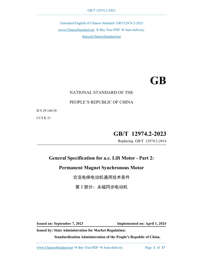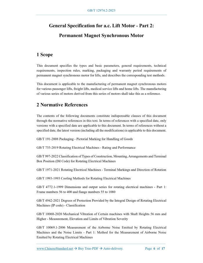 Similar standardsGB/T 12974.2-2023: General specification for a. c. lift motor - Part 2: Permanent magnet synchronous motor---This is an excerpt. Full copy of true-PDF in English version (including equations, symbols, images, flow-chart, tables, and figures etc.), auto-downloaded/delivered in 9 seconds, can be purchased online: https://www.ChineseStandard.net/PDF.aspx/GBT12974.2-2023 GB NATIONAL STANDARD OF THE PEOPLE’S REPUBLIC OF CHINA ICS 29.160.30 CCS K 21 Replacing GB/T 12974.2-2014 General Specification for a.c. Lift Motor - Part 2: Permanent Magnet Synchronous Motor ISSUED ON: SEPTEMBER 7, 2023 IMPLEMENTED ON: APRIL 1, 2024 Issued by: State Administration for Market Regulation; Standardization Administration of the People’s Republic of China. Table of ContentsForeword ... 3 Introduction ... 5 1 Scope ... 6 2 Normative References ... 6 3 Terms and Definitions ... 7 4 Types and Basic Parameters ... 7 5 General Requirements ... 8 6 Technical Requirements ... 8 7 Test Methods ... 12 8 Inspection Rules ... 14 9 Marking, Packaging and Warranty Period ... 16 General Specification for a.c. Lift Motor - Part 2: Permanent Magnet Synchronous Motor1 ScopeThis document specifies the types and basic parameters, general requirements, technical requirements, inspection rules, marking, packaging and warranty period requirements of permanent magnet synchronous motor for lifts, and describes the corresponding test methods. This document is applicable to the manufacturing of permanent magnet synchronous motors for various passenger lifts, freight lifts, medical service lifts and home lifts. The manufacturing of various series of motors derived from this series of motors shall take this as a reference.2 Normative ReferencesThe contents of the following documents constitute indispensable clauses of this document through the normative references in this text. In terms of references with a specified date, only versions with a specified date are applicable to this document. In terms of references without a specified date, the latest version (including all the modifications) is applicable to this document. GB/T 191-2008 Packaging - Pictorial Marking for Handling of Goods GB/T 755-2019 Rotating Electrical Machines - Rating and Performance GB/T 997-2022 Classification of Types of Construction, Mounting, Arrangements and Terminal Box Position (IM Code) for Rotating Electrical Machines GB/T 1971-2021 Rotating Electrical Machines - Terminal Markings and Direction of Rotation GB/T 1993-1993 Cooling Methods for Rotating Electrical Machines GB/T 4772.1-1999 Dimensions and output series for rotating electrical machines - Part 1: Frame numbers 56 to 400 and flange numbers 55 to 1080 GB/T 4942-2021 Degrees of Protection Provided by the Integral Design of Rotating Electrical Machines (IP code) - Classification GB/T 10068-2020 Mechanical Vibration of Certain machines with Shaft Heights 56 mm and Higher - Measurement, Elevation and Limits of Vibration Severity GB/T 10069.1-2006 Measurement of the Airborne Noise Emitted by Rotating Electrical Machines and the Noise Limits - Part 1: Method for the Measurement of Airborne Noise Emitted by Rotating Electrical Machines GB/T 12665-2017 Requirements of Damp-heat Testing of Electrical Machine for Service in General Environmental Condition GB/T 14711 Safety Requirements of Small and Medium Size Rotating Electrical Machines GB/T 22669-2008 Test Procedures for Three-phase Permanent Magnet Synchronous Machines GB/T 22719.1-2008 Interturn Insulation of Radom-wound Winding for AC Low-voltage Electrical Machines - Part 1: Test Methods GB/T 22719.2-2008 Interturn Insulation of Random-wound Winding for AC Low-voltage Electrical Machines - Part 2: Test Limits3 Terms and DefinitionsThis document does not have terms or definitions that need to be defined.4 Types and Basic Parameters4.1 Types 4.1.1 The protection degree provided by the enclosure of permanent magnet synchronous motor for lifts (hereinafter referred to as the motor) is IP20 or IP54 in accordance with the stipulations of GB/T 4942-2021. 4.1.2 The cooling method for the motor shall be IC00, IC01 or IC06 in accordance with the stipulations of GB/T 1993-1993. 4.1.3 The structure and mounting type of the motor shall be IM B3, IM B5 and IM B35 in accordance with the stipulations of GB/T 997-2022. 4.2 Basic Parameters 4.2.1 The motor shall operate in an intermittent cycle (S5). The number of starts per hour can be divided into 120 times/h and 180 times/h in accordance with the different requirements of the lifts. The load sustained rate of the motor shall be 15%, 40%, 50% or 60%. 4.2.2 The rated voltage of the motor frequency conversion device shall be 380 V, and the rated frequency shall be 50 Hz. 4.2.3 The number of poles of the motor is divided into 6 poles, 8 poles, 10 poles, 12 poles, 16 poles, 20 poles, 24 poles, 32 poles and 48 poles. 4.2.4 The motor shall be manufactured in accordance with the following rated powers: 0.55 kW, 0.75 kW, 1.1 kW, 1.5 kW, 2.2 kW, 3 kW, 4 kW, 5.5 kW, 7.5 kW, 11 kW, 15 kW, 18.5 kW, 22 kW, 25 kW, 25 kW, 30 kW, 37 kW, 45 kW, 55 kW, 75 kW, 90 kW, 110 kW. 4.2.5 When the motor is operating at the rated speed, the rated torque and rated power shall be converted in accordance with Formula (1): Where, TN---the rated torque of the motor, expressed in (N m); P2---the rated power of the motor, expressed in (kW); nN---the rated speed of the motor, expressed in (r/min).5 General Requirements5.1 Under the following altitude and ambient air temperature conditions, the motor shall be capable of rated operation: a) The altitude does not exceed 1,000 m; b) The maximum ambient air temperature changes with the seasons, but does not exceed 40 C; c) The minimum ambient air temperature is 5 C; d) The ambient air does not contain corrosive and flammable gases; e) The surrounding environment of the installation site does not affect the normal ventilation of the motor. Deviations in on-site operating conditions shall be