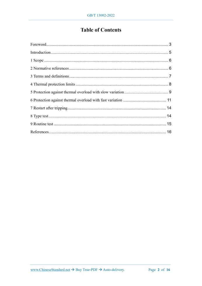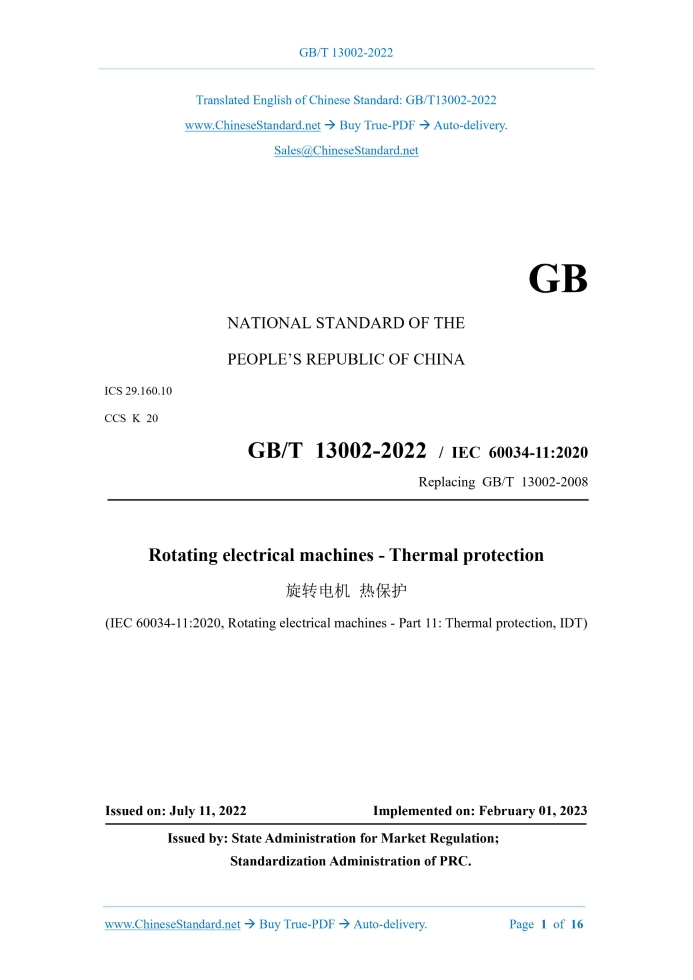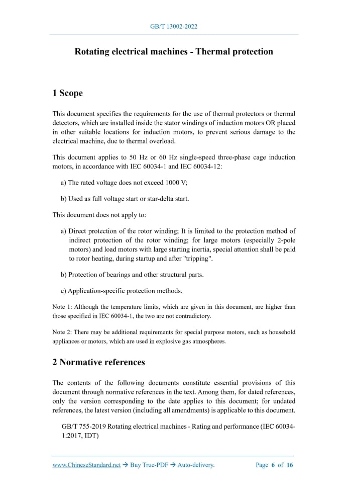 Similar standardsGB/T 13002-2022: Rotating electrical machines - Thermal protection---This is an excerpt. Full copy of true-PDF in English version (including equations, symbols, images, flow-chart, tables, and figures etc.), auto-downloaded/delivered in 9 seconds, can be purchased online: https://www.ChineseStandard.net/PDF.aspx/GBT13002-2022NATIONAL STANDARD OF THE PEOPLE’S REPUBLIC OF CHINA ICS 29.160.10 CCS K 20 GB/T 13002-2022 / IEC 60034-11:2020 Replacing GB/T 13002-2008 Rotating electrical machines - Thermal protection (IEC 60034-11:2020, Rotating electrical machines - Part 11: Thermal protection, IDT) ISSUED ON: JULY 11, 2022 IMPLEMENTED ON: FEBRUARY 01, 2023 Issued by: State Administration for Market Regulation; Standardization Administration of PRC. Table of ContentsForeword ... 3 Introduction ... 5 1 Scope ... 6 2 Normative references ... 6 3 Terms and definitions... 7 4 Thermal protection limits ... 8 5 Protection against thermal overload with slow variation ... 9 6 Protection against thermal overload with fast variation ... 11 7 Restart after tripping ... 14 8 Type test ... 14 9 Routine test ... 15 References ... 16 Rotating electrical machines - Thermal protection1 ScopeThis document specifies the requirements for the use of thermal protectors or thermal detectors, which are installed inside the stator windings of induction motors OR placed in other suitable locations for induction motors, to prevent serious damage to the electrical machine, due to thermal overload. This document applies to 50 Hz or 60 Hz single-speed three-phase cage induction motors, in accordance with IEC 60034-1 and IEC 60034-12: a) The rated voltage does not exceed 1000 V; b) Used as full voltage start or star-delta start. This document does not apply to: a) Direct protection of the rotor winding; It is limited to the protection method of indirect protection of the rotor winding; for large motors (especially 2-pole motors) and load motors with large starting inertia, special attention shall be paid to rotor heating, during startup and after "tripping". b) Protection of bearings and other structural parts. c) Application-specific protection methods. Note 1: Although the temperature limits, which are given in this document, are higher than those specified in IEC 60034-1, the two are not contradictory. Note 2: There may be additional requirements for special purpose motors, such as household appliances or motors, which are used in explosive gas atmospheres.2 Normative referencesThe contents of the following documents constitute essential provisions of this document through normative references in the text. Among them, for dated references, only the version corresponding to the date applies to this document; for undated references, the latest version (including all amendments) is applicable to this document. GB/T 755-2019 Rotating electrical machines - Rating and performance (IEC 60034- 1:2017, IDT) GB/T 21210-2016 Starting performance of single-speed three-phase cage induction motors (IEC 60034-12:2016, IDT)3 Terms and definitionsThe following terms and definitions apply to this document. ISO and IEC maintain terminology databases for standardization at: IEC Electropedia: http://www.electropedia.org/ ISO Online Browsing Platform: http://www.iso.org/obp 3.1 Thermal protection It is used to protect the windings of rotating electrical machines from thermal overload or cooling system failure and cause excessive temperature. 3.2 Thermal protection system A protection system, that protects the windings of rotating electrical machines from thermal overloading or cooling system failures resulting in overheating, by means of thermal protectors or thermal detectors. 3.3 Thermal detector Electrical insulating devices, that are only sensitive to temperature; it can play a switching function in the protection system, when the temperature reaches a preset value. 3.4 Thermal protector The electrical insulating device, which is sensitive to the temperature of the current- carrying electrical machine winding; it can directly disconnect the power supply of the electrical machine, when the temperature reaches a preset value. NOTE: Some thermal protectors are sensitive to temperature and current; a combination of the two effects triggers a switch in the system, causing it to cut off power. 3.55 Protection against thermal overload with slow variationWhen encountering thermal overload with slow variation, which is caused by thermal overload or violation of electrical machine operating procedures, the protection system will act, to prevent the electrical machine's winding temperature from rising AND make it not exceed the value in Table 1. Figures 1 and 2 give examples of temperature, as a function of time, to change with time. The determination of the winding temperature shall meet the requirements of the resistance method, which is specified in 8.6.2 of GB/T 755-2019. Note 1: If the electrical machine runs for a long time under the limits, which are specified in Table 1, the limit of insulation winding temperature will exceed the thermal grading, to which it belongs, which will lead to a shortened life of the electrical machine. Note 2: The maximum temperature is determined empirically. The thermal overload with slow variation can be caused by: ● Failure of ventilation or ventilation system, due to excessive accumulation of dust on the ventilation pipe, or adhesion of dirt on components such as windings or cooling ribs of the frame; ● The ambient temperature or the temperature of the cooling medium is too high; ● The slowly increasing mechanical overload; ● The electrical machine voltage is under-voltage, over-voltage or unbalanced for a long time; ● The intermittent duty electrical machine runs in violation of its specified working mode; ● Frequency deviation. 3 - Normal periodic work; 4 - Time when the thermal overload with slow variation starts; X - Time coordinate; Y - Temperature coordinate. Figure 2 -- Exam