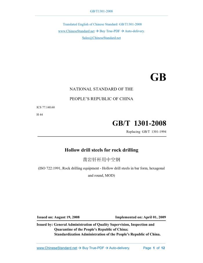 GB/T 1301-2008: Hollow drill steels for rock drilling Delivery: 9 seconds. True-PDF full-copy in English & invoice will be downloaded + auto-delivered via email. See step-by-step procedure Status: Valid GB/T 1301: Historical versions