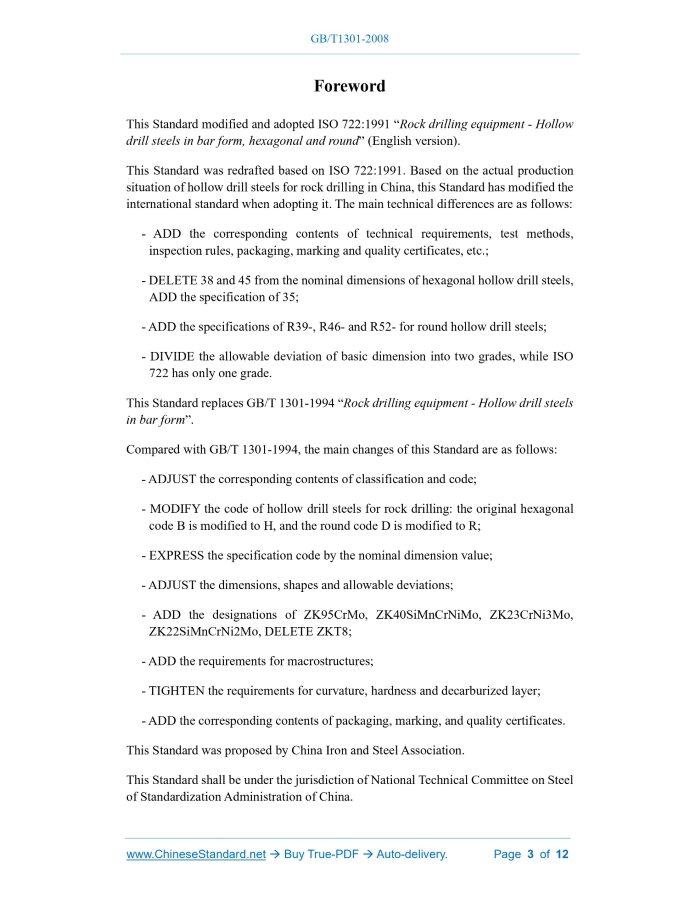 Similar standardsGB/T 1301-2008: Hollow drill steels for rock drilling---This is an excerpt. Full copy of true-PDF in English version (including equations, symbols, images, flow-chart, tables, and figures etc.), auto-downloaded/delivered in 9 seconds, can be purchased online: https://www.ChineseStandard.net/PDF.aspx/GBT1301-2008GB NATIONAL STANDARD OF THE PEOPLE’S REPUBLIC OF CHINA ICS 77.140.60 H 44 GB/T 1301-2008 Replacing GB/T 1301-1994 Hollow drill steels for rock drilling (ISO 722:1991, Rock drilling equipment - Hollow drill steels in bar form, hexagonal and round, MOD) ISSUED ON: AUGUST 19, 2008 IMPLEMENTED ON: APRIL 01, 2009 Issued by: General Administration of Quality Supervision, Inspection and Quarantine of the People's Republic of China; Standardization Administration of the People’s Republic of China. Table of ContentsForeword ... 3 1 Scope ... 5 2 Normative references ... 5 3 Classification and code ... 6 4 Dimensions, shapes and allowable deviations ... 7 5 Technical requirements ... 10 6 Test methods ... 11 7 Inspection rules ... 12 8 Packaging, marking and quality certificates ... 12ForewordThis Standard modified and adopted ISO 722:1991 “Rock drilling equipment - Hollow drill steels in bar form, hexagonal and round” (English version). This Standard was redrafted based on ISO 722:1991. Based on the actual production situation of hollow drill steels for rock drilling in China, this Standard has modified the international standard when adopting it. The main technical differences are as follows: - ADD the corresponding contents of technical requirements, test methods, inspection rules, packaging, marking and quality certificates, etc.; - DELETE 38 and 45 from the nominal dimensions of hexagonal hollow drill steels, ADD the specification of 35; - ADD the specifications of R39-, R46- and R52- for round hollow drill steels; - DIVIDE the allowable deviation of basic dimension into two grades, while ISO 722 has only one grade. This Standard replaces GB/T 1301-1994 “Rock drilling equipment - Hollow drill steels in bar form”. Compared with GB/T 1301-1994, the main changes of this Standard are as follows: - ADJUST the corresponding contents of classification and code; - MODIFY the code of hollow drill steels for rock drilling: the original hexagonal code B is modified to H, and the round code D is modified to R; - EXPRESS the specification code by the nominal dimension value; - ADJUST the dimensions, shapes and allowable deviations; - ADD the designations of ZK95CrMo, ZK40SiMnCrNiMo, ZK23CrNi3Mo, ZK22SiMnCrNi2Mo, DELETE ZKT8; - ADD the requirements for macrostructures; - TIGHTEN the requirements for curvature, hardness and decarburized layer; - ADD the corresponding contents of packaging, marking, and quality certificates. This Standard was proposed by China Iron and Steel Association. This Standard shall be under the jurisdiction of National Technical Committee on Steel of Standardization Administration of China. Hollow drill steels for rock drilling1 ScopeThis Standard specifies the classification and code, dimensions, shapes and allowable deviations, technical requirements, test methods, inspection rules, packaging, marking and quality certificates of hexagonal and round hollow drill steels for rock drilling. This Standard applies to hexagonal and round hollow drill steels for rock drilling.2 Normative referencesThe following referenced documents are indispensable for the application of this document. For dated references, only the edition cited applies. For undated references, the latest edition of the referenced document (including any amendments) applies. GB/T 222 Permissible tolerances for chemical composition of steel products GB/T 223.11 Iron, steel and alloy - Determination of chromium content - Visual titration or potentiometric titration method GB/T 223.14 Methods for chemical analysis of iron, steel and alloy - The N-benzoy- N-phenylhydroxylamine extraction photometric method for the determination of vanadium content GB/T 223.23 Iron, steel and alloy - Determination of nickel content - The dimethylglyoxime spectrophotometric method GB/T 223.25 Methods for chemical analysis of iron, steel and alloy - The dimethylglyoxime gravimetric method for the determination of nickel content GB/T 223.26 Iron, steel and alloy - Determination of molybdenum content - The thiocyanate spectrophotometric method GB/T 223.53 Methods for chemical analysis of iron, steel and alloy - The flame atomic absorption spectrophotometric method for the determination of copper content GB/T 223.60 Methods for chemical analysis of iron, steel and alloy - The perchloric acid dehydration gravimetric method for the determination of silicon content GB/T 223.62 Methods for chemical analysis of iron, steel and alloy - The butyl acetate extraction photometric method for the determination of phosphorus content GB/T 223.63 Methods for chemical analysis of iron, steel and alloy - The sodium (potassium) periodate photometric method for the determination of manganese content GB/T 223.68 Methods for chemical analysis of iron, steel and alloy - The potassium iodate titration method after combustion in the pipe furnace for the determination of sulfur content GB/T 223.71 Methods for chemical analysis of iron, steel and alloy - The gravimetric method after combustion in the pipe furnace for the determination of carbon content GB/T 223.75 Iron, steel and alloy - Determination of boron content - Methanol distillation-curcumin photometric method GB/T 224 Determination of depth of decarburization of steels GB/T 226 Test method for macrostructure and defect of steel by etching GB/T 230.1 Metallic Rockwell hardness test - Part 1: Test method (scales A, B, C, D, E, F, G, H, K, N, T) (GB/T 230.1-2004, ISO 6508-1:1999, MOD) GB/T 2101 General requirement of acceptance, packaging, marking and certification for section steel GB/T 4336 Standard test method for spark discharge atomic emission spectrometric analysis of carbo