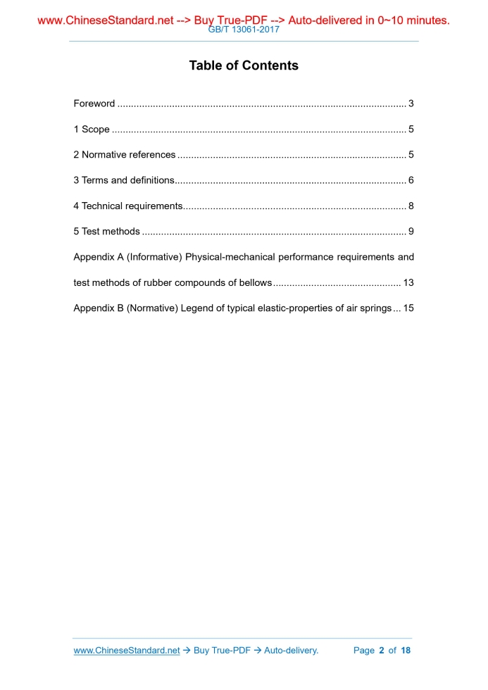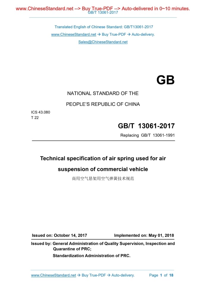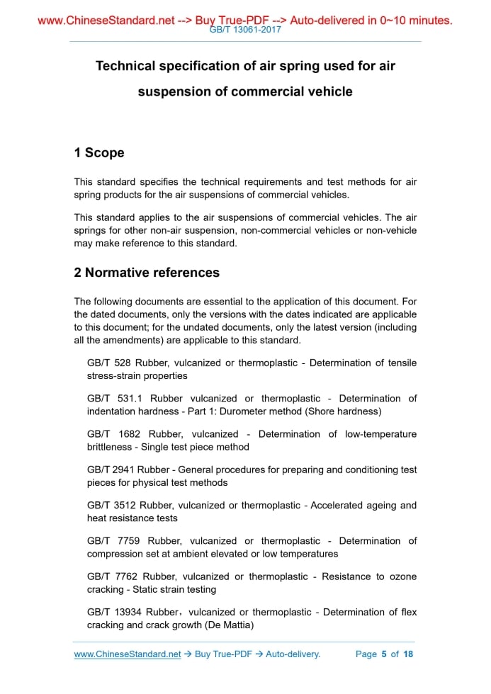 Similar standardsGB/T 13061-2017: Technical specification of air spring used for air suspension of commercial vehicle---This is an excerpt. Full copy of true-PDF in English version (including equations, symbols, images, flow-chart, tables, and figures etc.), auto-downloaded/delivered in 9 seconds, can be purchased online: https://www.ChineseStandard.net/PDF.aspx/GBT13061-2017 NATIONAL STANDARD OF THE PEOPLE’S REPUBLIC OF CHINA ICS 43.080 T 22 Replacing GB/T 13061-1991 Technical specification of air spring used for air suspension of commercial vehicle Issued on. OCTOBER 14, 2017 Implemented on. MAY 01, 2018 Issued by. General Administration of Quality Supervision, Inspection and Quarantine of PRC; Standardization Administration of PRC. Table of ContentsForeword... 3 1 Scope... 5 2 Normative references... 5 3 Terms and definitions... 6 4 Technical requirements... 8 5 Test methods... 9 Appendix A (Informative) Physical-mechanical performance requirements and test methods of rubber compounds of bellows... 13 Appendix B (Normative) Legend of typical elastic-properties of air springs... 15ForewordThis standard was drafted in accordance with the rules given in GB/T 1.1-2009. This standard replaces GB/T 13061-1991 “Air spring for automotive suspension - Rubber bellows”. As compared with GB/T 13061-1991, the main changes of this standard are as follows. - MODIFY the standard name from the original “Air spring for automotive suspension - Rubber bellows” to “Technical specification of air spring used for air suspension of commercial vehicle”; - MODIFY the scope from the original “automotive suspension” to “air suspension for commercial vehicle”; - MODIFY the terms and definitions (see clause 3 of the 1991 version); - MODIFY the technical requirements for the physical-mechanical properties of the materials of air spring bellows, the appearance quality of the air spring, the internal destructive pressure, the fatigue life of the frame of air spring (see 5.1, 5.2, 5.5, 5.7 of the 1991 version); - MODIFY the test items, test conditions, test methods (see 6.1, 6.3, 6.5 of the 1991 version); - MODIFY the airtightness test (see 6.5.3 of the 1991 version); - MODIFY the 24-h pressure drop of the air spring (see 5.4 of the 1991 version); - ADD the definitions of air spring height, design height, maximum internal pressure, effective diameter, air spring volume (see 3.1, 3.3, 3.5, 3.8, 3.12); - ADD the compressive permanent deformation test, low-temperature resistance test, hot-air aging test, ozone aging resistance test in the test of physical-mechanical performance of the rubber compound of bellows (see A.3.3.2, A.3.3.5, A.3.3.6, A.3.3.7); - ADD the ambient temperature for the use of air spring (see 4.1.1); - ADD the dynamic elastic performance tests and volume tests (see 5.5.3.1 and 5.5.4); - DELETE the product classifications (see clause 4 of the 1991 version); - DELETE the interlayer adhesion strength between the cord fabrics of bellows (see 5.6 of the 1991 version); - DELETE the telescopic test and the peel test (see clause 6.5.2, 6.5.6 of the 1991 version); - DELETE the inspection rules (see clause 7 of the 1991 version); - DELETE the marking, packaging, transportation, storage (see clause 8 of the 1991 version). This standard was proposed by the Ministry of Industry and Information Technology. This standard shall be under the jurisdiction of the National Automotive Standardization Technical Committee (SAC/TC 114). Drafting organizations of this standard. Dongfeng Motor Corporation, Zhuzhou Times New Materials Technology Co., Ltd., Shandong Meichen Technology Co., Ltd., Shanghai Keman Vehicle Parts System Co., Ltd., Guizhou Gaoma Fuguo Advance Rubber Co., Ltd., Xiamen Jinlong United Automobile Industry Co., Ltd., Zhengzhou Nissan Automobile Co., Ltd. The main drafters of this standard. Feng Mei, Chen Yaoming, Ye Aifeng, Yu Boying, Zhang Shangjiao, Wang Jin, Liu Jin, Cheng Haitao, Wang Sheng, Qiu Jianjun, Zhang Guangshi, He Yunjiang, Yuan Zhaohui, Pan Xueyu, Cui Jining, Zhang Liancang, Wang Lianping, Yang Guoku, Gao Jia. This standard replaces the standard previously issued as follows. - GB/T 13061-1991. Technical specification of air spring used for air suspension of commercial vehicle1 ScopeThis standard specifies the technical requirements and test methods for air spring products for the air suspensions of commercial vehicles. This standard applies to the air suspensions of commercial vehicles. The air springs for other non-air suspension, non-commercial vehicles or non-vehicle may make reference to this standard.2 Normative referencesThe following documents are essential to the application of this document. For the dated documents, only the versions with the dates indicated are applicable to this document; for the undated documents, only the latest version (including all the amendments) are applicable to this standard. GB/T 528 Rubber, vulcanized or thermoplastic - Determination of tensile stress-strain properties GB/T 531.1 Rubber vulcanized or thermoplastic - Determination of indentation hardness - Part 1.Durometer method (Shore hardness) GB/T 1682 Rubber, vulcanized - Determination of low-temperature brittleness - Single test piece method GB/T 2941 Rubber - General procedures for preparing and conditioning test pieces for physical test methods GB/T 3512 Rubber, vulcanized or thermoplastic - Accelerated ageing and heat resistance tests GB/T 7759 Rubber, vulcanized or thermoplastic - Determination of compression set at ambient elevated or low temperatures3 Terms and definitionsThe terms and definitions as defined in GB/T 34591 as well as the following terms and definitions apply to this document. 3.1 Air spring height The distance between the upper and lower support planes for installation of the air spring. 3.2 Standard height A reference height of the air spring, which is used as the start point for the calculation of deformation. 3.3 Design height The installation height of 