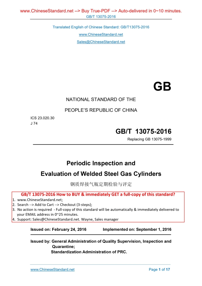GB/T 13075-2016: Periodic Inspection and Evaluation of Welded Steel Gas Cylinders Delivery: 9 seconds. True-PDF full-copy in English & invoice will be downloaded + auto-delivered via email. See step-by-step procedure Status: Valid GB/T 13075: Historical versions