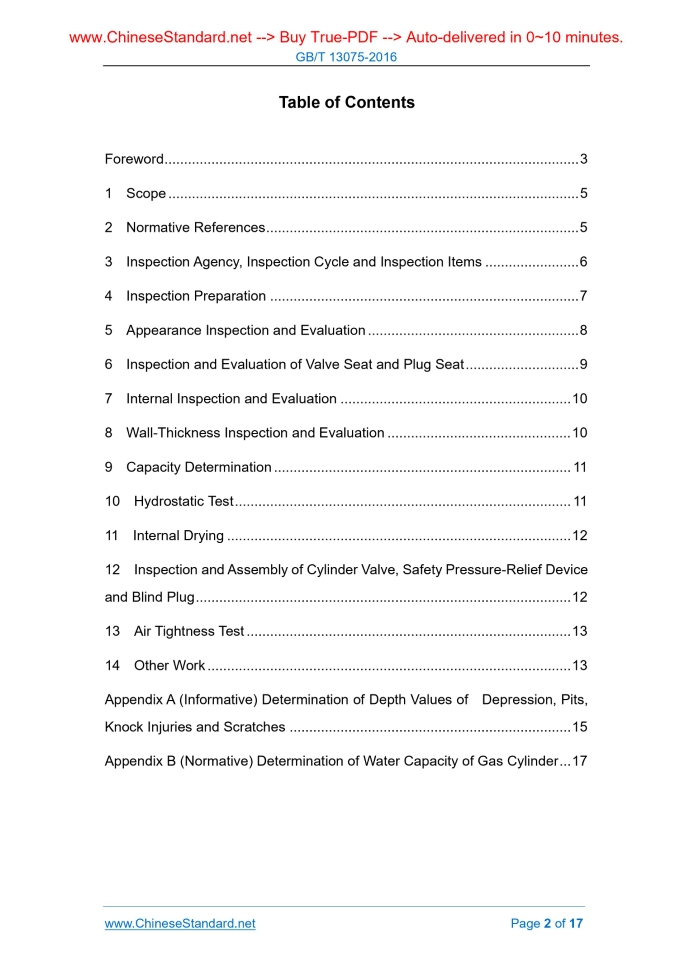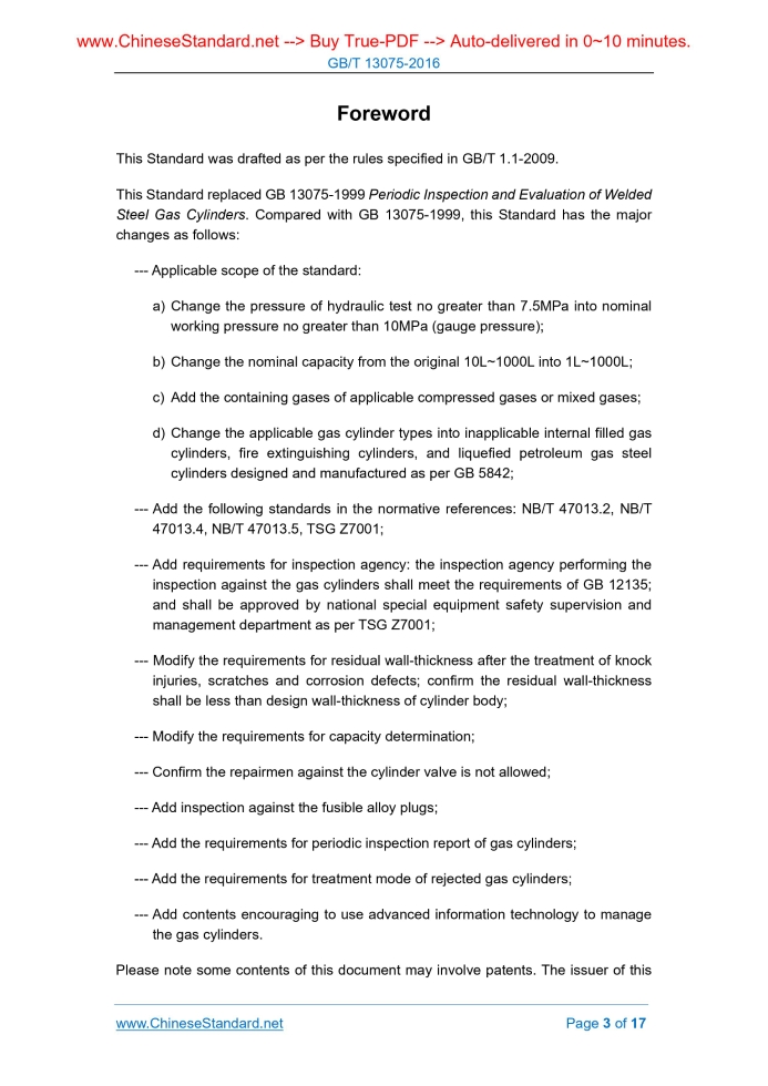 Similar standardsGB/T 13075-2016: Periodic Inspection and Evaluation of Welded Steel Gas Cylinders---This is an excerpt. Full copy of true-PDF in English version (including equations, symbols, images, flow-chart, tables, and figures etc.), auto-downloaded/delivered in 9 seconds, can be purchased online: https://www.ChineseStandard.net/PDF.aspx/GBT13075-2016GB NATIONAL STANDARD OF THE PEOPLE’S REPUBLIC OF CHINA ICS 23.020.30 J 74 Replacing GB 13075-1999 Periodic Inspection and Evaluation of Welded Steel Gas Cylinders Issued on: FEBRUARY 24, 2016 Implemented on: SEPTEMBER 1, 2016 Issued by. General Administration of Quality Supervision, Inspection and Quarantine; Standardization Administration of PRC. Table of ContentsForeword ... 3 1 Scope ... 5 2 Normative References ... 5 3 Inspection Agency, Inspection Cycle and Inspection Items ... 6 4 Inspection Preparation ... 7 5 Appearance Inspection and Evaluation ... 8 6 Inspection and Evaluation of Valve Seat and Plug Seat ... 9 7 Internal Inspection and Evaluation ... 10 8 Wall-Thickness Inspection and Evaluation ... 10 9 Capacity Determination ... 11 10 Hydrostatic Test ... 11 11 Internal Drying ... 12 12 Inspection and Assembly of Cylinder Valve, Safety Pressure-Relief Device and Blind Plug ... 12 13 Air Tightness Test ... 13 14 Other Work ... 13 Appendix A (Informative) Determination of Depth Values of Depression, Pits, Knock Injuries and Scratches ... 15 Appendix B (Normative) Determination of Water Capacity of Gas Cylinder ... 17ForewordThis Standard was drafted as per the rules specified in GB/T 1.1-2009. This Standard replaced GB 13075-1999 Periodic Inspection and Evaluation of Welded Steel Gas Cylinders. Compared with GB 13075-1999, this Standard has the major changes as follows. --- Applicable scope of the standard. a) Change the pressure of hydraulic test no greater than 7.5MPa into nominal working pressure no greater than 10MPa (gauge pressure); b) Change the nominal capacity from the original 10L~1000L into 1L~1000L; c) Add the containing gases of applicable compressed gases or mixed gases; d) Change the applicable gas cylinder types into inapplicable internal filled gas cylinders, fire extinguishing cylinders, and liquefied petroleum gas steel cylinders designed and manufactured as per GB 5842; --- Add the following standards in the normative references. NB/T 47013.2, NB/T 47013.4, NB/T 47013.5, TSG Z7001; --- Add requirements for inspection agency. the inspection agency performing the inspection against the gas cylinders shall meet the requirements of GB 12135; and shall be approved by national special equipment safety supervision and management department as per TSG Z7001; --- Modify the requirements for residual wall-thickness after the treatment of knock injuries, scratches and corrosion defects; confirm the residual wall-thickness shall be less than design wall-thickness of cylinder body; --- Modify the requirements for capacity determination; --- Confirm the repairmen against the cylinder valve is not allowed; --- Add inspection against the fusible alloy plugs; --- Add the requirements for periodic inspection report of gas cylinders; --- Add the requirements for treatment mode of rejected gas cylinders; --- Add contents encouraging to use advanced information technology to manage the gas cylinders. Please note some contents of this document may involve patents. The issuer of this Periodic Inspection and Evaluation of Welded Steel Gas Cylinders1 ScopeThis Standard specifies the basic method sand technical requirements for periodic inspection and evaluation of welded steel gas cylinders (hereinafter refers to as “gas cylinder”). This Standard is applicable to the periodic inspection and evaluation of welded steel gas cylinders that can contain compressed gases, low-pressure liquefied gases or mixed gases, and can be re-filled with nominal working pressure no greater than 10MPa (gauge pressure), nominal capacity 1L~1000L. This Standard is not applicable to the internal filled gas cylinders, fire extinguishing gas cylinders, and liquefied petroleum gas cylindered designed and manufactured as per GB 5842.2 Normative ReferencesThe following documents are essential to the application of this document. For the dated documents, only the versions with the dates indicated are applicable to this document; for the undated documents, only the latest version (including all the amendments) are applicable to this document. GB 5100 Welded Steel Gas Cylinders GB 7144 Coloured Cylinder Mark for Gases GB 8335 Special Threads for Gas Cylinders GB/T 8336 Special Thread Gauges for Gas Cylinders GB/T 9251 Methods for Hydrostatic Test of Gas Cylinders GB/T 10878 Special Taps of Taper Thread for Gas Cylinders GB 12135 Technological Specifications for Periodic Inspection Station of Gas Cylinders GB/T 12137 Methods for Leakage Test of Gas Cylinders NB/T 47013.2 Nondestructive Testing of Pressure Equipment – Part 2. Radiographic Testing NB/T 47013.4 Nondestructive Testing of Pressure Equipment – Part 4. Magnetic Particle Testing NB/T 47013.5 Nondestructive Testing of Pressure Equipment – Part 5. Penetrant Testing TSG R0006 Gas Cylinder Safety Specification TSG Z7001 Accreditation Criteria on Special Equipment Inspection Agencies3 Inspection Agency, Inspection Cycle and InspectionItems 3.1 Inspection agency The inspection agency performing the periodic inspection of gas cylinder shall meet the requirements of GB 12135; and shall be approved by national special equipment safety supervision and management department as per TSG Z7001. 3.2 Inspection cycle The gas cylinder containing non-corrosive high-purity gases with purity greater than or equal to 99.999% shall be inspected once every 5 years; the gas cylinder containing the gas generated corrosive role against the cylinder materials, submerge gas cylinder, as well as gas cylinder in constant contact with seawater shall be inspected once every 2 years; while the gas cylinder containing other g