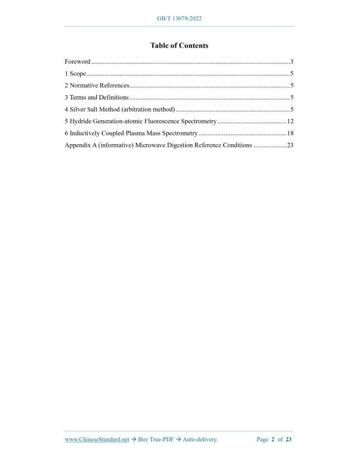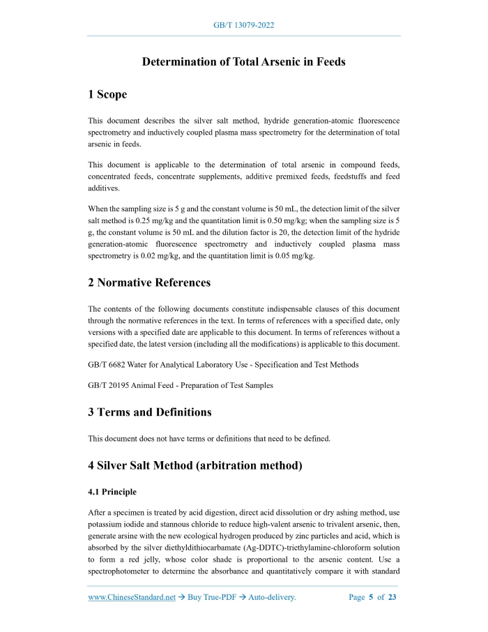 Similar standardsGB/T 13079-2022: Determination of total arsenic in feeds---This is an excerpt. Full copy of true-PDF in English version (including equations, symbols, images, flow-chart, tables, and figures etc.), auto-downloaded/delivered in 9 seconds, can be purchased online: https://www.ChineseStandard.net/PDF.aspx/GBT13079-2022GB NATIONAL STANDARD OF THE PEOPLE’S REPUBLIC OF CHINA ICS 65.120 CCS B 46 Replacing GB/T 13079-2006 Determination of Total Arsenic in Feeds Issued on. DECEMBER 30, 2022 Implemented on. JULY 1, 2023 Issued by. State Administration for Market Regulation; Standardization Administration of the People’s Republic of China. Table of ContentsForeword... 3 1 Scope... 5 2 Normative References... 5 3 Terms and Definitions... 5 4 Silver Salt Method (arbitration method)... 5 5 Hydride Generation-atomic Fluorescence Spectrometry... 12 6 Inductively Coupled Plasma Mass Spectrometry... 18 Appendix A (informative) Microwave Digestion Reference Conditions... 231 ScopeThis document describes the silver salt method, hydride generation-atomic fluorescence spectrometry and inductively coupled plasma mass spectrometry for the determination of total arsenic in feeds. This document is applicable to the determination of total arsenic in compound feeds, concentrated feeds, concentrate supplements, additive premixed feeds, feedstuffs and feed additives. When the sampling size is 5 g and the constant volume is 50 mL, the detection limit of the silver salt method is 0.25 mg/kg and the quantitation limit is 0.50 mg/kg; when the sampling size is 5 g, the constant volume is 50 mL and the dilution factor is 20, the detection limit of the hydride generation-atomic fluorescence spectrometry and inductively coupled plasma mass spectrometry is 0.02 mg/kg, and the quantitation limit is 0.05 mg/kg.2 Normative ReferencesThe contents of the following documents constitute indispensable clauses of this document through the normative references in the text. In terms of references with a specified date, only versions with a specified date are applicable to this document. In terms of references without a specified date, the latest version (including all the modifications) is applicable to this document. GB/T 6682 Water for Analytical Laboratory Use - Specification and Test Methods GB/T 20195 Animal Feed - Preparation of Test Samples3 Terms and DefinitionsThis document does not have terms or definitions that need to be defined.4 Silver Salt Method (arbitration method)4.1 Principle After a specimen is treated by acid digestion, direct acid dissolution or dry ashing method, use potassium iodide and stannous chloride to reduce high-valent arsenic to trivalent arsenic, then, generate arsine with the new ecological hydrogen produced by zinc particles and acid, which is absorbed by the silver diethyldithiocarbamate (Ag-DDTC)-triethylamine-chloroform solution to form a red jelly, whose color shade is proportional to the arsenic content. 4.2 Reagents or Materials WARNING---handle all kinds of strong acids with caution. Dilute and use them in a fume hood. When using perchloric acid, be careful not to burn it to dryness, and be careful of explosion. 4.3 Instruments and Equipment 4.3.1 Spectrophotometer. with a wavelength accuracy of 2 nm. 4.3.2 Analytical balance. with an accuracy of 0.0001 g. 4.3.3 Electric drying oven. with a temperature control accuracy of 5 C. 4.4 Sample In accordance with GB/T 20195, prepare the sample of at least 200 g. Make it all pass through the analysis sieve with a pore size of 0.425 mm, thoroughly mix it, put it into a closed container and set it aside. 4.5.2 Determination 4.5.2.1 Preparation of standard series of solutions Accurately transfer-take 0.00 mL, 1.00 mL, 2.00 mL, 4.00 mL, 6.00 mL, 8.00 mL and 10.00 mL of the arsenic standard intermediate solution (4.2.20), respectively place them in arsenic reaction bottle, and use water to dilute to 30 mL. Add 10 mL of hydrochloric acid (4.2.3), mix it well, and follow the steps specified in 4.5.2.2, starting from the addition of 2 mL of potassium iodide solution (4.2.12). 4.6 Test Data Processing The total arsenic content w1 in the specimen, which is expressed in mass fraction and (mg/kg), is calculated in accordance with Formula (1). 4.7 Precision The ratio of the absolute difference between the two independent determination results obtained under repeatability conditions and their arithmetic mean, and the arithmetic mean shall comply with the requirements of Table 1.5 Hydride Generation-atomic Fluorescence Spectrometry5.1 Principle After a specimen is treated by acid digestion, direct acid dissolution or dry ashing method, add thiourea to pre-reduce pentavalent arsenic to trivalent arsenic, then, in an acidic environment, reduce it with potassium borohydride to generate gaseous arsine, which is loaded into a quartz atomizer by argon gas and decomposed into atomic arsenic. Under the excitation of the emitted light of an arsenic hollow cathode lamp, generate atomic fluorescence, whose fluorescence intensity is proportional to the concentration of arsenic in the determined solution. Adopt the external standard method for quantitative determination. 5.2 Reagents or Materials WARNING---handle all kinds of strong acids with caution. Dilute and use them in a fume hood. When using perchloric acid, be careful not to burn it to dryness, and be careful of explosion. Unless otherwise specified, use only analytically pure reagents. 5.2.1 Water. GB/T 6682, Grade-1. 5.2.2 Nitric acid. guaranteed reagent. 5.2.3 Hydrochloric acid. guaranteed reagent. 5.2.4 Sulfuric acid. guaranteed reagent. 5.2.5 Hydrogen peroxide. 5.2.6 Magnesium oxide. Total Arsenic Content (w1)/(mg/kg) Relative Deviation/% 5.2.7 Magnesium nitrate. 5.2.8 Potassium hydroxide. guaranteed reagent. 5.2.9 Potassium borohydride. guaranteed reagent. 5.3 Instruments and Equipment 5.3.1 Atomic fluorescence spectrophotometer. 5.3.2 Analytical balance. with an accuracy of 0.0001 g. 5.4 Sample 