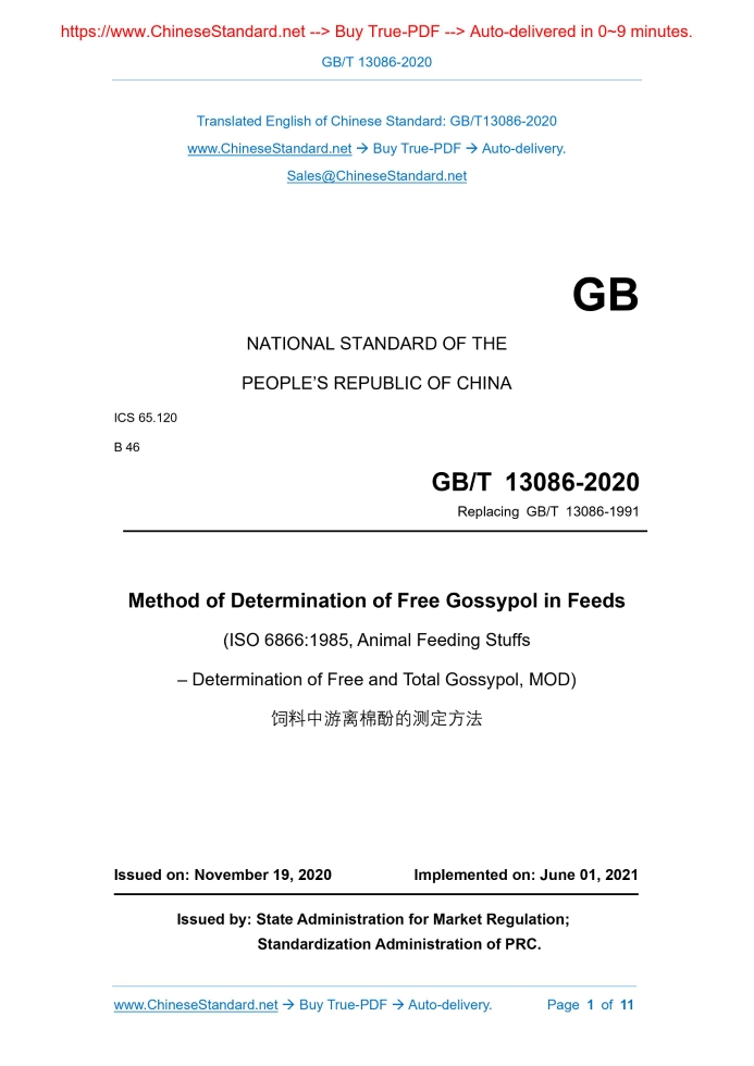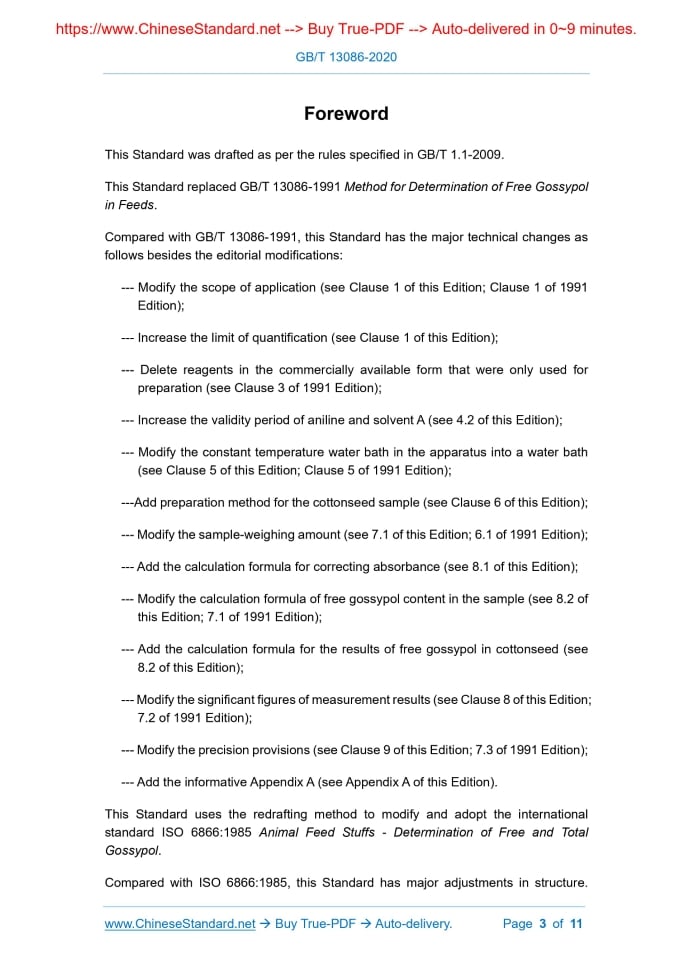 Similar standardsGB/T 13086-2020: Method for determination of free gossypol in feeds---This is an excerpt. Full copy of true-PDF in English version (including equations, symbols, images, flow-chart, tables, and figures etc.), auto-downloaded/delivered in 9 seconds, can be purchased online: https://www.ChineseStandard.net/PDF.aspx/GBT13086-2020GB NATIONAL STANDARD OF THE PEOPLE’S REPUBLIC OF CHINA ICS 65.120 B 46 Replacing GB/T 13086-1991 Method of Determination of Free Gossypol in Feeds (ISO 6866:1985, Animal Feeding Stuffs – Determination of Free and Total Gossypol, MOD) ISSUED ON: NOVEMBER 19, 2020 IMPLEMENTED ON: JUNE 01, 2021 Issued by: State Administration for Market Regulation; Standardization Administration of PRC. Table of ContentsForeword ... 3 1 Scope ... 6 2 Normative References ... 6 3 Principle ... 6 4 Reagents and Materials ... 6 5 Apparatus ... 7 6 Samples ... 7 7 Test Procedures ... 8 8 Test Data Processing ... 9 9 Precision ... 10 Appendix A (Informative) Structural Changes between this Standard and ISO 6866:1985 ... 11ForewordThis Standard was drafted as per the rules specified in GB/T 1.1-2009. This Standard replaced GB/T 13086-1991 Method for Determination of Free Gossypol in Feeds. Compared with GB/T 13086-1991, this Standard has the major technical changes as follows besides the editorial modifications: --- Modify the scope of application (see Clause 1 of this Edition; Clause 1 of 1991 Edition); --- Increase the limit of quantification (see Clause 1 of this Edition); --- Delete reagents in the commercially available form that were only used for preparation (see Clause 3 of 1991 Edition); --- Increase the validity period of aniline and solvent A (see 4.2 of this Edition); --- Modify the constant temperature water bath in the apparatus into a water bath (see Clause 5 of this Edition; Clause 5 of 1991 Edition); ---Add preparation method for the cottonseed sample (see Clause 6 of this Edition); --- Modify the sample-weighing amount (see 7.1 of this Edition; 6.1 of 1991 Edition); --- Add the calculation formula for correcting absorbance (see 8.1 of this Edition); --- Modify the calculation formula of free gossypol content in the sample (see 8.2 of this Edition; 7.1 of 1991 Edition); --- Add the calculation formula for the results of free gossypol in cottonseed (see 8.2 of this Edition); --- Modify the significant figures of measurement results (see Clause 8 of this Edition; 7.2 of 1991 Edition); --- Modify the precision provisions (see Clause 9 of this Edition; 7.3 of 1991 Edition); --- Add the informative Appendix A (see Appendix A of this Edition). This Standard uses the redrafting method to modify and adopt the international standard ISO 6866:1985 Animal Feed Stuffs - Determination of Free and Total Gossypol. Compared with ISO 6866:1985, this Standard has major adjustments in structure. Appendix A lists the clause number comparison between this Standard and ISO 6866:1985. The technical differences and causes between this Standard and ISO 6866:1985 are as follows: --- Regarding the normative references, this Standard adjusts the technical differences to adapt to China's technical conditions. The adjusted conditions and technologies are reflected in Clause 2 Normative Reference. The specific adjustments are as follows: Delete the reference document ISO 6497 in ISO 6866:1985; Replace ISO 6498 by GB/T 20195 which is equivalent to adopting international standard; Add reference of GB/T 6682. --- The measurement wavelength of the absorbance value is changed from "the wavelength of maximum absorption (435nm~445nm)" to "the wavelength of 440nm" (see Clause 3, 7.3 of this Edition; 8.3.1.8 of ISO 6866:1985); --- Delete the content related to the determination of total gossypol (see 8.3.2 of ISO 6866:1985); --- Add the calculation formula of corrected absorbance [see Formula (1) of this Edition]; --- Delete the related content of total gossypol calculation (see 9.1 of ISO 6866:1985); --- Modify the calculation formula of free gossypol content in the sample [see Formula (2) of this Edition; 9.1 of ISO 6866:1985]; --- Add the calculation formula for the results of free gossypol in cottonseed [see Formula (3) of this Edition]; --- Delete the content of the test report (see Clause 10 of ISO 6866:1985). This Standard also makes the following editorial modifications: --- Modify the name of the standard; and delete the determination of total gossypol, which is suitable for the purpose of sampling in China; Please note that certain contents of this document may involve patents. The issuing agency of this document is not responsible for identifying these patents. Method of Determination of Free Gossypol in Feeds1 ScopeThis Standard specifies the spectrophotometric method for the determination of free gossypol in feeds. This Standard is applicable to the determination of free gossypol in compound feeds, concentrated feeds, concentrate supplements, cottonseed, cottonseed meal, and other feed materials (except cottonseed oil) containing cottonseed and cottonseed meal. The limit of quantification of this Standard is 20mg/kg.2 Normative ReferencesThe following documents are essential to the application of this document. For the dated documents, only the versions with the dates indicated are applicable to this document; for the undated documents, only the latest version (including all the amendments) is applicable to this document. GB/T 6682 Water for Analytical Laboratory Use - Specification and Test Methods (GB/T 6682-2008, ISO 3696:1987, MOD) GB/T 20195 Animal Feeding Stuffs - Preparation of Test Samples (GB/T 20195- 2006, ISO 6498:1998, IDT)3 PrincipleExtract the free gossypol in the sample by a mixture of isopropanol-n-hexane containing 3-Aminopropanol; and use the aniline to convert the gossypol into aniline gossypol with aniline. Measure the absorbance value at a wavelength of 440nm.4 Reagents and MaterialsUnless otherwise specified, only the analytically-pure reagents shall be used.