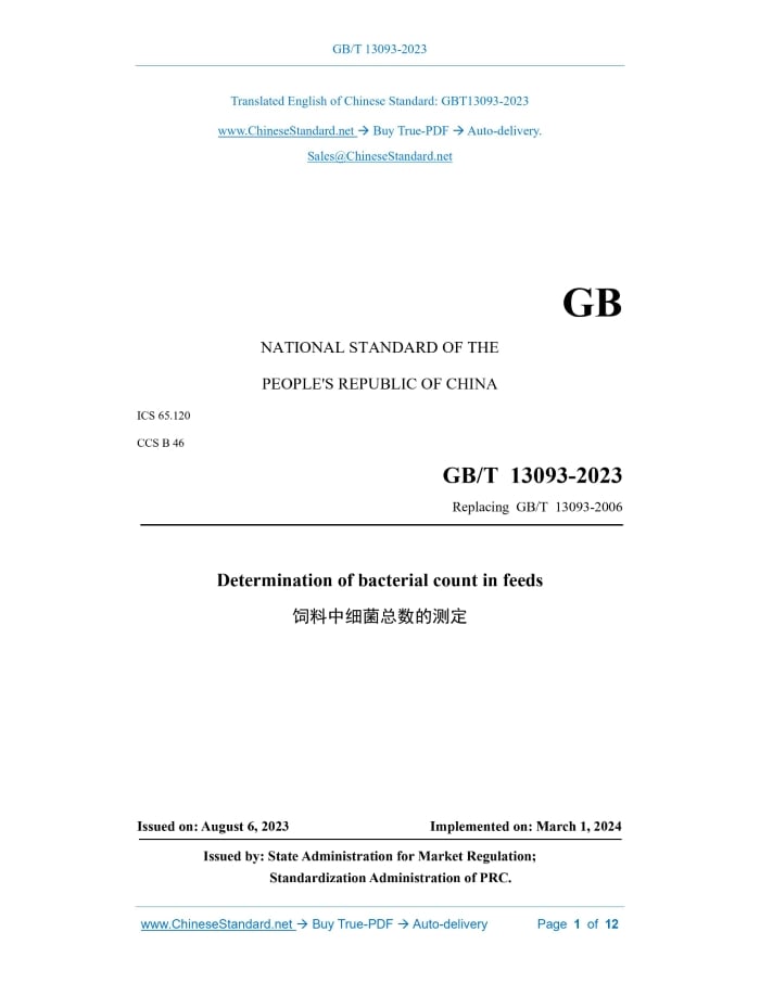 GB/T 13093-2023: Determination of bacterial count in feeds Delivery: 9 seconds. True-PDF full-copy in English & invoice will be downloaded + auto-delivered via email. See step-by-step procedure Status: Valid GB/T 13093: Historical versions