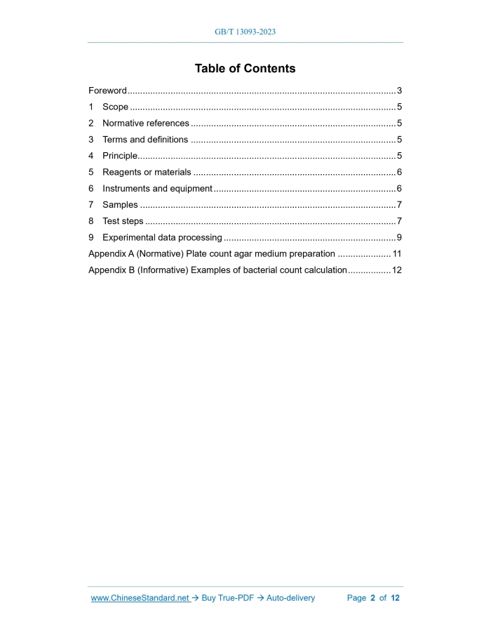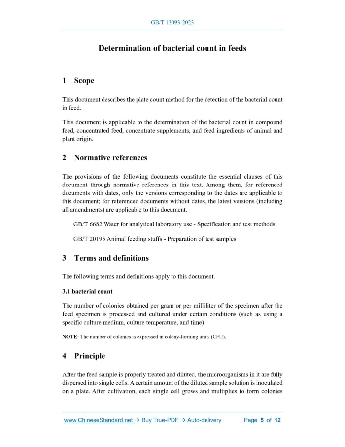 Similar standardsGB/T 13093-2023: Determination of bacterial count in feeds---This is an excerpt. Full copy of true-PDF in English version (including equations, symbols, images, flow-chart, tables, and figures etc.), auto-downloaded/delivered in 9 seconds, can be purchased online: https://www.ChineseStandard.net/PDF.aspx/GBT13093-2023GB NATIONAL STANDARD OF THE PEOPLE'S REPUBLIC OF CHINA ICS 65.120 CCS B 46 Replacing GB/T 13093-2006 Determination of bacterial count in feeds ISSUED ON: AUGUST 6, 2023 IMPLEMENTED ON: MARCH 1, 2024 Issued by: State Administration for Market Regulation; Standardization Administration of PRC. Table of ContentsForeword ... 3 1 Scope ... 5 2 Normative references ... 5 3 Terms and definitions ... 5 4 Principle... 5 5 Reagents or materials ... 6 6 Instruments and equipment ... 6 7 Samples ... 7 8 Test steps ... 7 9 Experimental data processing ... 9 Appendix A (Normative) Plate count agar medium preparation ... 11 Appendix B (Informative) Examples of bacterial count calculation ... 12 Determination of bacterial count in feeds1 ScopeThis document describes the plate count method for the detection of the bacterial count in feed. This document is applicable to the determination of the bacterial count in compound feed, concentrated feed, concentrate supplements, and feed ingredients of animal and plant origin.2 Normative referencesThe provisions of the following documents constitute the essential clauses of this document through normative references in this text. Among them, for referenced documents with dates, only the versions corresponding to the dates are applicable to this document; for referenced documents without dates, the latest versions (including all amendments) are applicable to this document. GB/T 6682 Water for analytical laboratory use - Specification and test methods GB/T 20195 Animal feeding stuffs - Preparation of test samples3 Terms and definitionsThe following terms and definitions apply to this document. 3.1 bacterial count The number of colonies obtained per gram or per milliliter of the specimen after the feed specimen is processed and cultured under certain conditions (such as using a specific culture medium, culture temperature, and time). NOTE: The number of colonies is expressed in colony-forming units (CFU).4 PrincipleAfter the feed sample is properly treated and diluted, the microorganisms in it are fully dispersed into single cells. A certain amount of the diluted sample solution is inoculated on a plate. After cultivation, each single cell grows and multiplies to form colonies visible to the naked eye, that is, a single colony shall represent a single cell in the original sample; the number of colonies is counted, and the number of bacteria in the feed can be calculated based on the dilution multiple and the sampling inoculation amount.5 Reagents or materialsUnless otherwise specified, only analytical-grade reagents are used. 5.1 Water: The grade 3 specified in GB/T 6682. 5.2 Sodium hydroxide solution (1 mol/L): Weigh 20 g of sodium hydroxide, dissolve it in water, cool to room temperature, and make up to 500 mL with water. 5.3 Hydrochloric acid solution (1 mol/L): Measure 42 mL of concentrated hydrochloric acid, dilute to 500 mL with water, and shake well. 5.4 Phosphate buffer stock solution: Weigh 34.0 g potassium dihydrogen phosphate and dissolve it in 500 mL water. Adjust the pH to 7.2 with about 175 mL of 1 mol/L sodium hydroxide solution, dilute to 1000 mL with water, mix well, and store at 2 °C~8 °C. 5.5 Sterile phosphate buffer: Take 1.25 mL of phosphate buffer stock solution (5.4), dilute to 1000 mL with water, dispense into suitable containers or 9 mL per tube, and sterilize by autoclaving at 121 °C for 15 min. 5.6 Sterile physiological saline: Weigh 8.5 g of sodium chloride, dissolve it in water, and make up to 1000 mL. Dispense into suitable containers or 9 mL per tube and sterilize by autoclaving at 121 ℃ for 15 min. 5.7 Plate count agar medium: Prepare according to Appendix A. 5.8 Sterile liquid paraffin: Take liquid paraffin and sterilize it by autoclaving at 121 ℃ for 20 min. 5.9 Sterile Tween 80: Take Tween 80 and sterilize it by autoclaving at 121 ℃ for 20 min.6 Instruments and equipment6.1 Constant temperature incubator: The temperature control accuracy is ±1 °C. 6.2 Slap homogenizer. 6.3 Constant temperature device: The temperature control accuracy is ±2 ℃. 8.1.2.2 Follow the procedure in 8.1.2.1 to make 10-fold incremental dilutions. The sterile pipette or micropipette tip shall be replaced after each incremental dilution. 8.1.2.3 According to the estimation of the contamination status of the sample, select 2 ~3 sample homogenates of appropriate serial dilutions, and pipette 1 mL of sample homogenate of each dilution into a sterile plate; make two plates for each dilution. At the same time, pipette 1 mL of sterile phosphate buffer or sterile physiological saline into a sterile plate as a blank control. 8.2 Cultivation After the dilution is transferred to the plate, promptly pour 15 mL~20 mL of the culture medium cooled to 46 ℃~50 ℃ (can be placed in a 48 ℃±2 ℃ constant temperature device) into the plate, and carefully rotate the plate to fully mix the sample and the culture medium. The time from diluting the sample to pouring the culture medium shall not exceed 30 min. If it is estimated that the sample may diffusely grow on the surface of the culture medium, after the culture medium is completely solidified, a thin layer of plate count agar medium (about 4 mL) cooled to 48 ℃±2 ℃ can be covered on the solidified agar surface. After the agar solidifies, invert the plate horizontally and culture it in a 36 ℃±1 ℃ constant temperature incubator for 48 h±2 h. 8.3 Bacterial colony counting 8.3.1 When counting bacterial colonies, observation can be made with the naked eye. If necessary, a magnifying glass or colony counter can be used to check to prevent omissions. Bacterial counts are exp