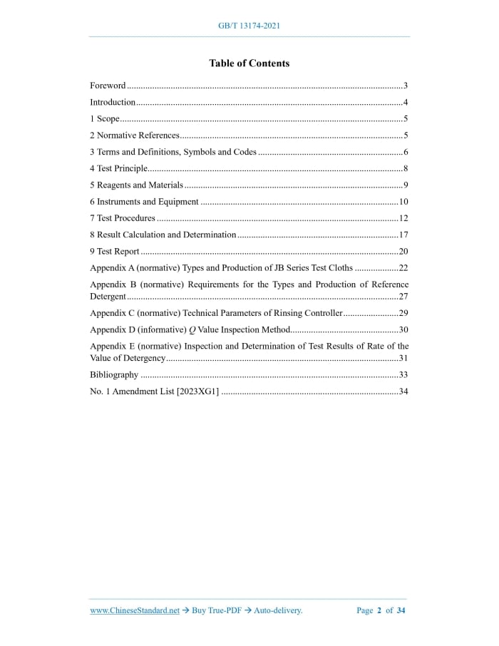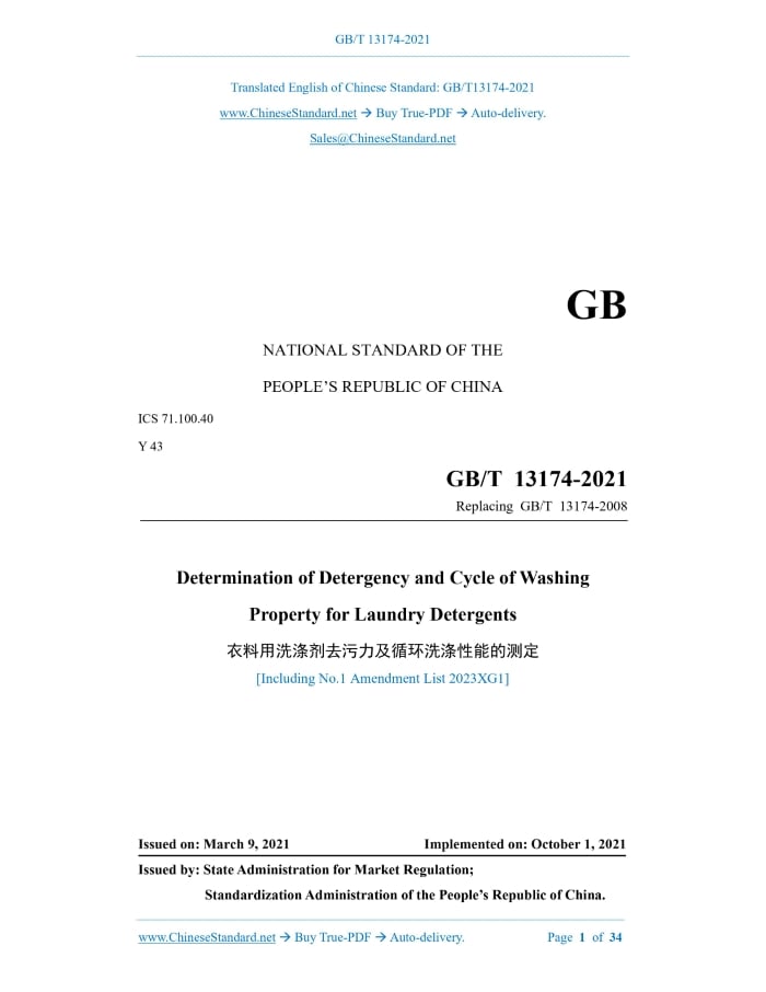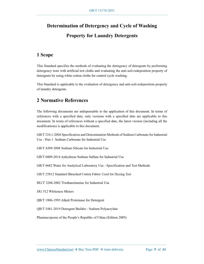 Similar standardsGB/T 13174-2021: Determination of detergency and cycle of washing property for laundry detergents---This is an excerpt. Full copy of true-PDF in English version (including equations, symbols, images, flow-chart, tables, and figures etc.), auto-downloaded/delivered in 9 seconds, can be purchased online: https://www.ChineseStandard.net/PDF.aspx/GBT13174-2021GB NATIONAL STANDARD OF THE PEOPLE’S REPUBLIC OF CHINA ICS 71.100.40 Y 43 Replacing GB/T 13174-2008 Determination of Detergency and Cycle of Washing Property for Laundry Detergents [Including No.1 Amendment List 2023XG1] Issued on. MARCH 9, 2021 Implemented on. OCTOBER 1, 2021 Issued by. State Administration for Market Regulation; Standardization Administration of the People’s Republic of China. Table of ContentsForeword... 3 Introduction... 4 1 Scope... 5 2 Normative References... 5 3 Terms and Definitions, Symbols and Codes... 6 4 Test Principle... 8 5 Reagents and Materials... 9 6 Instruments and Equipment... 10 7 Test Procedures... 12 8 Result Calculation and Determination... 17 9 Test Report... 20 Appendix A (normative) Types and Production of JB Series Test Cloths... 22 Appendix B (normative) Requirements for the Types and Production of Reference Detergent... 27 Appendix C (normative) Technical Parameters of Rinsing Controller... 29 Appendix D (informative) Q Value Inspection Method... 30 Appendix E (normative) Inspection and Determination of Test Results of Rate of the Value of Detergency... 31 Bibliography... 33 No. 1 Amendment List [2023XG1]... 341 ScopeThis Standard specifies the methods of evaluating the detergency of detergents by performing detergency tests with artificial test cloths and evaluating the anti-soil-redeposition property of detergents by using white cotton cloths for control cycle washing. This Standard is applicable to the evaluation of detergency and anti-soil-redeposition property of laundry detergents.2 Normative ReferencesThe following documents are indispensable to the application of this document. In terms of references with a specified date, only versions with a specified date are applicable to this document. In terms of references without a specified date, the latest version (including all the modifications) is applicable to this document. GB/T 210.1-2004 Specification and Determination Methods of Sodium Carbonate for Industrial Use - Part 1.Sodium Carbonate for Industrial Use GB/T 4209-2008 Sodium Silicate for Industrial Use GB/T 6009-2014 Anhydrous Sodium Sulfate for Industrial Use GB/T 6682 Water for Analytical Laboratory Use - Specification and Test Methods GB/T 25812 Standard Bleached Cotton Fabric Used for Dyeing Test HG/T 3268-2002 Triethanolamine for Industrial Use JJG 512 Whiteness Meters QB/T 1806-1993 Alkali Proteinase for Detergent QB/T 5481-2019 Detergent Builder - Sodium Polyacrylate Pharmacopoeia of the People’s Republic of China (Edition 2005)3 Terms and Definitions, Symbols and Codes3.1 Terms and Definitions The following terms and definitions are applicable to this document. 3.1.1 test cloths Test cloths refer to artificially soiled cloths made by treating the original white cotton cloths with the specified types of stains through a certain procedure, which are used to determine the ability of detergents to remove such stains. 3.1.2 pieces of test cloths Pieces of test cloths refer to soiled cloths cut into a circle or square of a certain size as required, and used for the detergency test. 3.1.3 whiteness index Whiteness index refers to the reflectance of the test cloths or pieces of test cloths to the light wave at the specified wavelength, which shall be read at 457 nm with a whiteness meter. 3.1.4 whiteness index before washing Whiteness index before washing refers to the whiteness index of the pieces of test cloths before washing with detergent. 3.1.5 whiteness index after washing Whiteness index after washing refers to the whiteness index of the pieces of test cloths after washing with detergent. 3.1.6 difference of the whiteness index Difference of the whiteness index refers to the difference between the whiteness index after washing and the whiteness index before washing.4 Test PrincipleIn the detergency test machine, in accordance with the specified temperature and washing time, use water with a certain hardness to prepare a detergent solution with a certain concentration; wash the various types of soiled test pieces, and use a whiteness meter to determine the whiteness index of the pieces of test cloths before and after washing at the selected wavelength. Take the whiteness difference of the pieces of test cloths to evaluate the detergency of the detergent.5 Reagents and MaterialsUnless it is otherwise specified, only reagents that are confirmed as analytically pure and Grade- 3 water that complies with GB/T 6682 are used in the analysis. 5.1 Calcium chloride (CaCl2). NOTE. calcium chloride with a certain hydration number may also be used, but it needs to be converted in accordance with the usage of CaCl2 specified in 7.1 during specific use. 5.4 Reference detergents. The formulation and preparation methods of the reference detergents are listed in Appendix B. The reference detergents are processed and produced with raw materials of uniform specifications and processes, and if necessary, uniformly customized. During use, in accordance with the requirements of this Standard or product standards, prepare them to the specified concentration. 5.5 Reference proteases Specifications of reference proteases. the reference proteases should be produced with raw materials of uniform specifications and processes, requiring uniform activity and a clarified shelf life. For the technical requirements of the product, see the superior product index in QB/T 1806-1993.In addition, carry out necessary identification of enzyme activity.6 Instruments and Equipment6.1 Vertical-type Detergency Test Machine 6.2 Whiteness Meter Fluorescent whiteness meter. The illumination and 