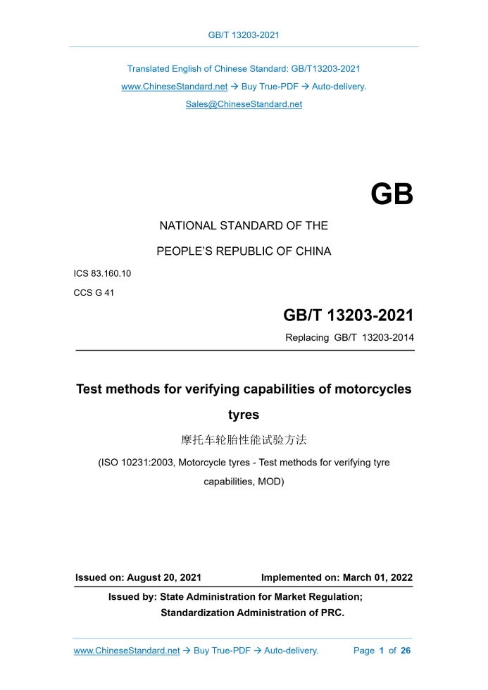 GB/T 13203-2021: Test methods for verifying capabilities of motorcycle tyres Delivery: 9 seconds. True-PDF full-copy in English & invoice will be downloaded + auto-delivered via email. See step-by-step procedure Status: Valid GB/T 13203: Historical versions